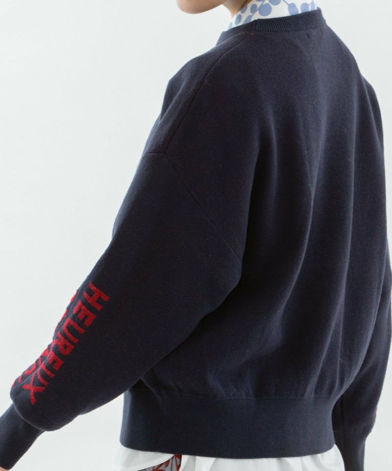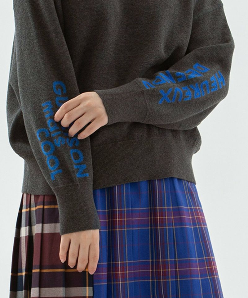 ゆるいサイズ感のスエット風ニット。両袖にそれぞれロゴを入れたクールなトップスです。表側はコットン、裏側がキッドモヘア混のダブル編みで、起毛スエットのような暖かさがありながら春先まで長く着られるアイテムです。裏側の糸が表に出るダブルジャガード編みで、柄部分は少しふんわりとした見え方になっています。