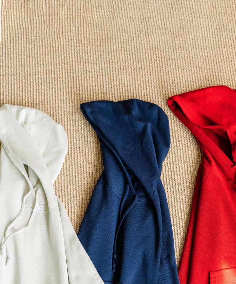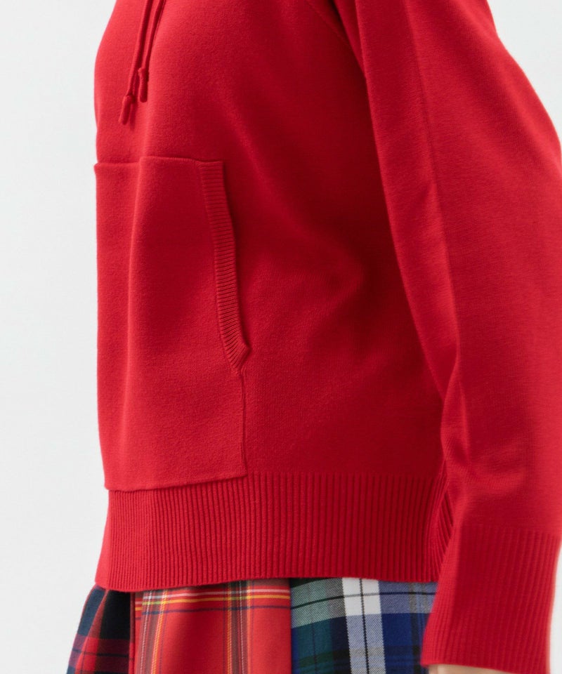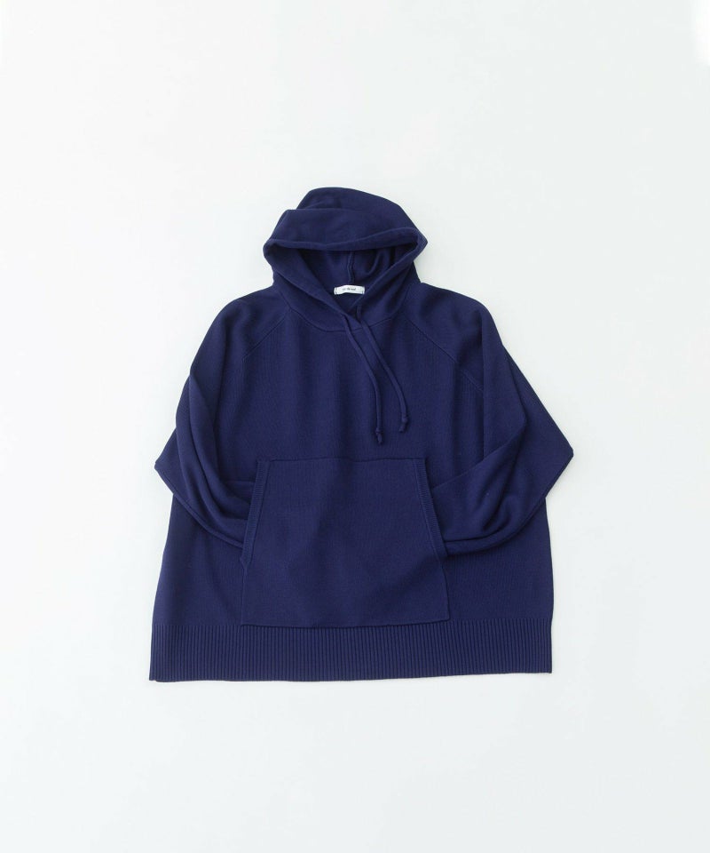 12ゲージの総針編みで仕立てた、レーヨンポリエステル素材のフードニット。トレーナーのように気軽に切られつつ、カジュアルすぎないのがポイント。しっかりとした張り感と目の詰まった編地が上品で、毛玉になりにくく扱いもイージーなのがうれしい。