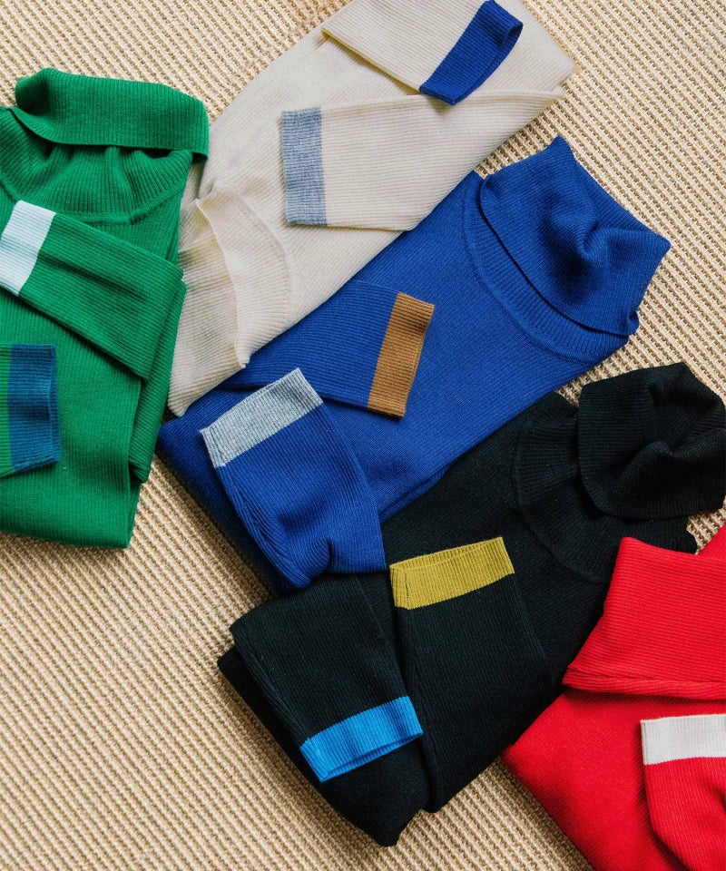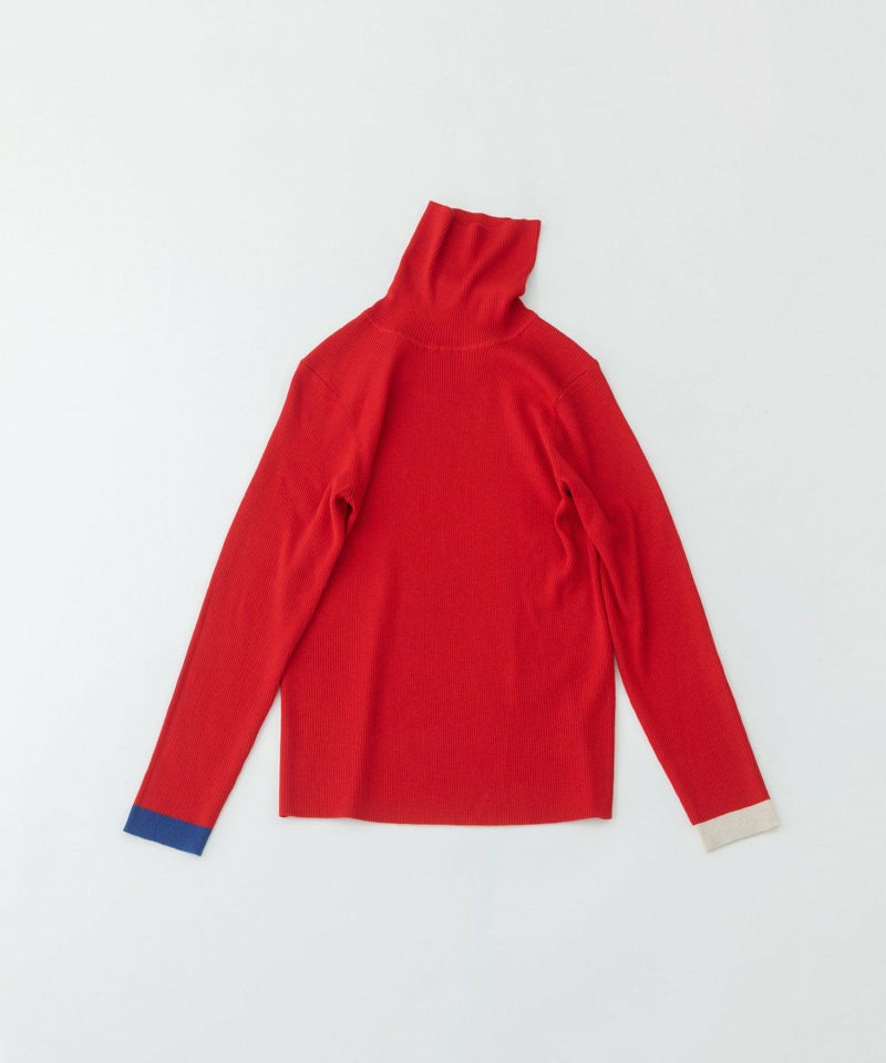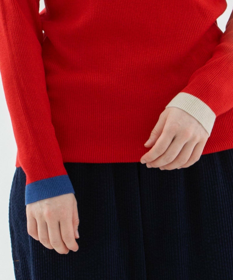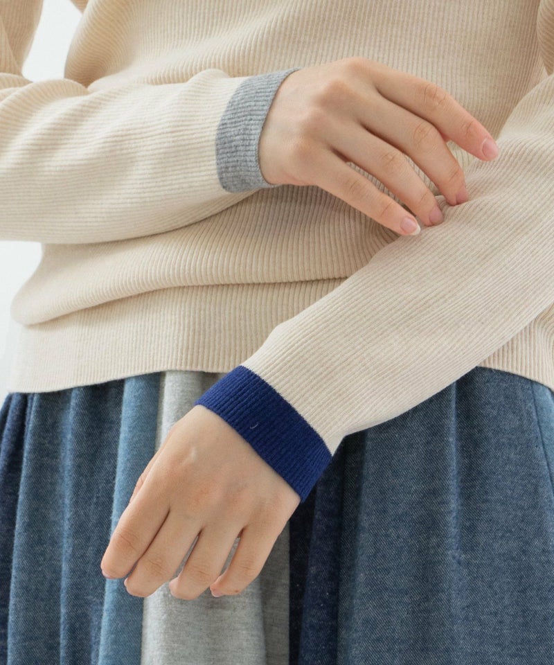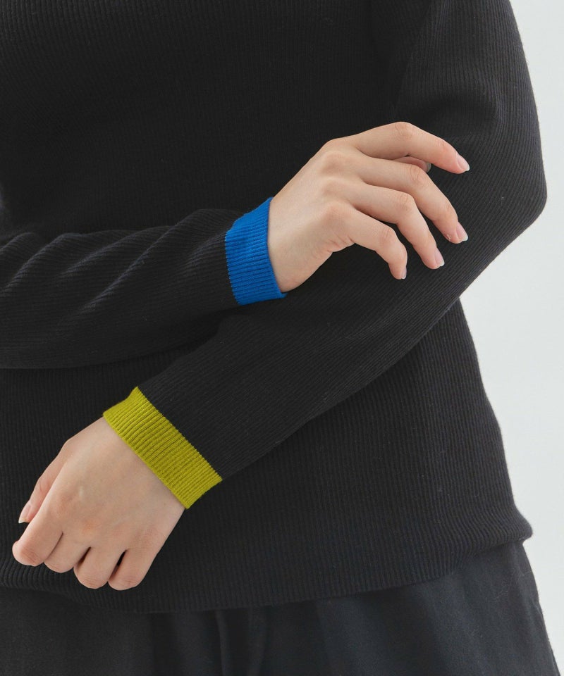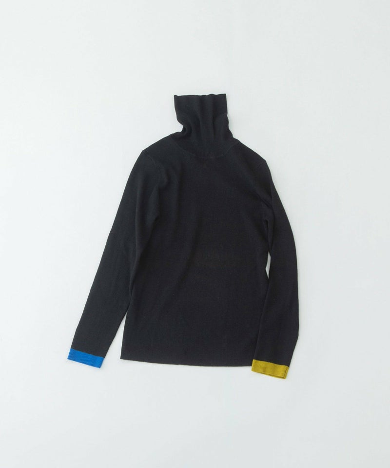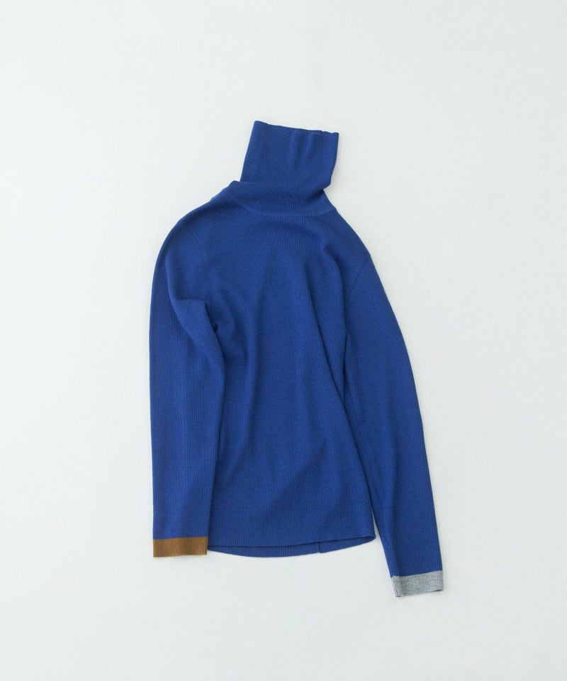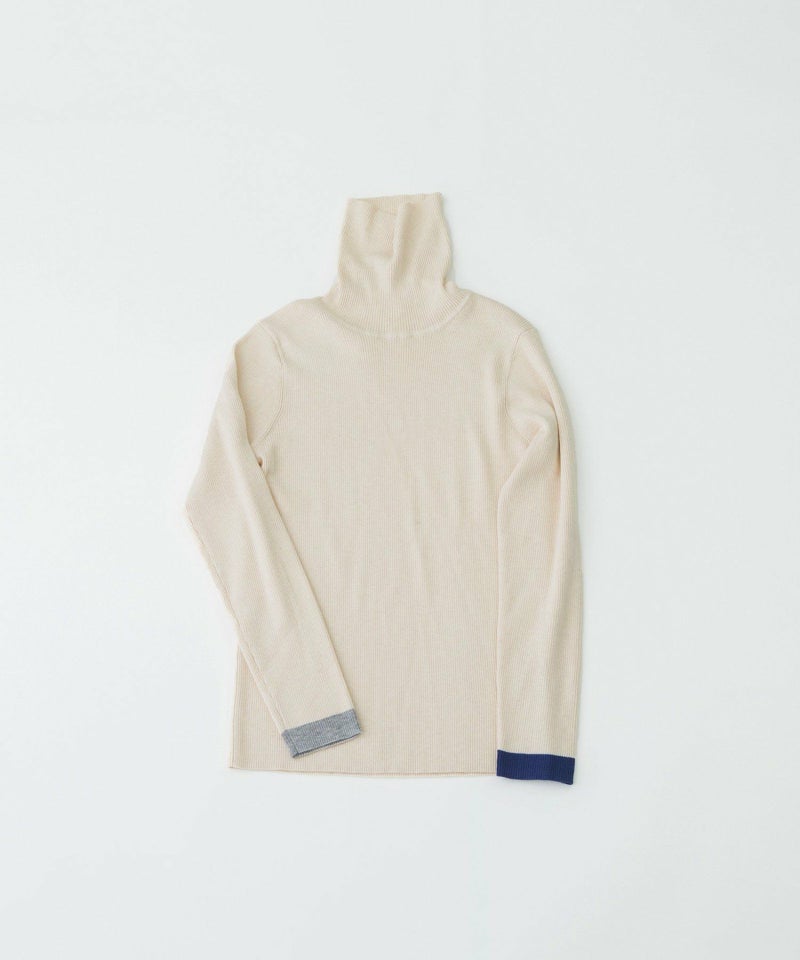 左右の袖口にそれぞれ違う色で配色ラインを入れた、やわらかくて暖かいリブタートル。長めの袖をくしゅっとさせて着ると、冬のインナーとして鮮度ある印象に。薄手でやわらかく、ウールをわずかにブレンドしたことでちくちくしにくい快適な着心地。毛玉になりにくい糸を使っているため、デイリーに頼れる一枚です。