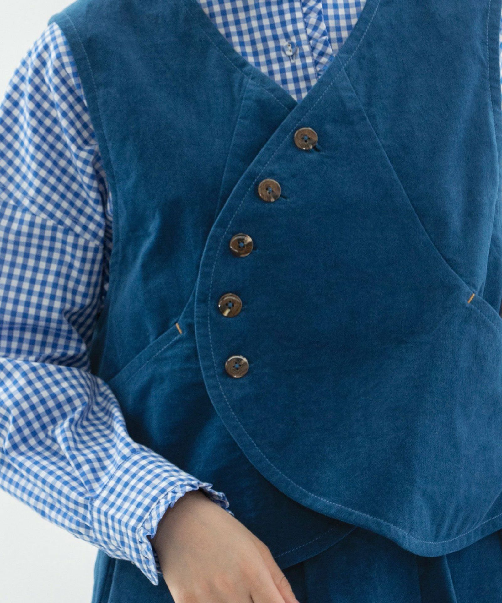 別珍素材のベスト。起毛の微光沢で上品なカジュアルを演出できる1枚です。洗いをかけることで普段使いできる雰囲気に仕上がりました。ストレッチ入りで動きやすく、しっかりとした生地が特徴的。ヴィンテージ風の丸みのある打ち合わせがデザインポイント。両サイドポケットあり。