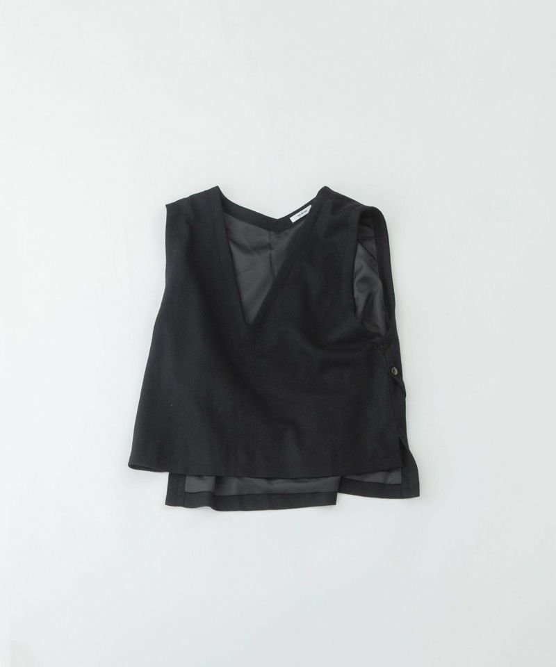 ウール100%の圧縮ニット天竺のベスト。ふんわり軽くてやわらかく暖かく、カジュアルに着られるのにきちんと感をプラスできるアイテムです。深めのVネックデザインで後ろ下りのシルエット。両サイドにスリットあり。