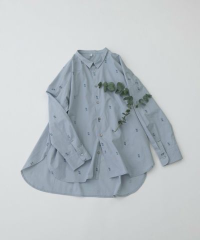 やわらかなブロード素材に温かみのあるフロッキープリントを施したオリジナル生地のシャツ。スワンが水面に映ったように上下に並んだ、繊細で印象的な柄が目を惹きます。ごく華奢で小さめの衿と、ワイドで後ろ下がりのシルエットが特徴。前後差をつけることで、すっきりとした前身頃と、ふんわり広がる後ろ姿のバランスを楽しめます。ナチュラルな貝ボタンや、下前中心に施した配色ステッチなど、細部にもこだわりが光る一枚です。