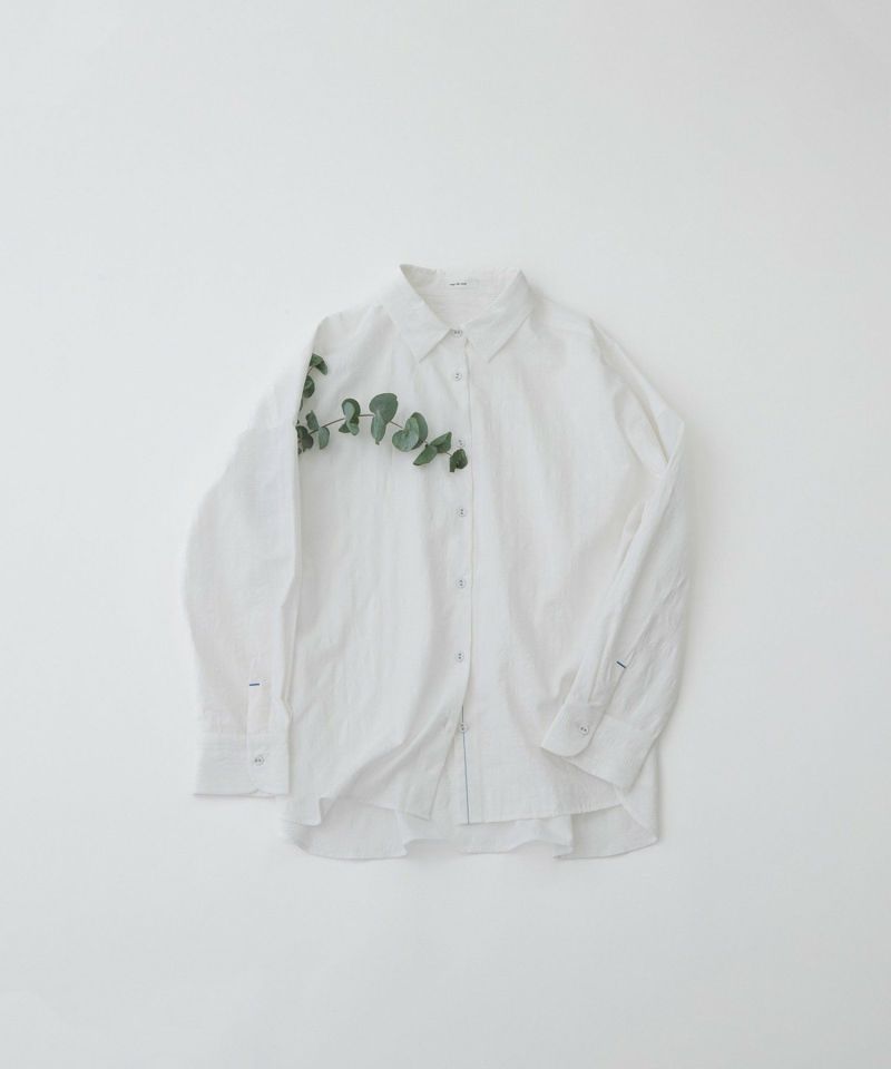 異素材を組み合わせたオーバーサイズシャツ。ゆったりワイドシルエットながら、細めの袖できちんと見え、メンズライクな衿の切り替えが凛々しい雰囲気です。衿切り替えや、前左袖カフス、背面のタブに別布をあしらってさりげないアクセントに。オフホワイトはワッフル織のドビーと格子ドビー、ダークグリーンは大きさの違うギンガムチェック合わせ、ブルーはストライプと小さなドット、ネイビーは大きさの違うドットの組み合わせ。色によって表情の違う4色展開です。後ろがやや長めのデザインで、くるみボタンがナチュラルな印象に。開けた時にちらりと見える配色ステッチもポイントです。