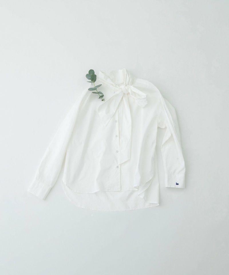 マニッシュなテーラードにあわせたい、レディな雰囲気を取り入れられるトレンドのボータイシャツ。甘すぎないシルエットで、脇にずらした襟がモード感をプラス。真ん中で結んだり、ラフに片リボンで長く垂らしたり、後ろ中心にまわしたりとお好みでアレンジができます。太目で大きなボータイがポイント。左カフスには小さなスワン刺繍を入れてアクセントに。後ろが長めの前後差でデザインです。