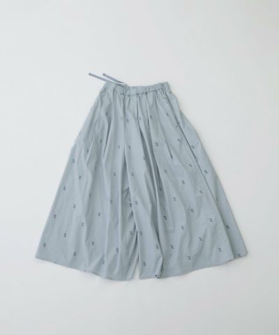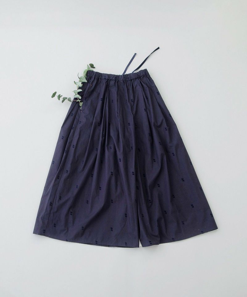 やわらかなブロード素材に温かみのあるフロッキープリントを施したオリジナル生地のキュロット。スワンが水面に映ったように上下に並んだ、繊細で印象的な柄が目を惹きます。スカート見えしながら活動しやすい人気のキュロット。しっかり長めの着丈に、ウエストはゴム仕様でリラックスした履き心地です。両サイドのポケット口にはスカラップステッチが入っています。