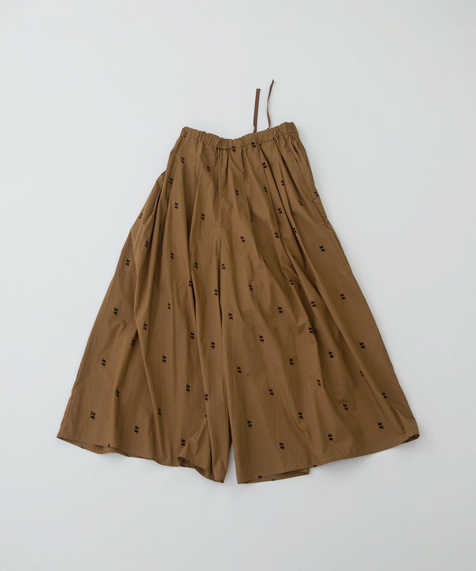 やわらかなブロード素材に温かみのあるフロッキープリントを施したオリジナル生地のキュロット。スワンが水面に映ったように上下に並んだ、繊細で印象的な柄が目を惹きます。スカート見えしながら活動しやすい人気のキュロット。しっかり長めの着丈に、ウエストはゴム仕様でリラックスした履き心地です。両サイドのポケット口にはスカラップステッチが入っています。