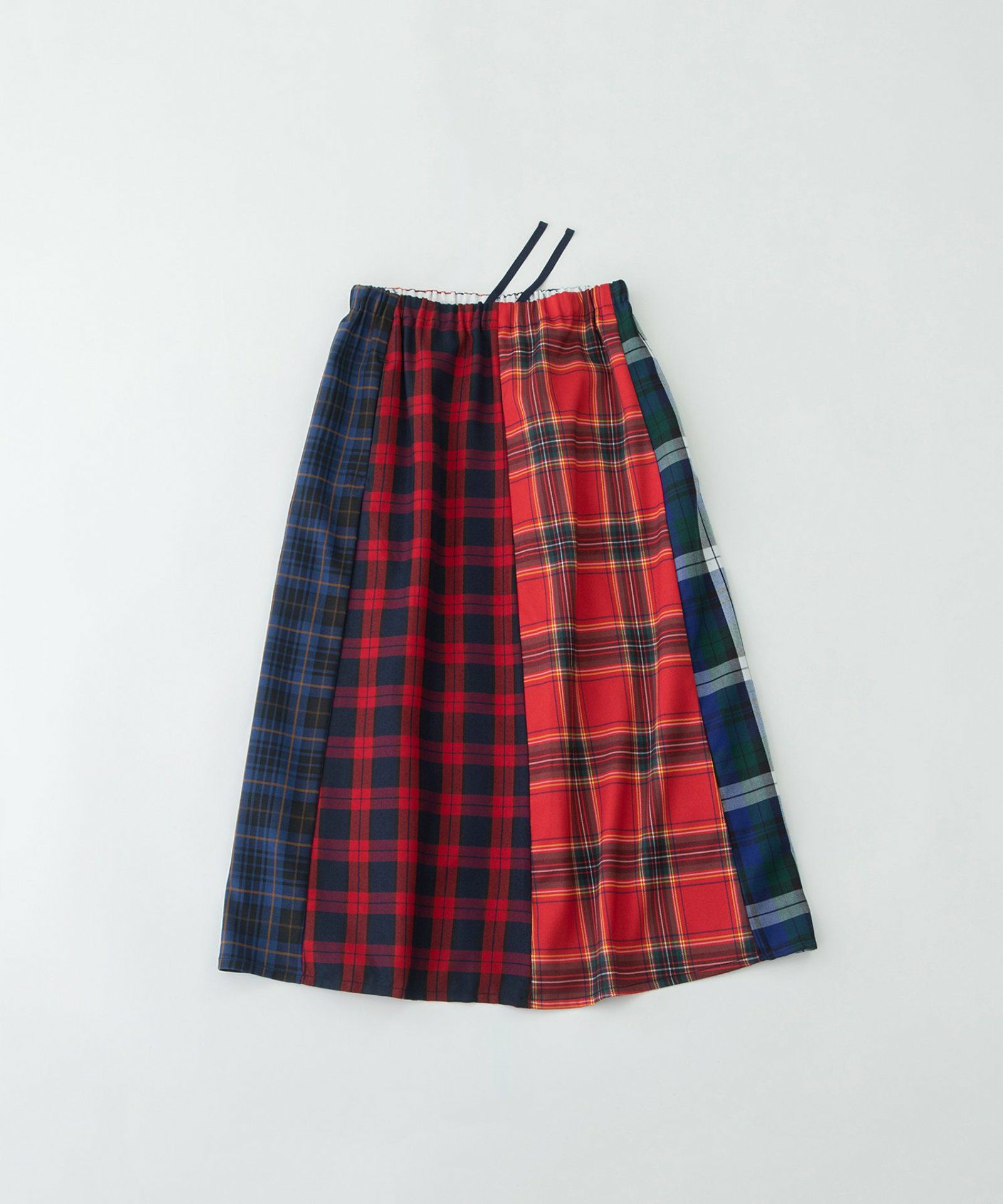 4種類のチェックを組み合わせたスカート。6枚はぎのフレアスカートで、どこを前にしても履いて頂けます。ポリエステルレーヨンで扱いやすい生地を使いました。カジュアルにもきれいめにも着用できて、ニットにもスウェットにも合わせやすいアイテムです。ウエストはゴム仕様で内紐つき。両サイドポケットあり。