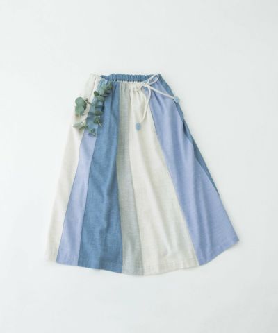 4色を組み合わせたフレアスカート。やわらかく肌触りの良い起毛素材で仕立てました。やさしい色展開でナチュラルな甘さが漂います。お好みでどこを前にしても履いて頂けます。ウエストはゴム仕様、共紐の先についた六角モチーフもポイントです。両サイドポケットつき。