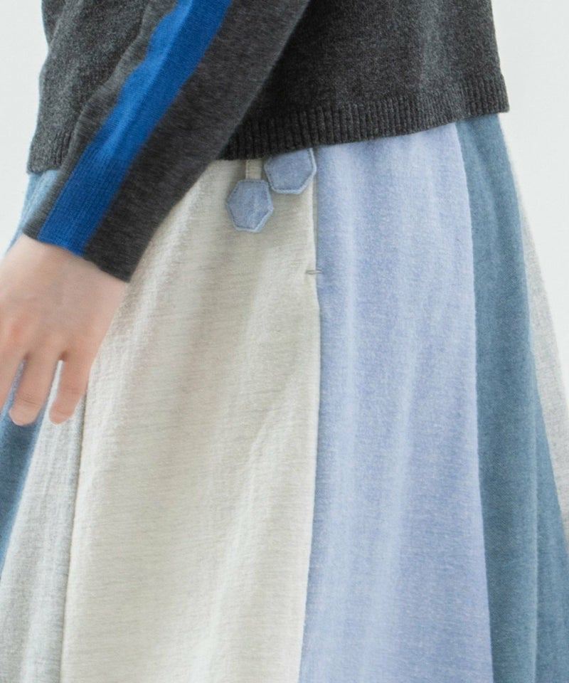 4色を組み合わせたフレアスカート。やわらかく肌触りの良い起毛素材で仕立てました。やさしい色展開でナチュラルな甘さが漂います。お好みでどこを前にしても履いて頂けます。ウエストはゴム仕様、共紐の先についた六角モチーフもポイントです。両サイドポケットつき。