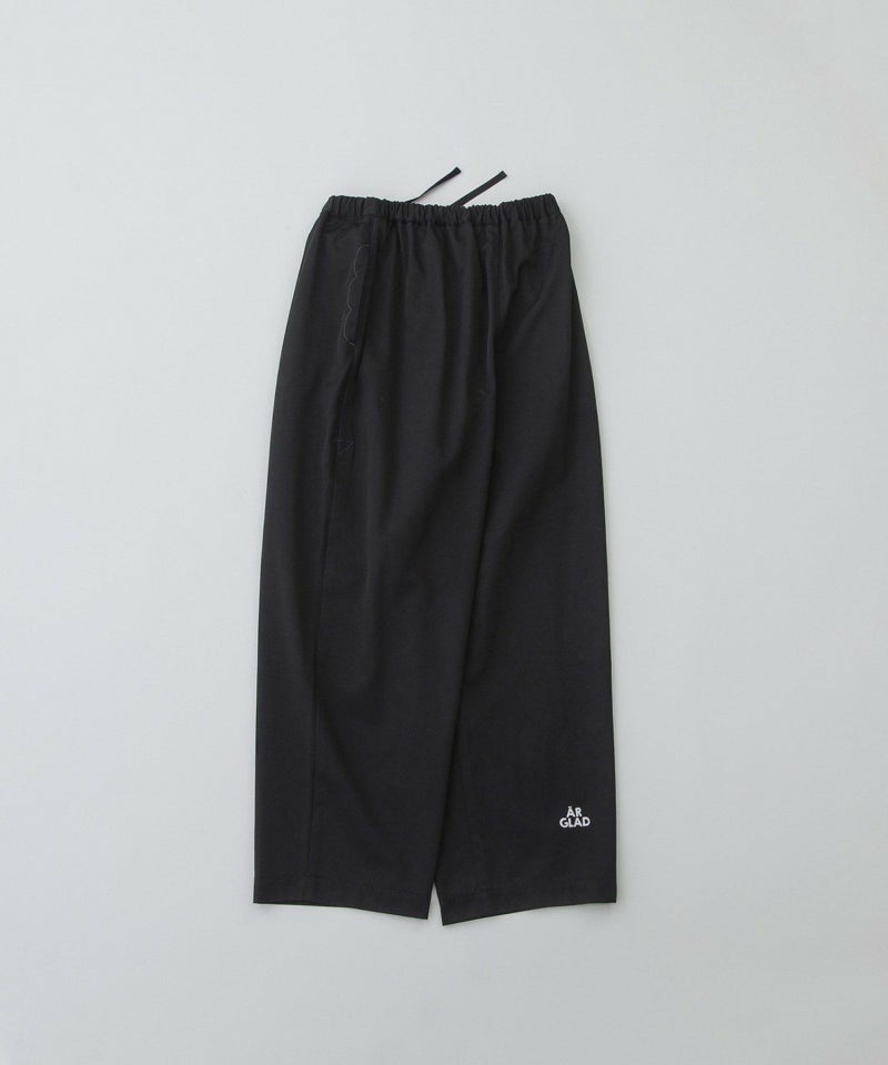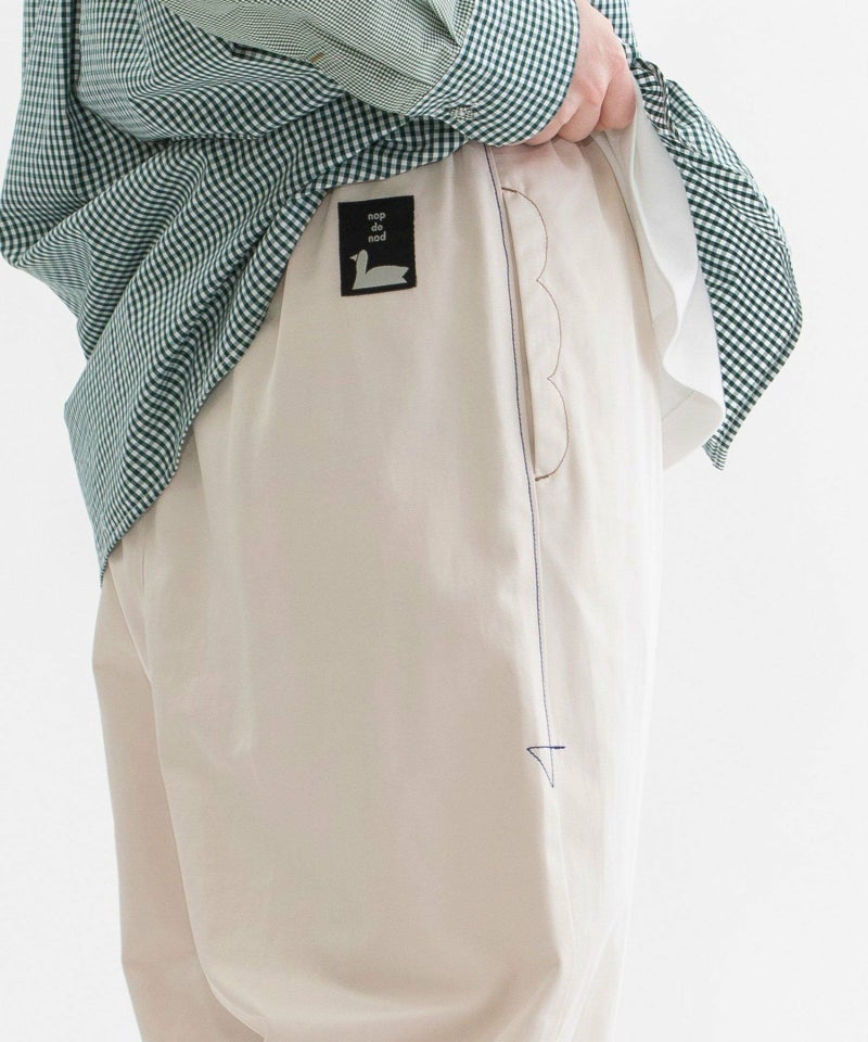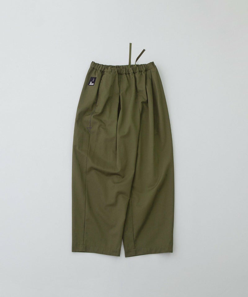 丸みのあるボリュームでカジュアルに楽しめるフルレングスパンツ。トレンチコートのような綺麗めな表面感のポリエステルコットンツイルを使用し、カジュアルすぎず上品に着こなせます。股上は深くリラックス感がありますが、高めの位置にボリュームをもたせた今どきシルエットでバランスよく決まります。右後ろ裾のロゴプリントがポイント。ウエストはゴム仕様で楽な履き心地。右後ろのスワンネームやサイドの配色三角ステッチ、両サイドポケットのスカラップステッチなどもさりげないアクセントを効かせています。
