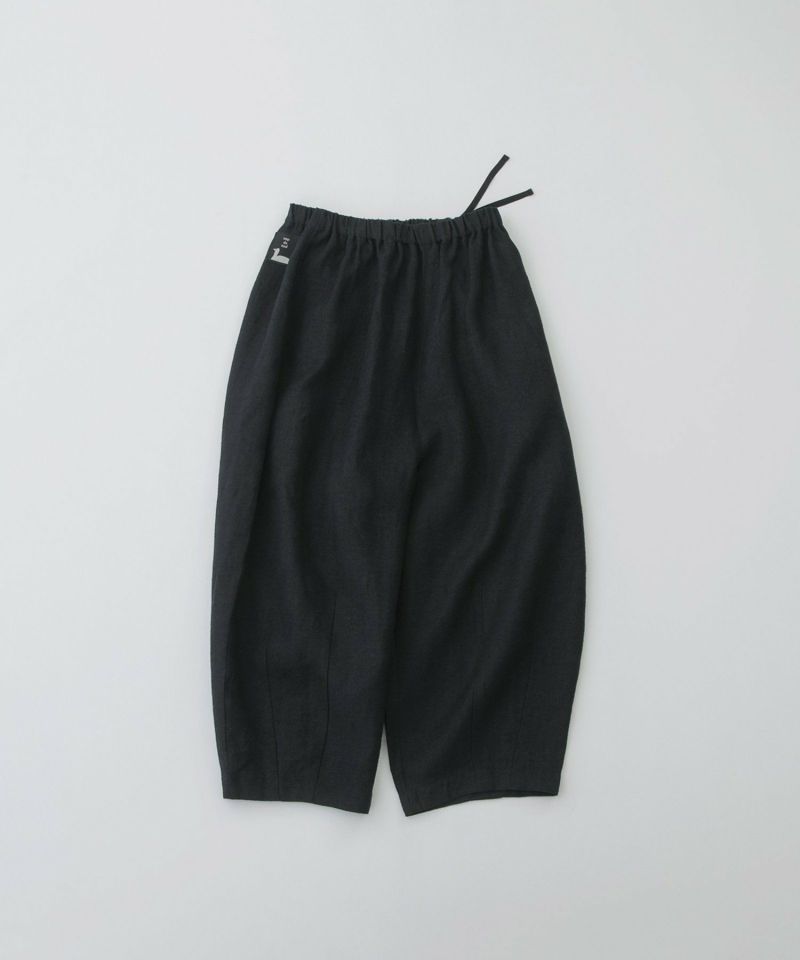 暖かみのある素材のきれいなテーパードラインの9分パンツ。股上が深くリラックスしたゆるさがありながら、高い位置にボリューム感を持たせているのでバランス良く着こなせます。ツイード見えする麻100%のリネンビエラ起毛を使用。ウエストはゴム仕様で、内紐つき。右後ろのスワンネームやサイドの配色三角ステッチ、両サイドポケットのスカラップステッチなどもさりげないアクセントを効かせています。