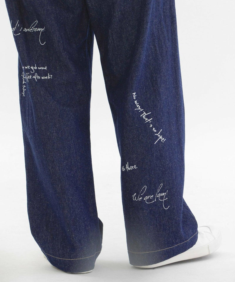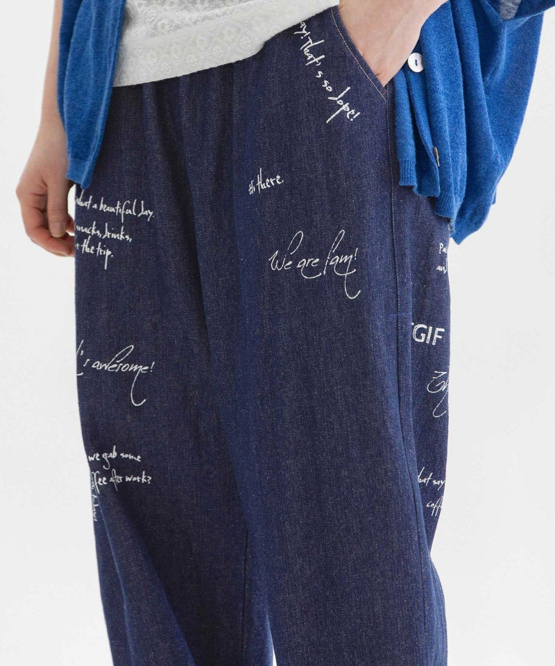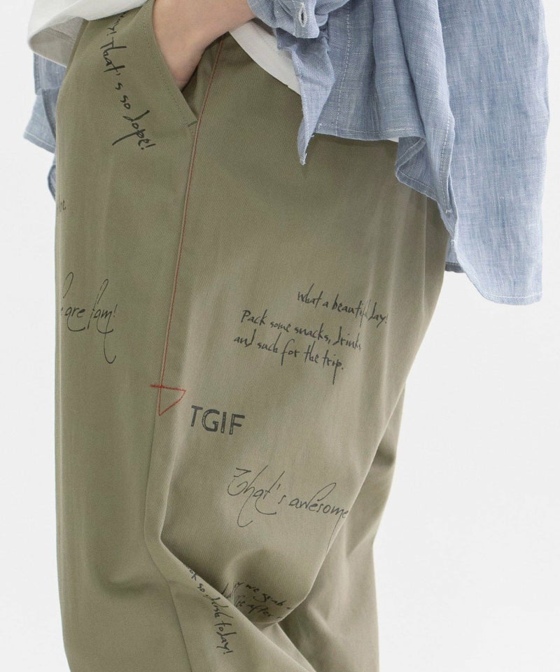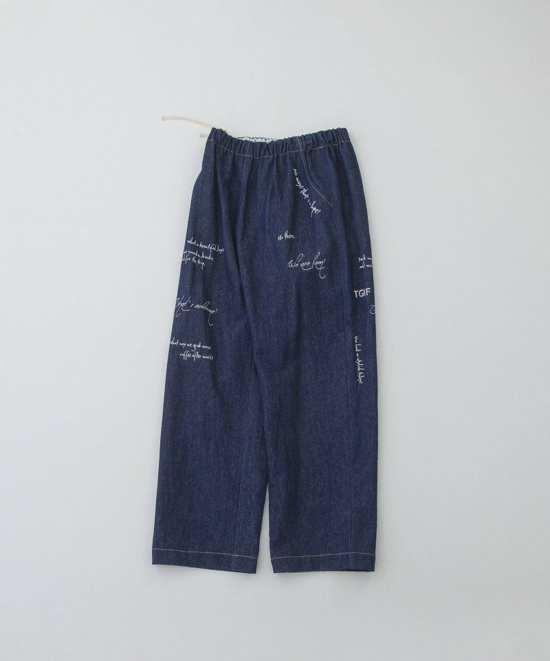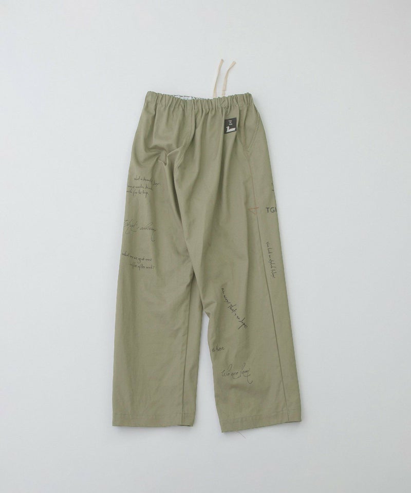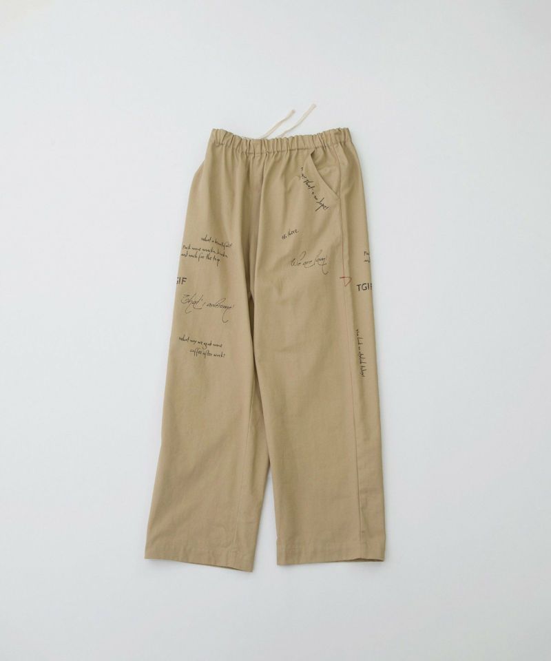メッセージのようなロゴを前後に入れたワークパンツ。しっかり厚めのツイルで仕立てたリラックスしたシルエットのフルレングスのストレートパンツです。サイドの配色にした三角ステッチがさりげないアクセント。ウエストは内紐つきでゴム仕様。両サイドポケットつき。ウエストの内側やポケットの中には、オリジナルロゴプリントの生地を使っています。