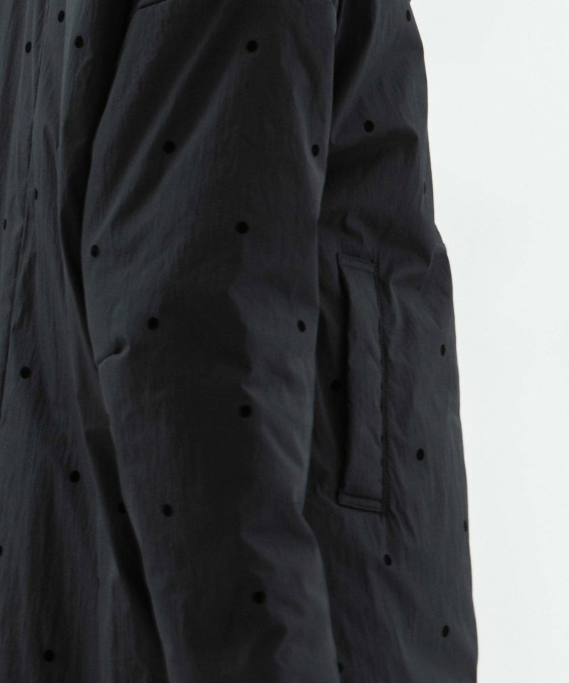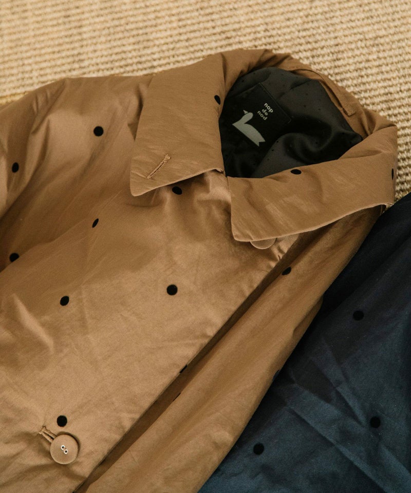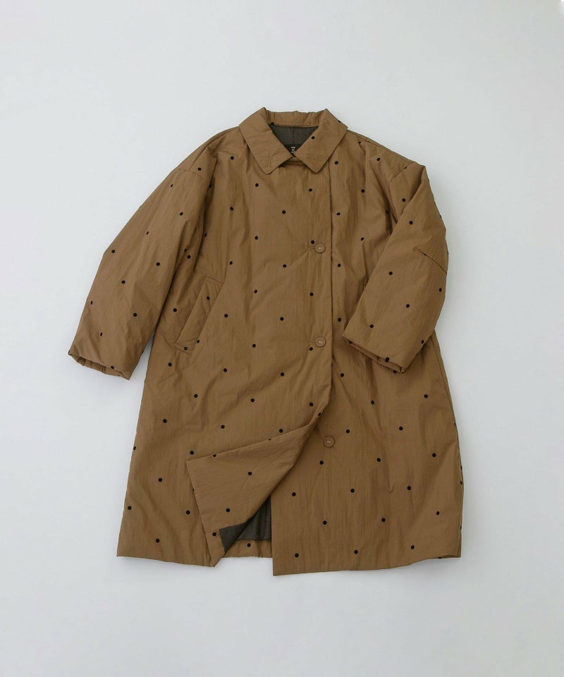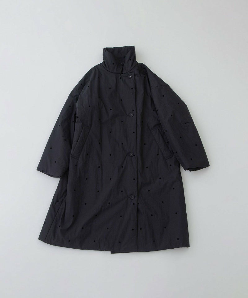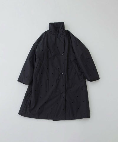 軽いコットンナイロン素材にフロッキードットプリントをのせた柔らかくて軽い中綿コート。カジュアルすぎず上品に着られれる防寒コートです。衿元をアレンジして、スタンドカラー、ステンカラー、テーラードと3wayで着用をお楽しみいただけます。袖口はゴムを入れてふんわりとした仕上がりに。ボタンは共くるみボタンになっています。