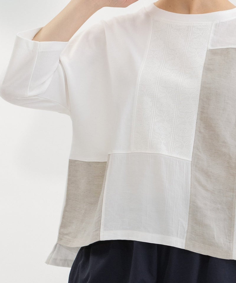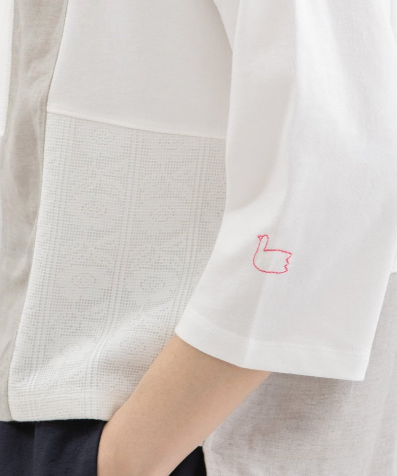 フロントに異素材のパッチワークを施した7分袖のTシャツ。良質なUSAコットンにリネンレーヨンやネットレースの同色系の布帛生地を組み合わせています。シルエットは程よくゆとりがありながらも、細めの袖ですっきりと着られるシルエット。Tシャツのラフさがありつつ、上品に見えます。左袖のピンクのスワン刺繍がアクセント。
