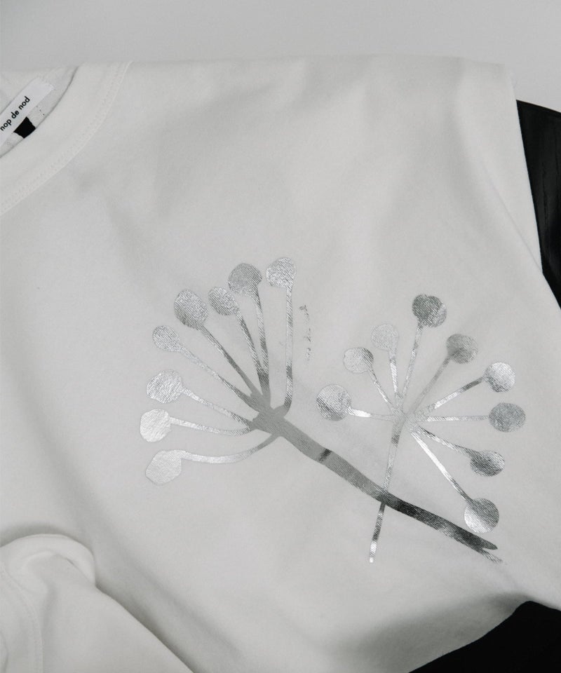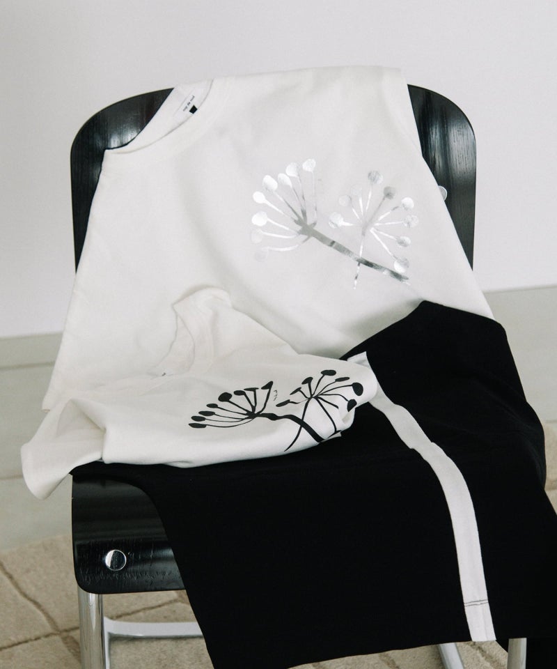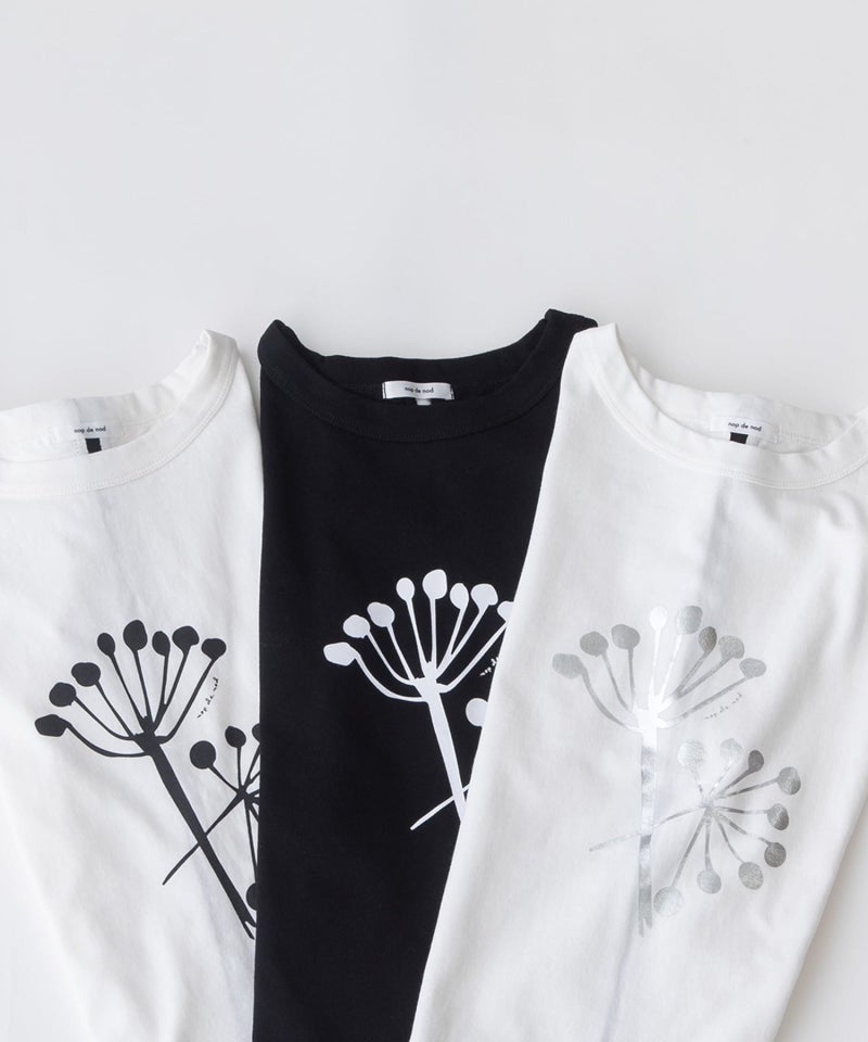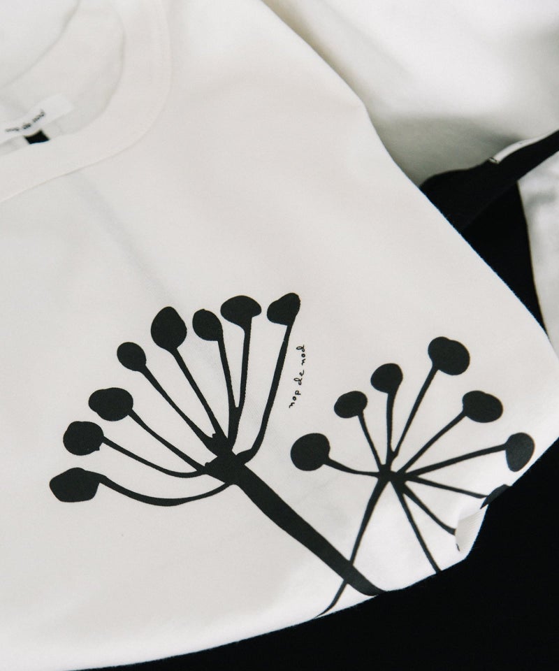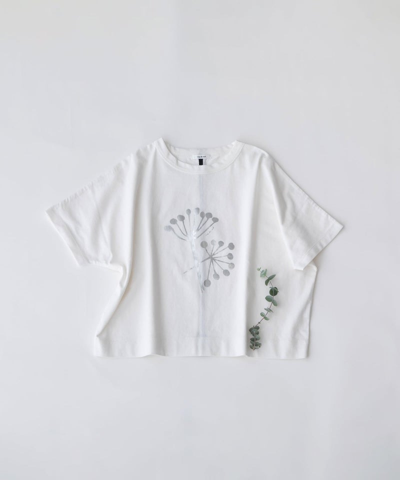 「よれない」「透けない」「長持ちする」良質なUSコットンに北欧の花の様なモチーフをプリントしました。身頃続きのドルマンスリーブでゆとりがあるジャスト丈です。後ろ中心を配色ライン切り替えのクラフト感も人気のポイント。