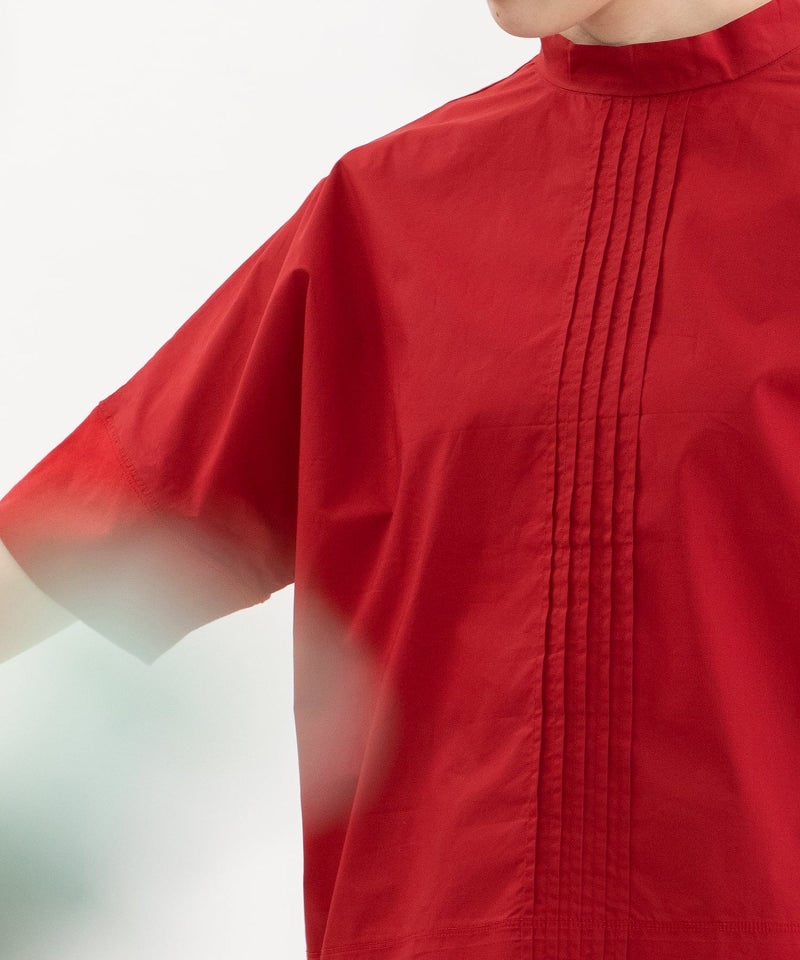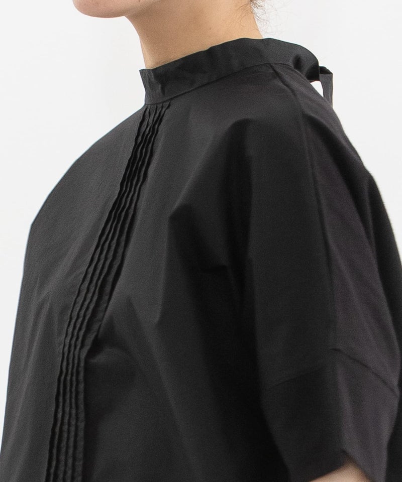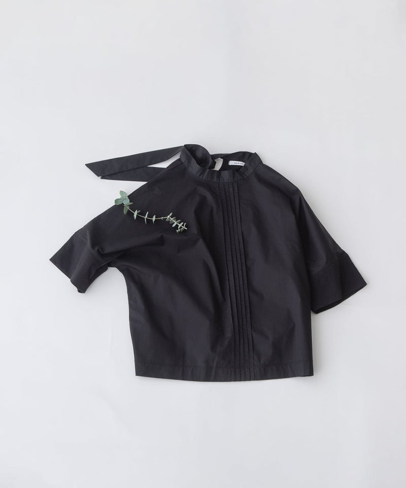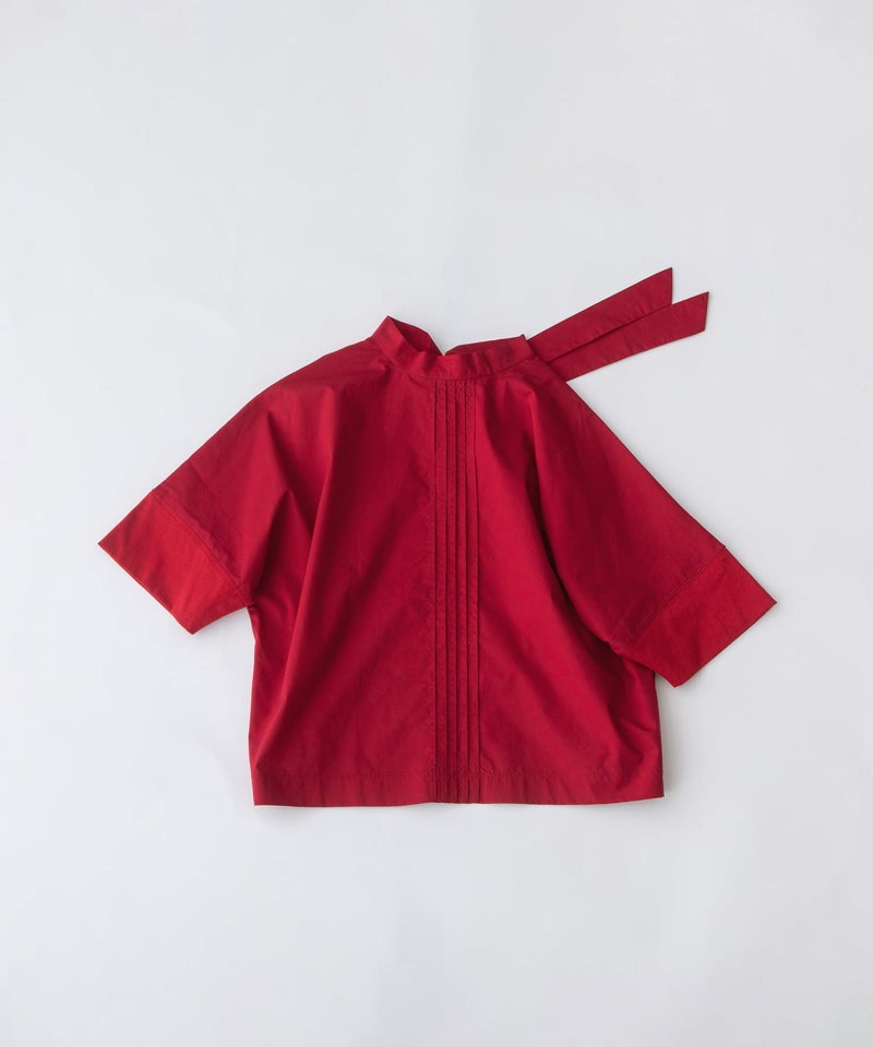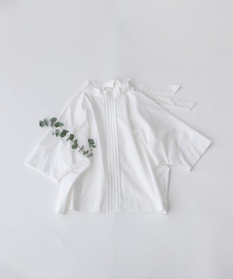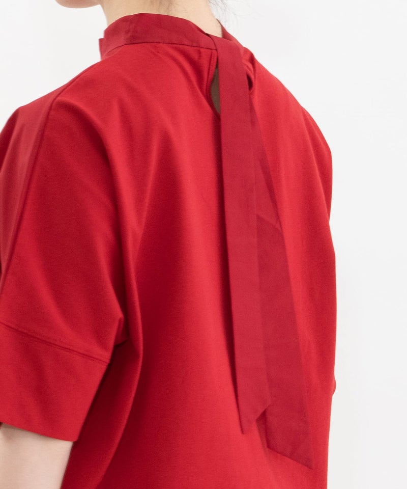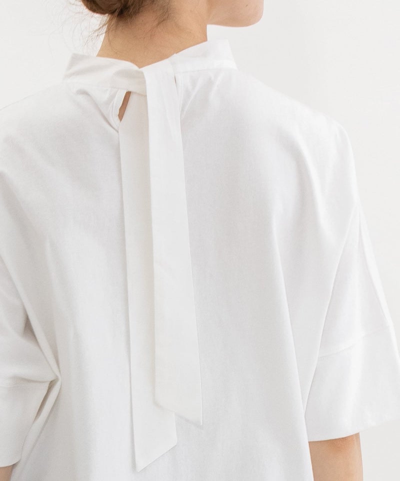 前身頃に布帛生地、後ろ身頃にはUSAコットンを使用したブラウス見えするデザイントップス。後ろボータイのトレンド感ある仕様で、リボン結びはもちろんラフに結んで垂らす着こなしもおすすめです。身頃続きのドルマンスリーブで、ゆとりがありながら品よく着られる人気のシルエット。袖口はカットソー素材で、折り返しも可能です。ラフな着心地と、ブラウスのようなきちんと感を兼ね備えた一枚です。