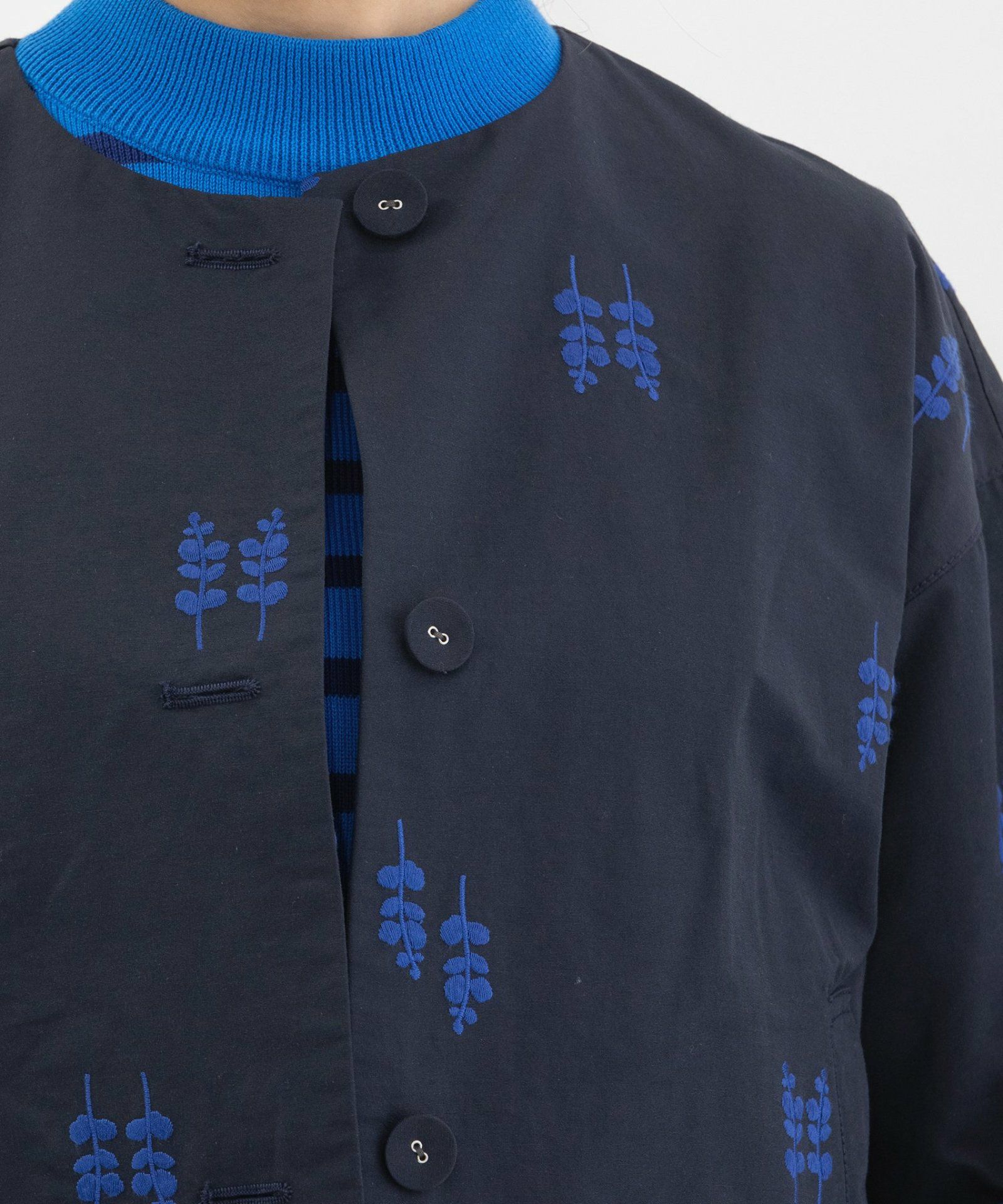 軽い綿ナイロンのグログラン生地に、ユーカリ柄の刺繍を施したオリジナル生地のノーカラージャケット。裏地なしの軽やかな仕立てで、縫い代はパイピング始末を施しています。共くるみボタンを使用し、両サイドポケットつきです。