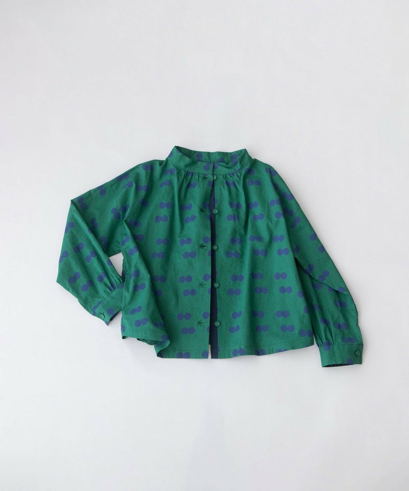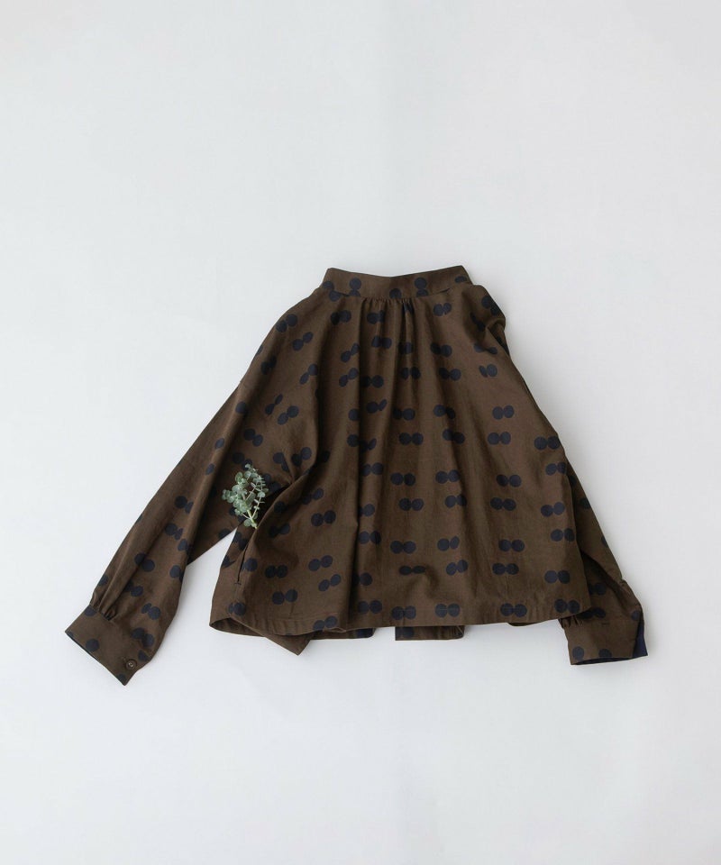 ドットを二つ並べたレトロな雰囲気のオリジナル生地で仕立てたブラウス。ざらっとしたナチュラルな風合いの軽いリネンコットン生地で、少し太めなスタンドカラーの衿ぐりに少しギャザーを入れて優しい印象にしました。前後どちらでも着用を楽しめる2way仕様です。クラシカルな短めの9分袖で、共くるみボタンを使用しています。両サイドにポケットあり。