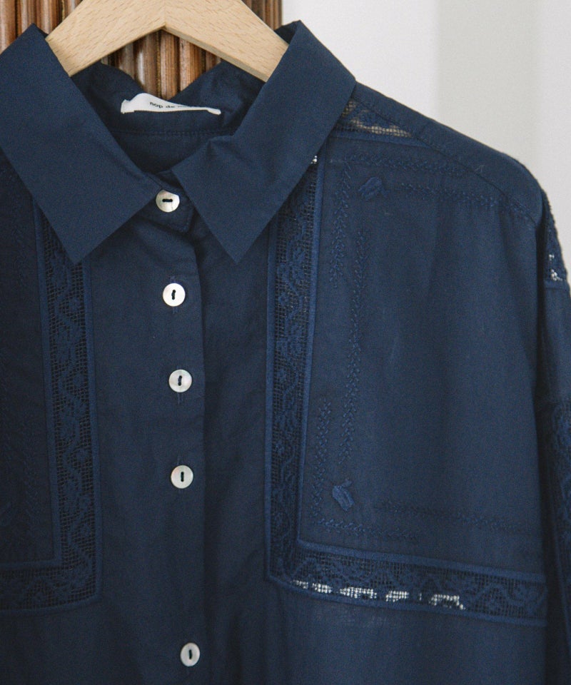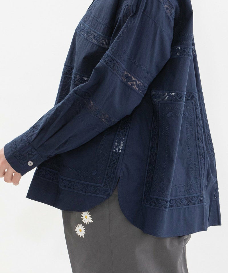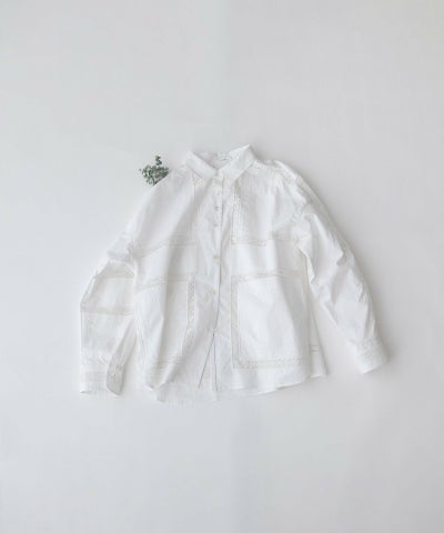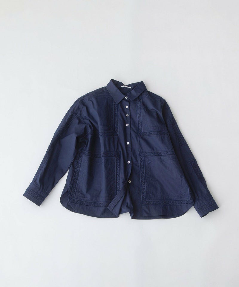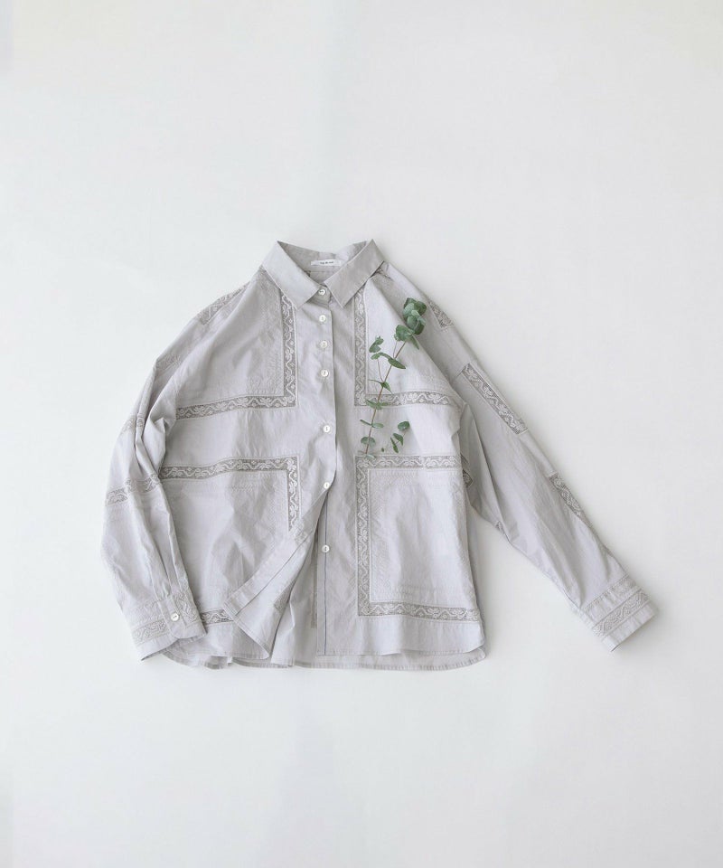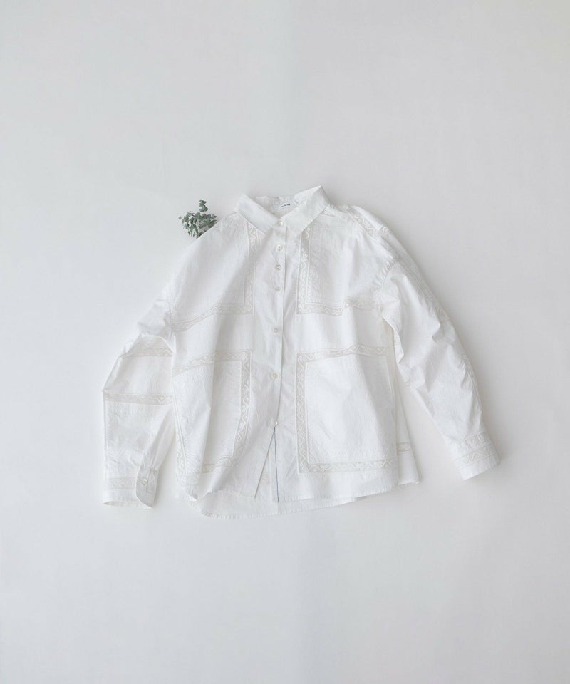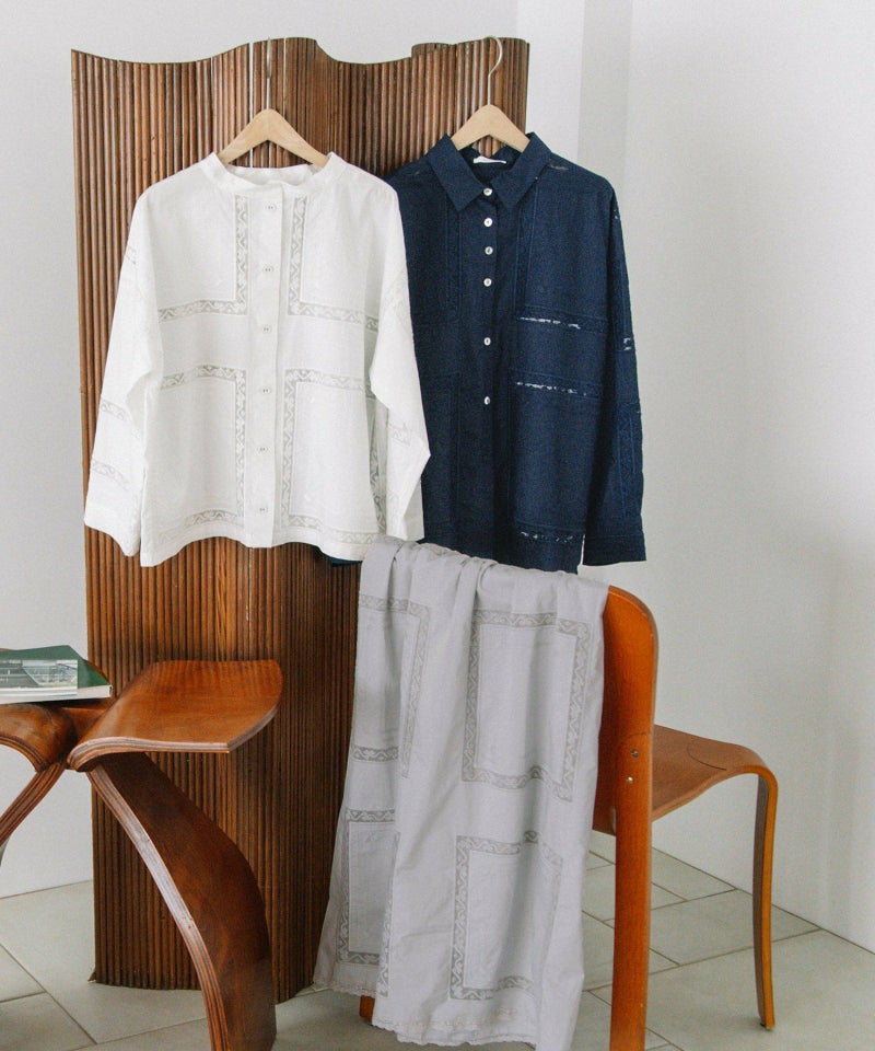 繊細なスワトー刺繍のハンカチをモチーフに、スクエア状の刺繍を並べたオリジナルクロスが印象的なシャツ。パリッとしたハリ感のあるタイプライター素材でナチュラルになりすぎず、程よい甘さのあるメンズライクなシャツです。フルオープンでばさっと羽織るのもおすすめ。開けた時にちらりと見える配色ステッチもさりげないポイントです。