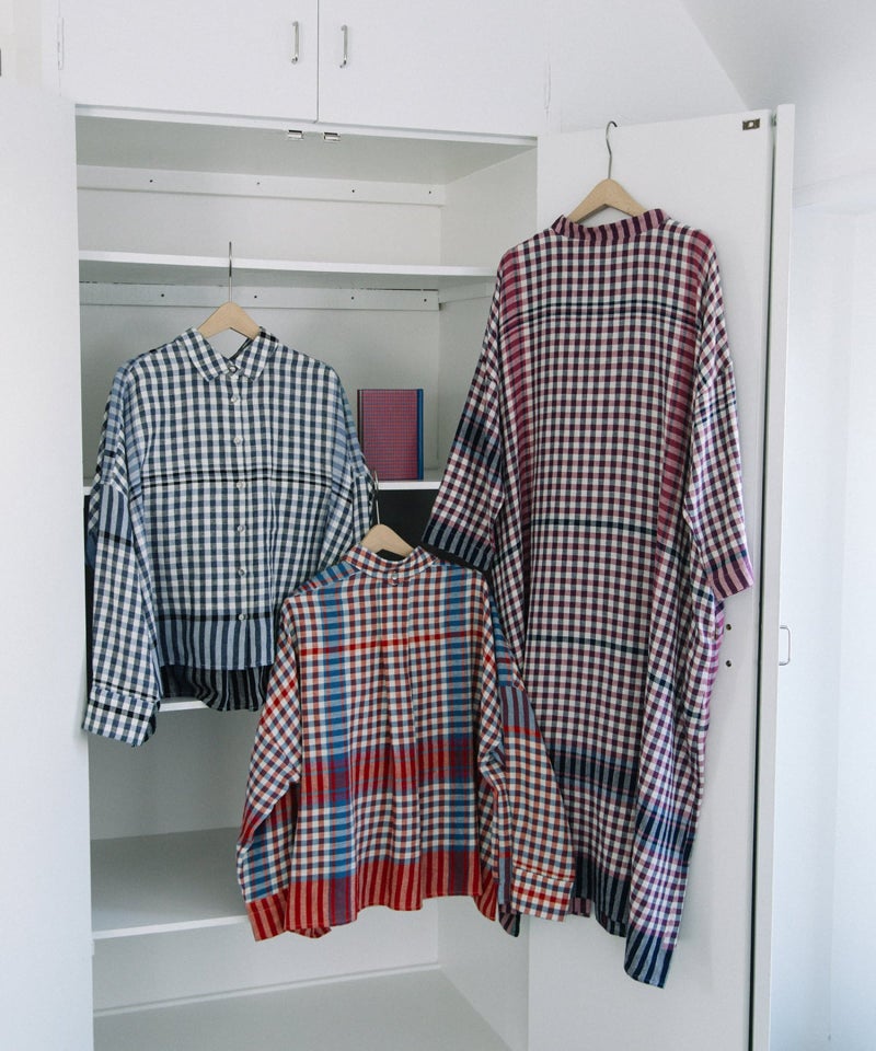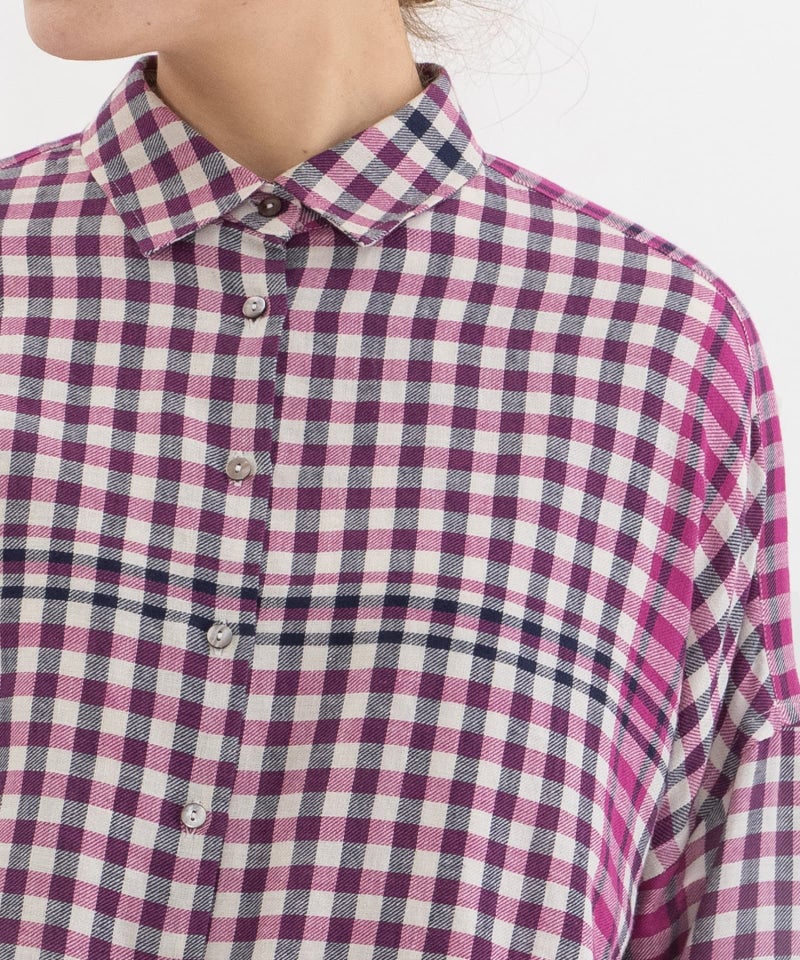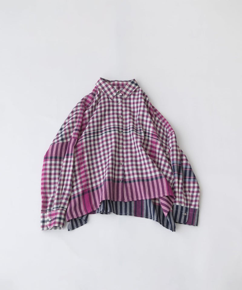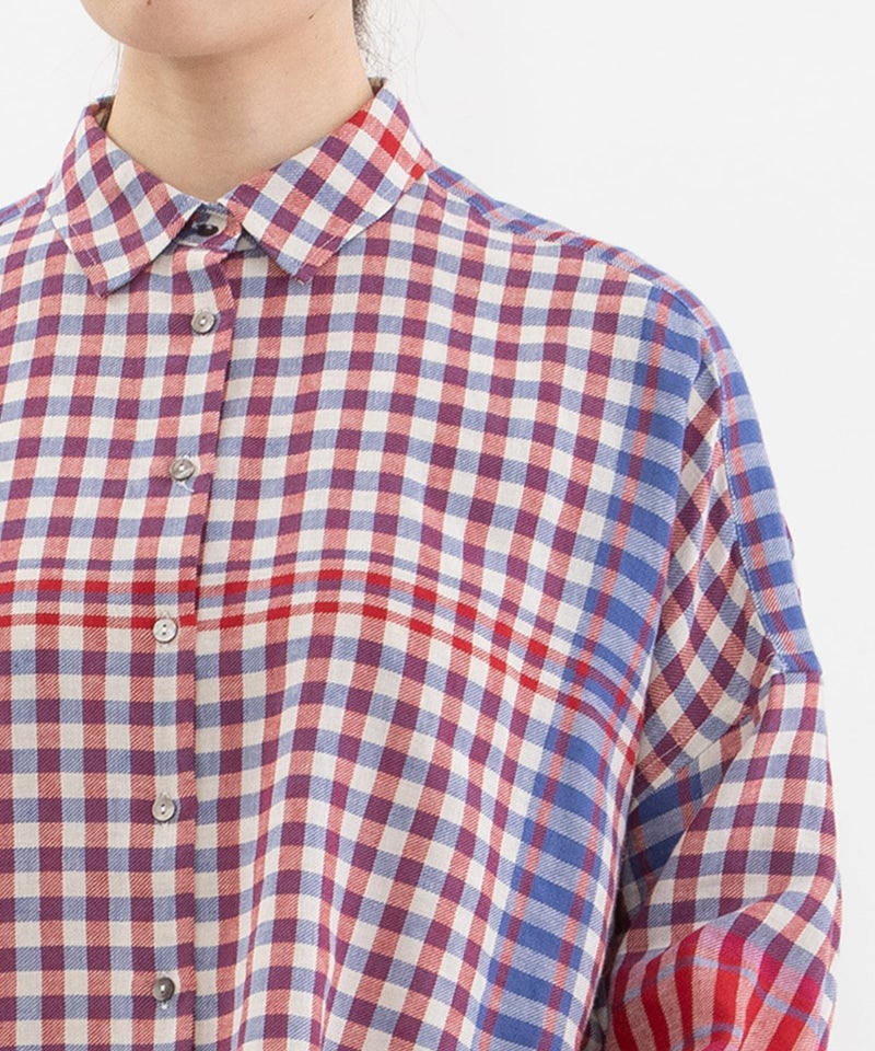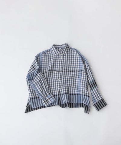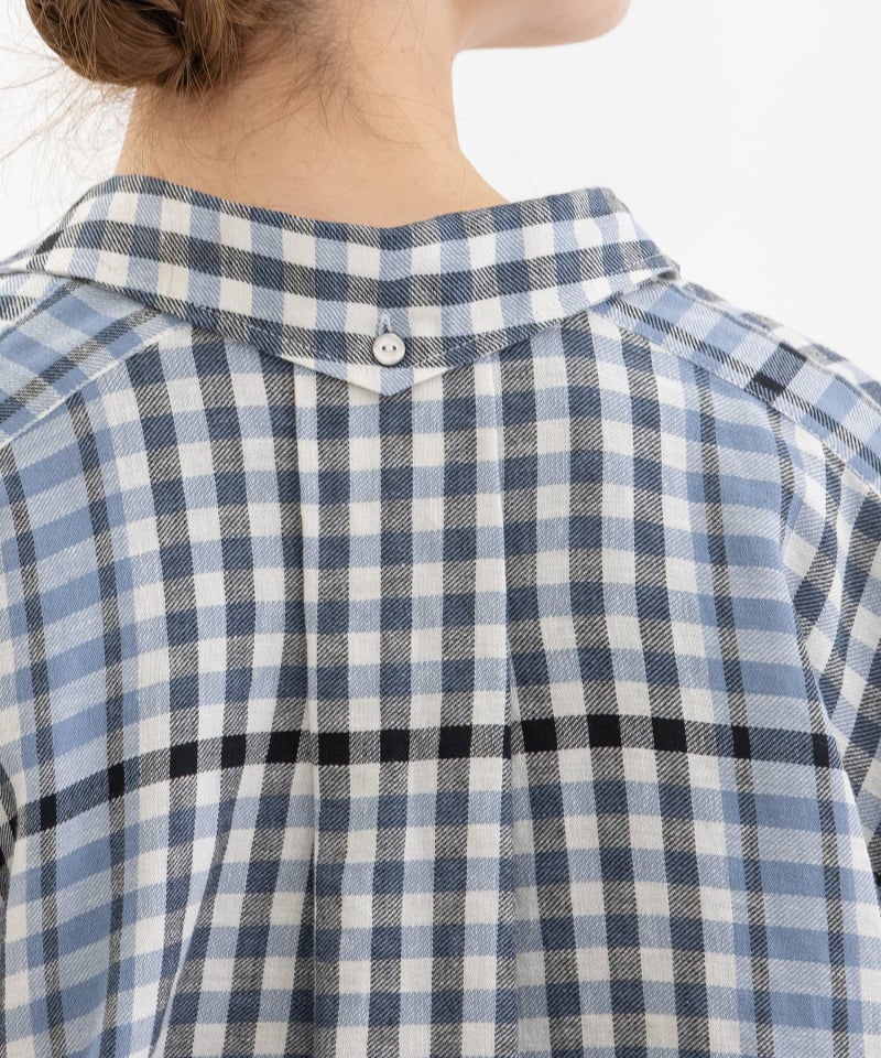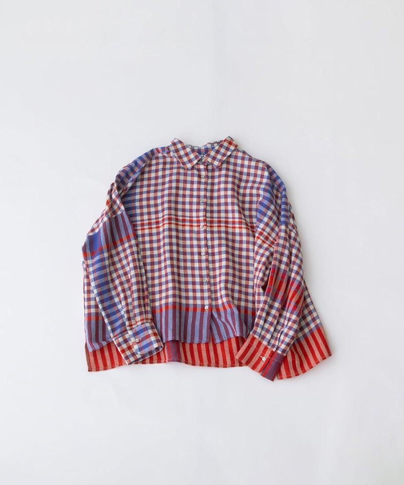 レトロな配色のギンガムチェックに、キッチンクロスのような裾柄を入れたオリジナルチェック生地で仕立てたシャツ。コットンリネンのやわらかなビエラ素材を使用し、軽やかで肌なじみの良い着心地に仕上げました。後ろボタンダウン仕様の、トラディショナルな衿がポイントのクロップド丈シャツ。前後差のあるデザインですっきりとしたバランスです。開けた時にちらりと見える配色ステッチもさりげないポイントです。