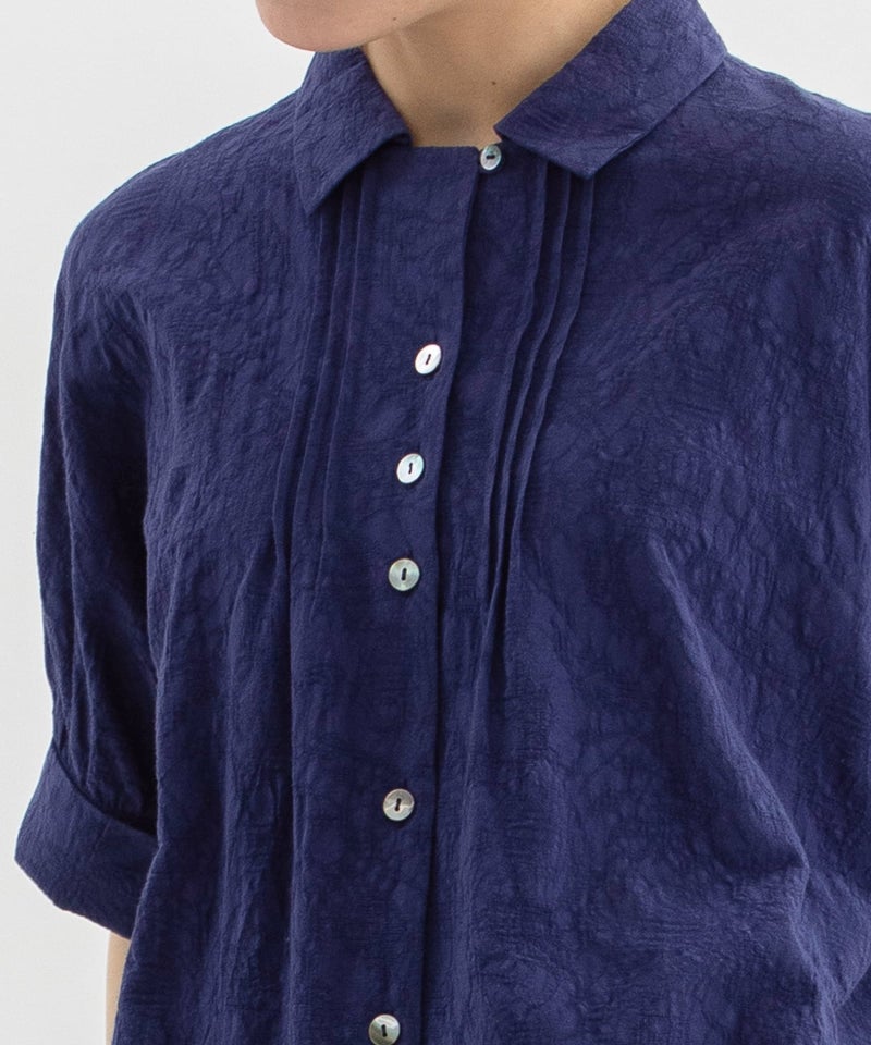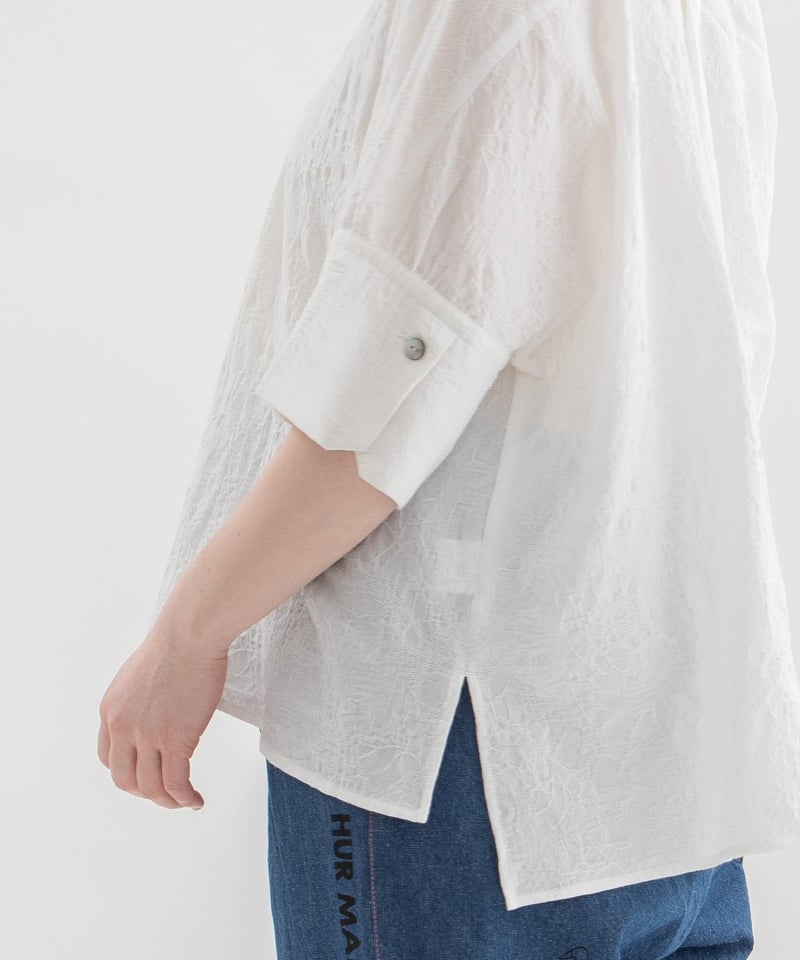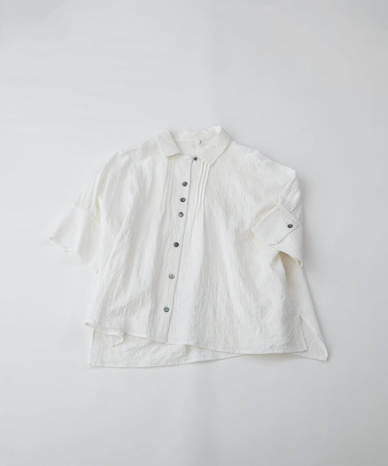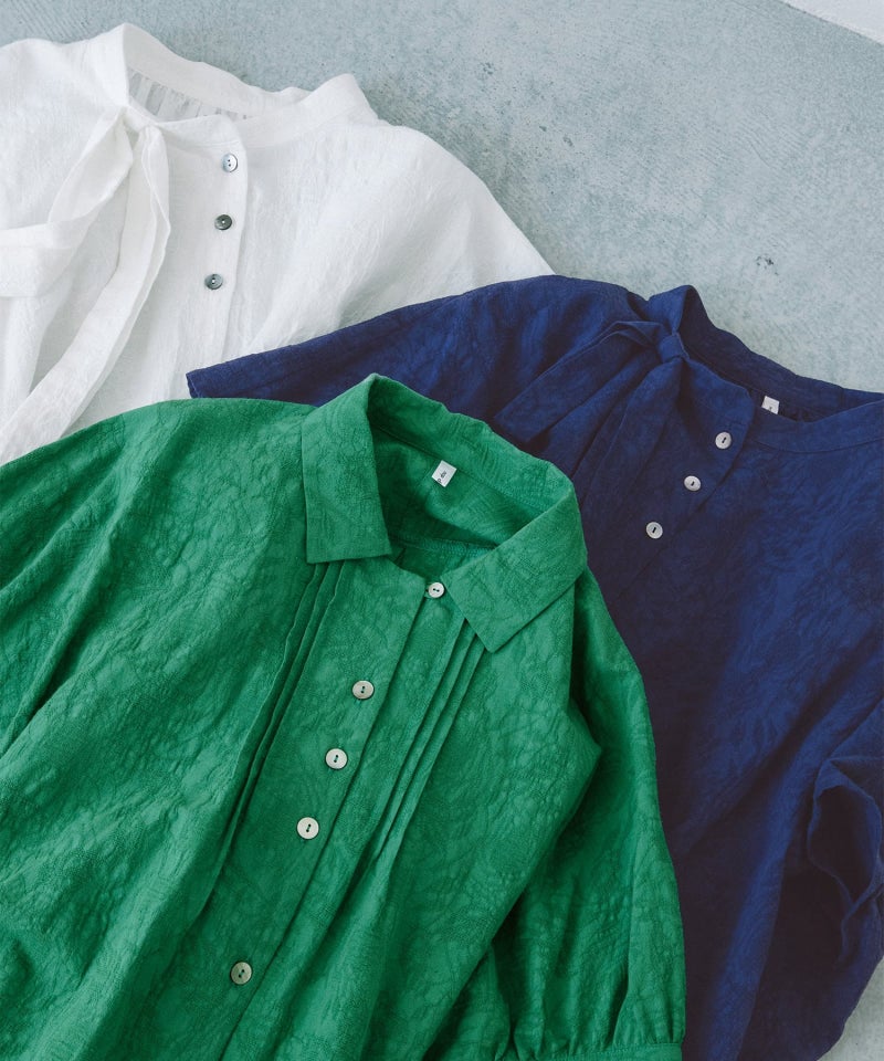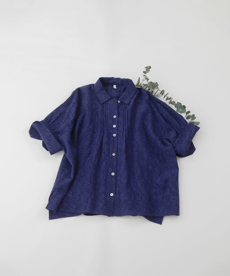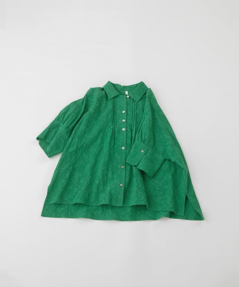 リネン混の繊細な表情がかわいいフラワージャカードブラウス。ワイドな身頃とドロップショルダーの5分丈カフス袖でふんわり着こなせます。カフスは折り返しても使いやすく、ピンタックと第一ボタンを開ければオープンカラー風の優しい襟元に。後ろが長めのデザインで、スカートやパンツにもバランスよく合わせられます。