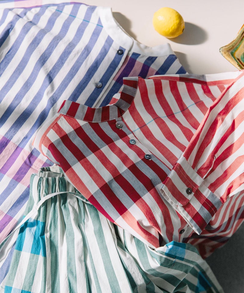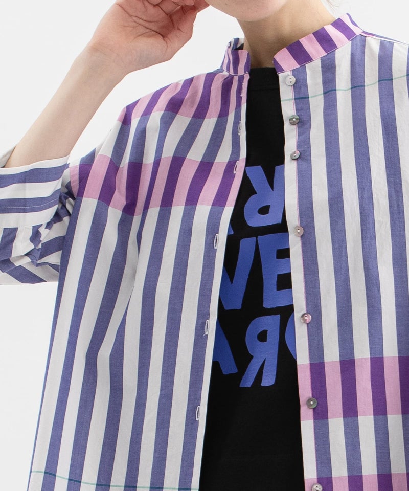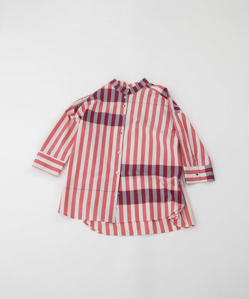 横ボーダーがアクセントになった太ストライプシャツ。太いストライプに一定間隔でボーダーを入れたオリジナル生地で、大胆な柄は羽織としてもおすすめの6分袖シャツです。個性的でモードな印象、コーディネートにダイナミックさやインパクトを与え、上級者向けの着こなしを演出します。後ろの丈が長めのデザインで、開けた時にちらりと見える配色ステッチもポイントです。