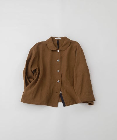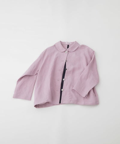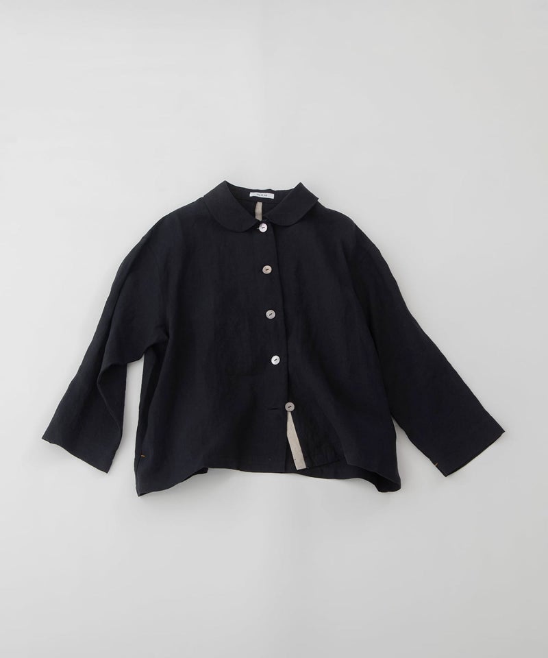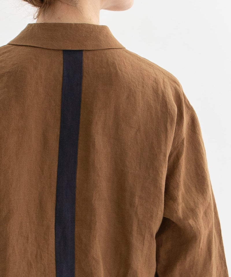 一年中活躍するヘンプ素材の丸襟シャツ。夏は涼しく、冬はあたたかい天然素材ならではの快適な着心地。吸水速乾性、高強度、抗菌性にも優れています。後ろはヒップが隠れる丈で夏のジャケット、羽織りとしても使いやすい一枚です。後ろ中心の配色や、開けた時の下前の配色がアクセント。両サイドポケットつき。