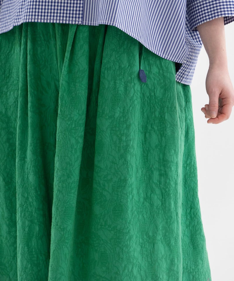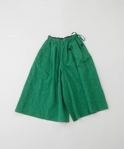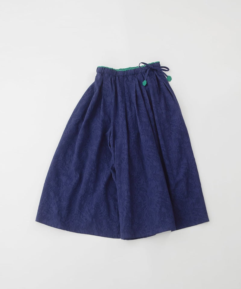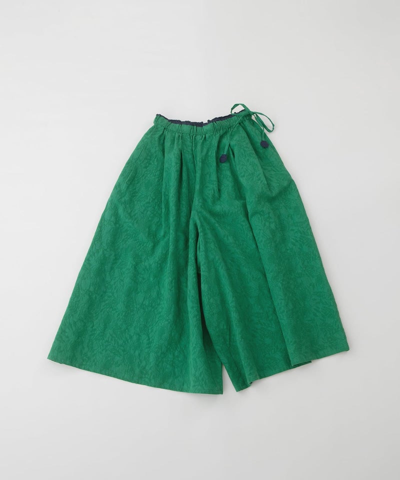 リネン混の繊細な表情がかわいいフラワージャカードキュロット。スカート見えしながら活動しやすく、短めの丈で上品に。ウエストの配色切り替えがアクセント。ウエストはゴム仕様で、紐先に付いた六角モチーフもさりげないポイントになっています。両サイドのポケット口にはスカラップステッチが入っています。