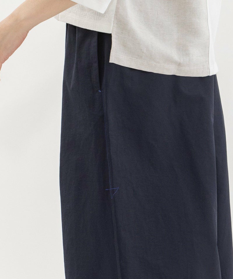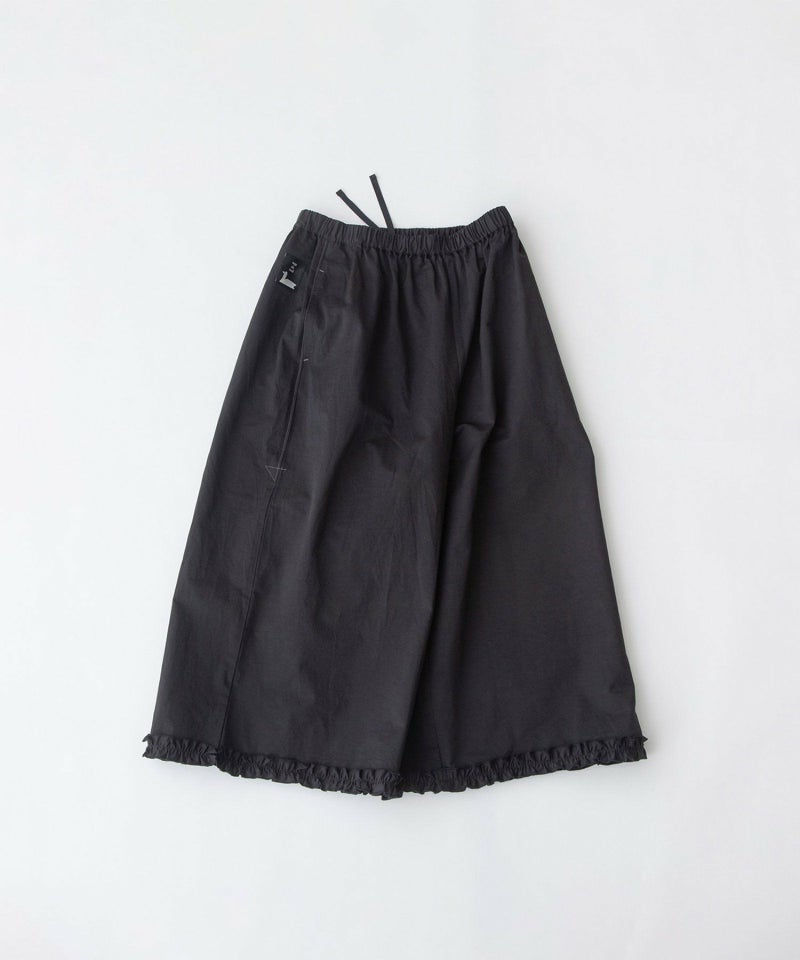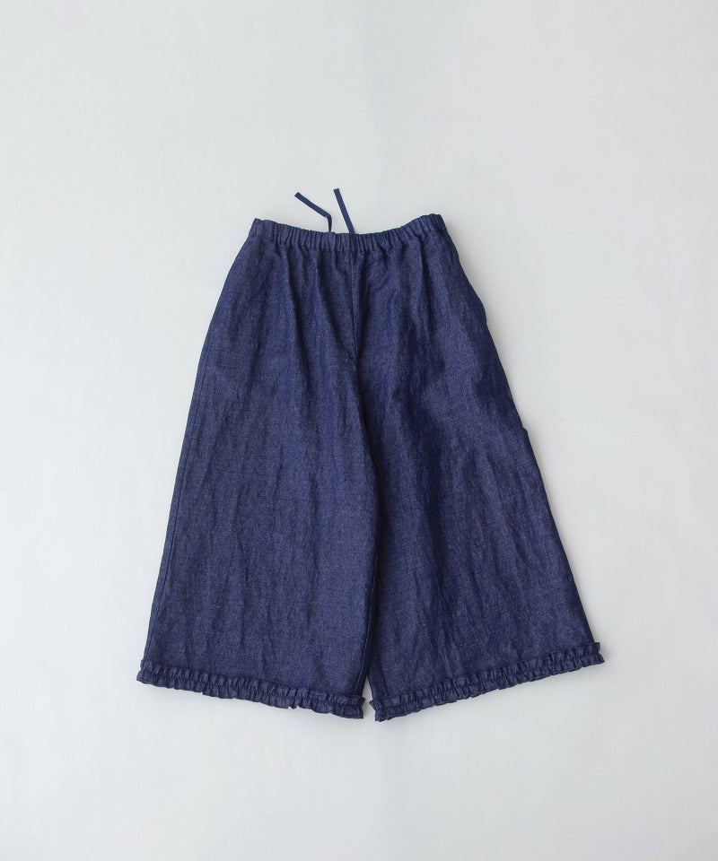 裾フリルの8分丈パンツ。きれいに広がるAラインシルエットです。スポーティーな光沢感のあるブラック・ネイビーの無地と、ナチュラルなデニムの2素材の展開。右後ろのスワンネームやサイドの配色三角ステッチ、両サイドポケットのスカラップステッチなどもさりげないアクセントを効かせています。ウエストはゴム仕様で、内紐つき。