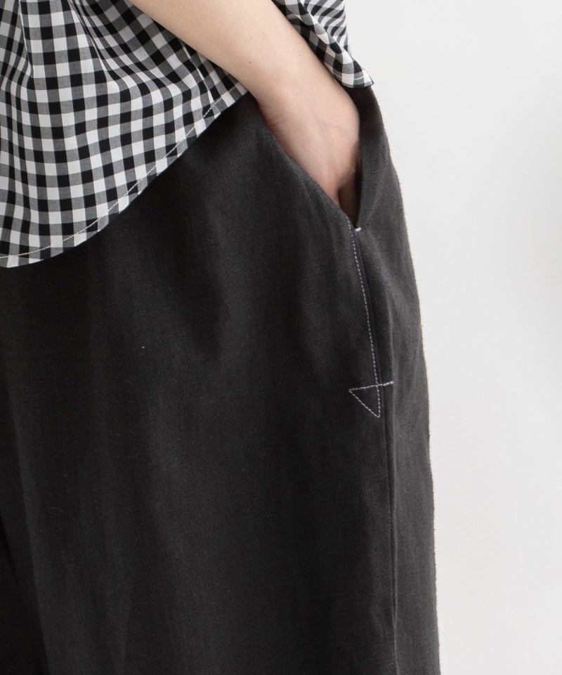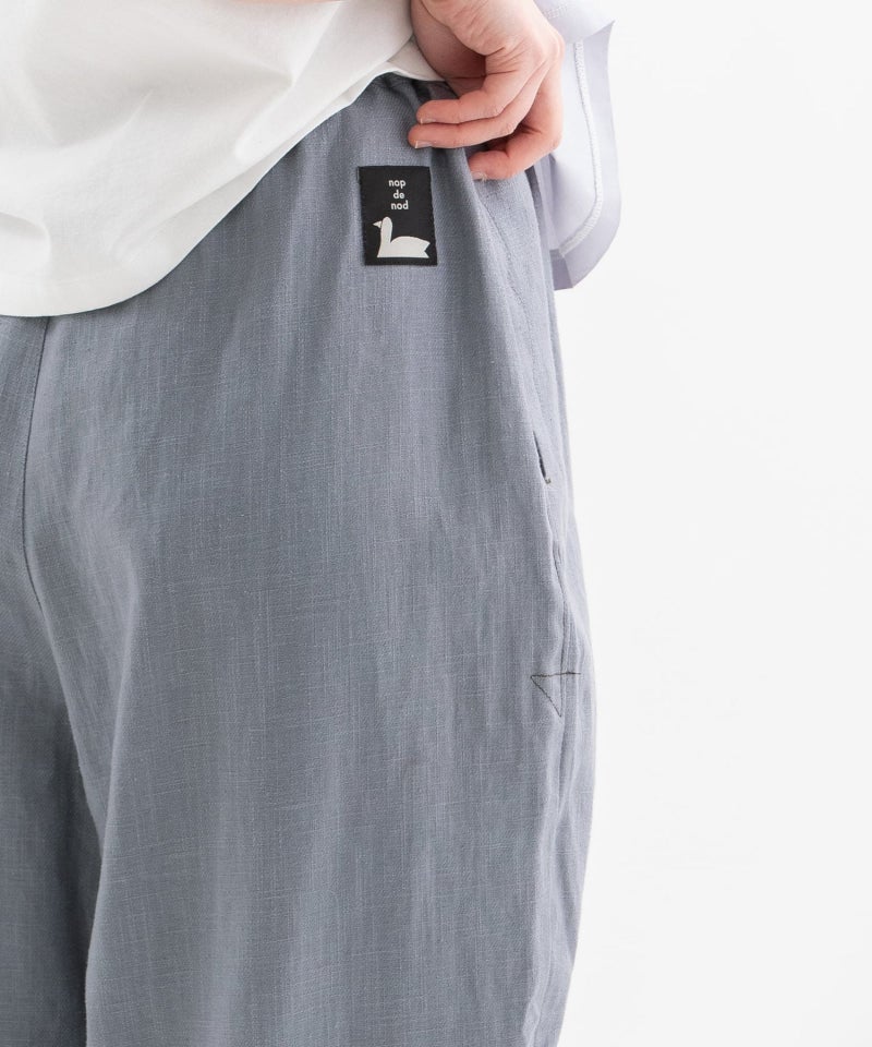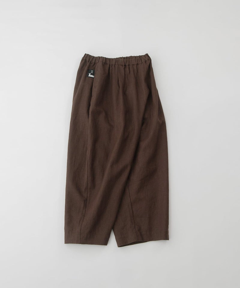 ふんわり丸く膨らんだくるぶし丈のパンツ。股上が深くリラックスしたゆるさがありながら、高い位置にボリューム感を持たせているのでバランス良く着こなせる人気のPommeパンツをさらにボリュームアップして丸みをプラス。しっかりとした厚さがあり、光沢とシャリ感が強い麻素材を使用。右後ろにスワンネームのワンポイント、ウエストはゴム仕様で内紐つき。両サイドポケットつき。