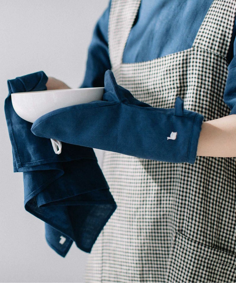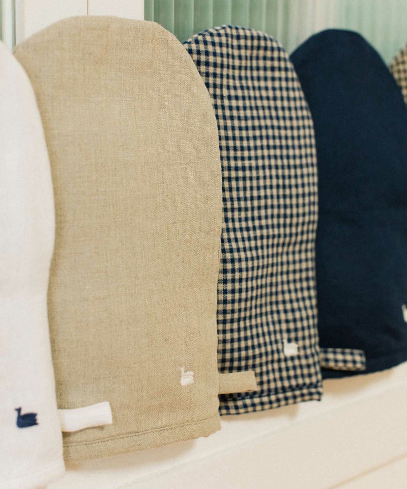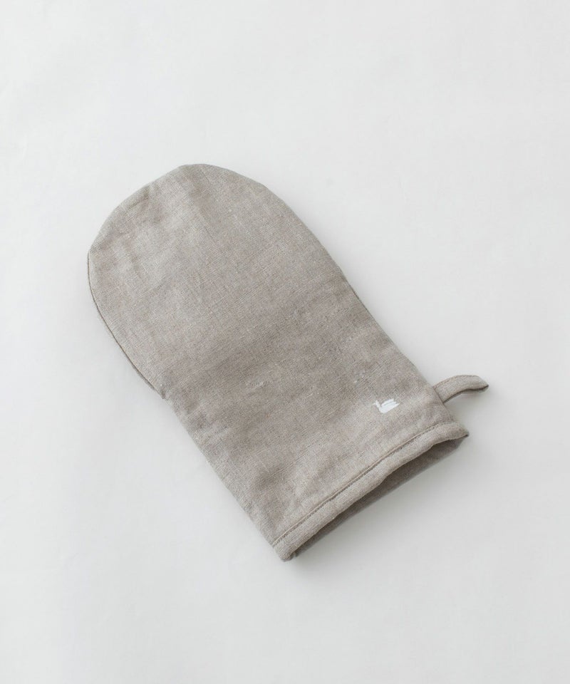 オーブン料理やお鍋を掴むのに欠かせないミトン。天然素材の中でもっとも丈夫と言われるリネンを使用しました。吸水性がよく、水に濡れても乾きが早いため清潔にお使いいただけます。手袋型は指先まで自由がきき、フライパンや大きめの鍋もしっかりとつかみやすくなっています。置いてあるだけで、毎日のお料理が楽しくなりそうなリネンミトン。nop de nodのアイコンであるスワンをさりげなく刺繍してあります。プレゼントにもおすすめです。