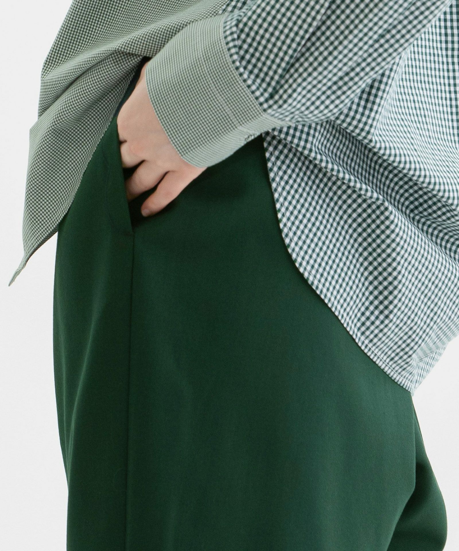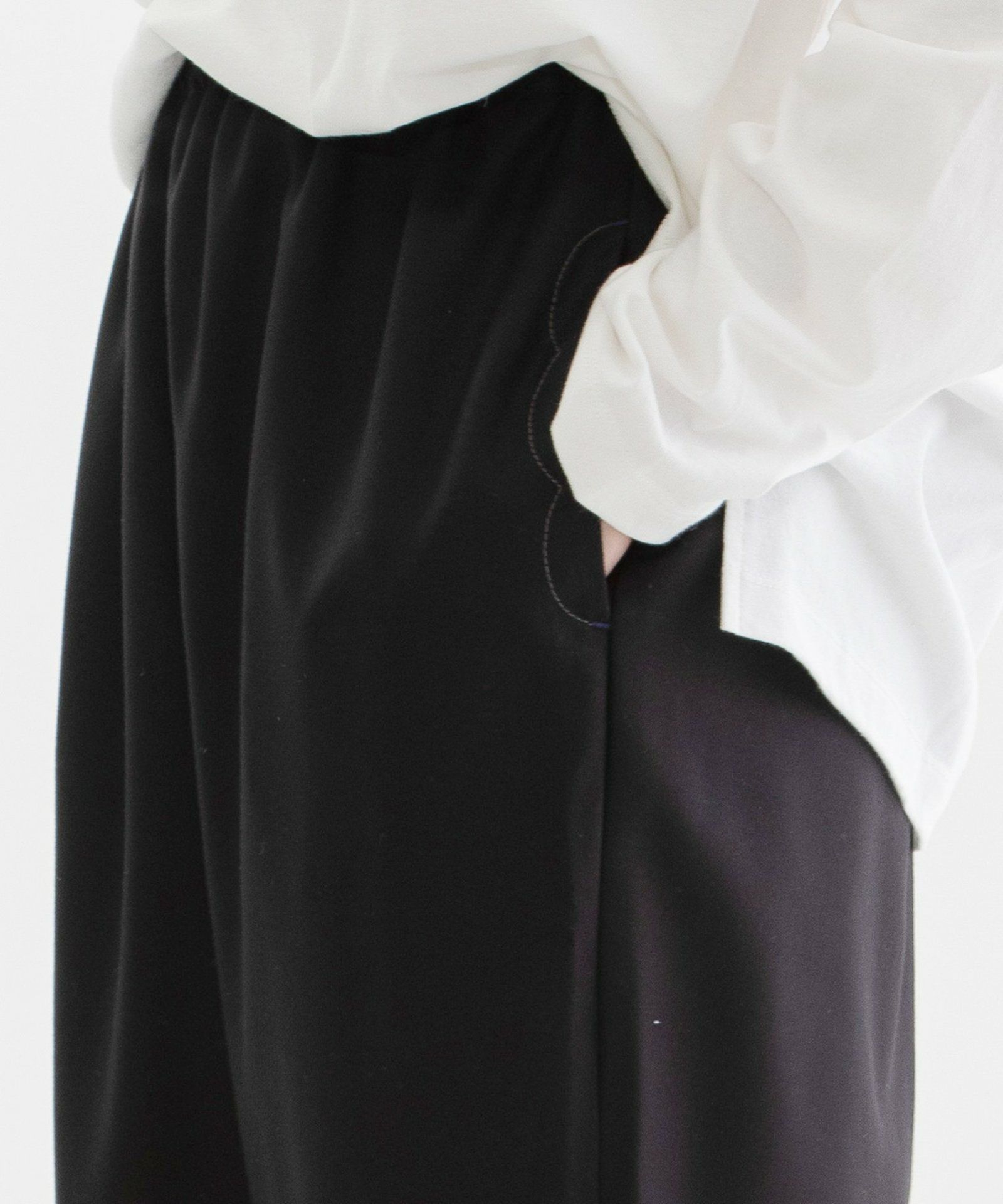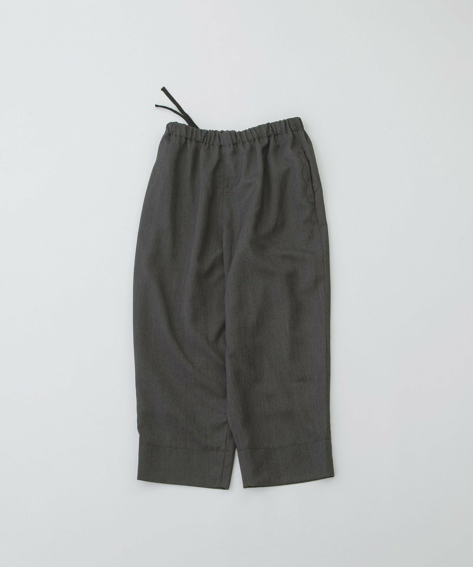 股上が深くリラックスしたゆるさと高い位置のボリュームがバランス良く決まるPommeパンツ。スーツや制服、ウインドブレーカーなどに用いられるギャバを使用。ウエストはゴム仕様で、内紐つき。両サイドのポケット口にはスカラップステッチがあり、さりげないアクセントに。■Styling