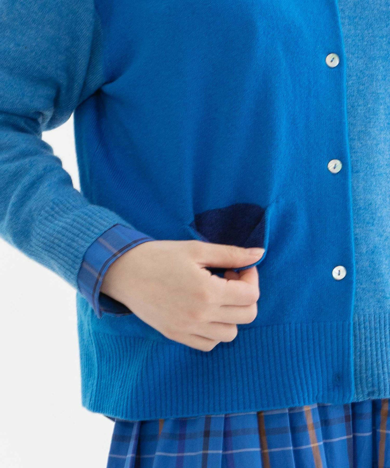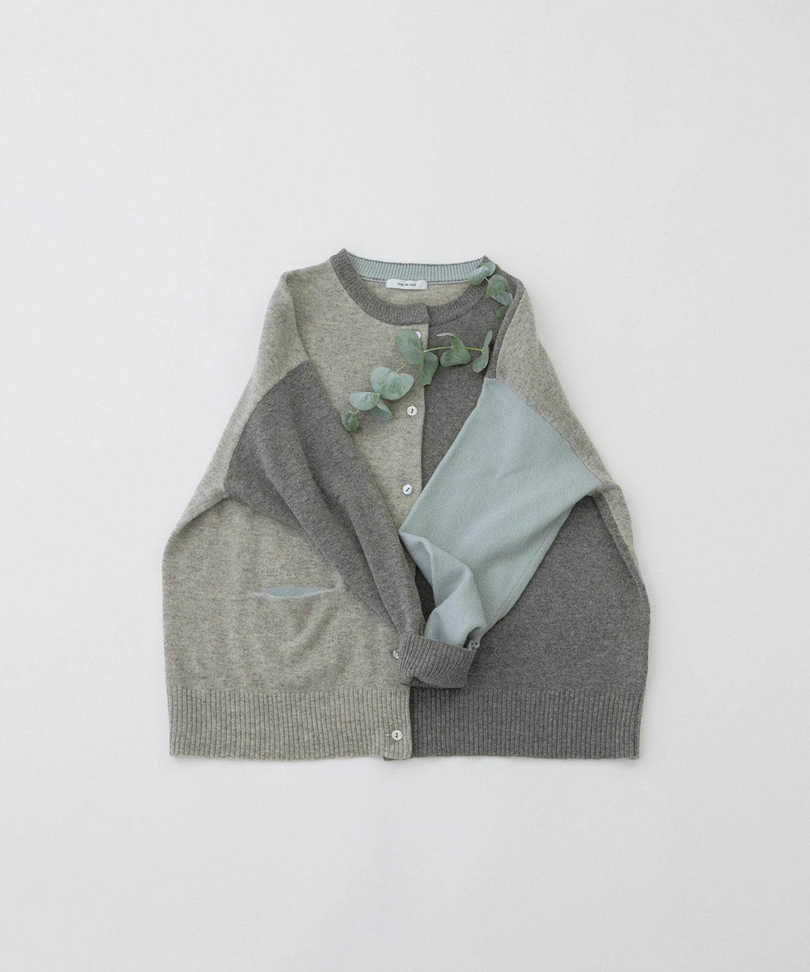 薄手でも暖かい、エクストラファインメリノ糸を使った定番カーディガン。同系色の3色を組み合わせています。ゆとりのある身巾とドロップショルダーでリラックスした着心地。バランスよく着られるジャスト丈です。