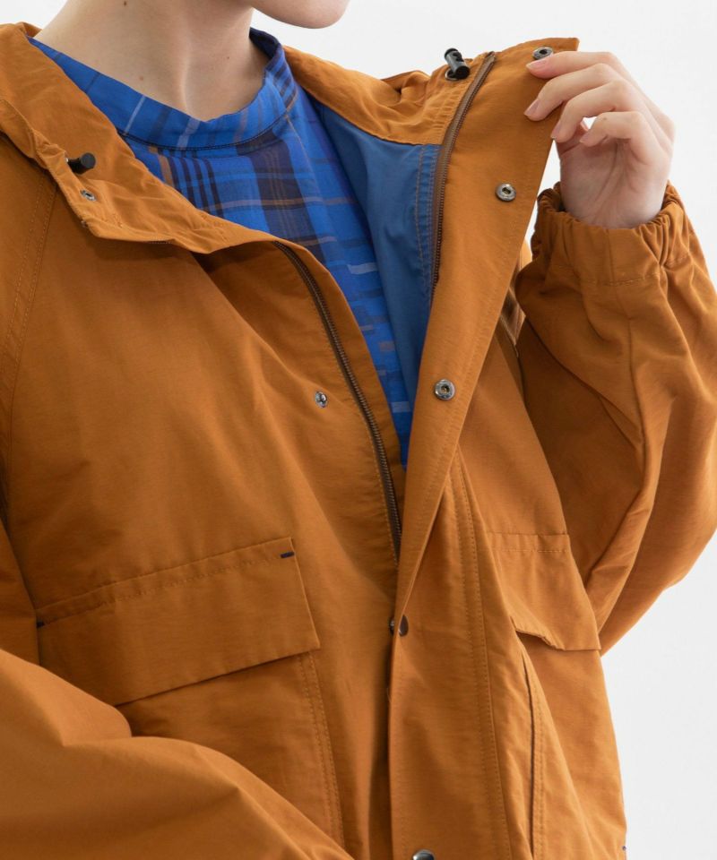 秋や春に活躍する軽やかに羽織れるコットンナイロンのマウンテンパーカ。大きなフロントポケットは脇からも入れられる2重構造で便利。袖口はゴム仕様で楽に捲れます。フードの後ろにはさりげないスワン刺繍入り。後ろが少し長めの前後差デザインでバランスよく着て頂けます。