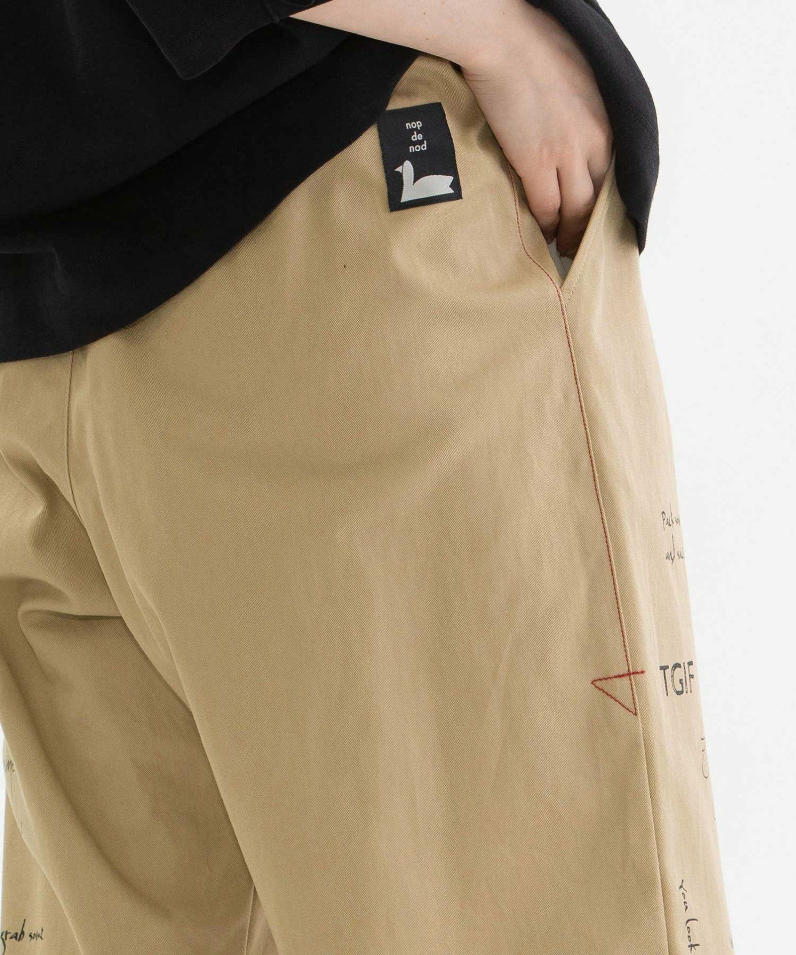 メッセージのようなロゴを前後に入れたワークパンツ。しっかり厚めのツイルで仕立てたリラックスしたシルエットのフルレングスのストレートパンツです。サイドの配色にした三角ステッチがさりげないアクセント。ウエストは内紐つきでゴム仕様。両サイドポケットつき。ウエストの内側やポケットの中には、オリジナルロゴプリントの生地を使っています。