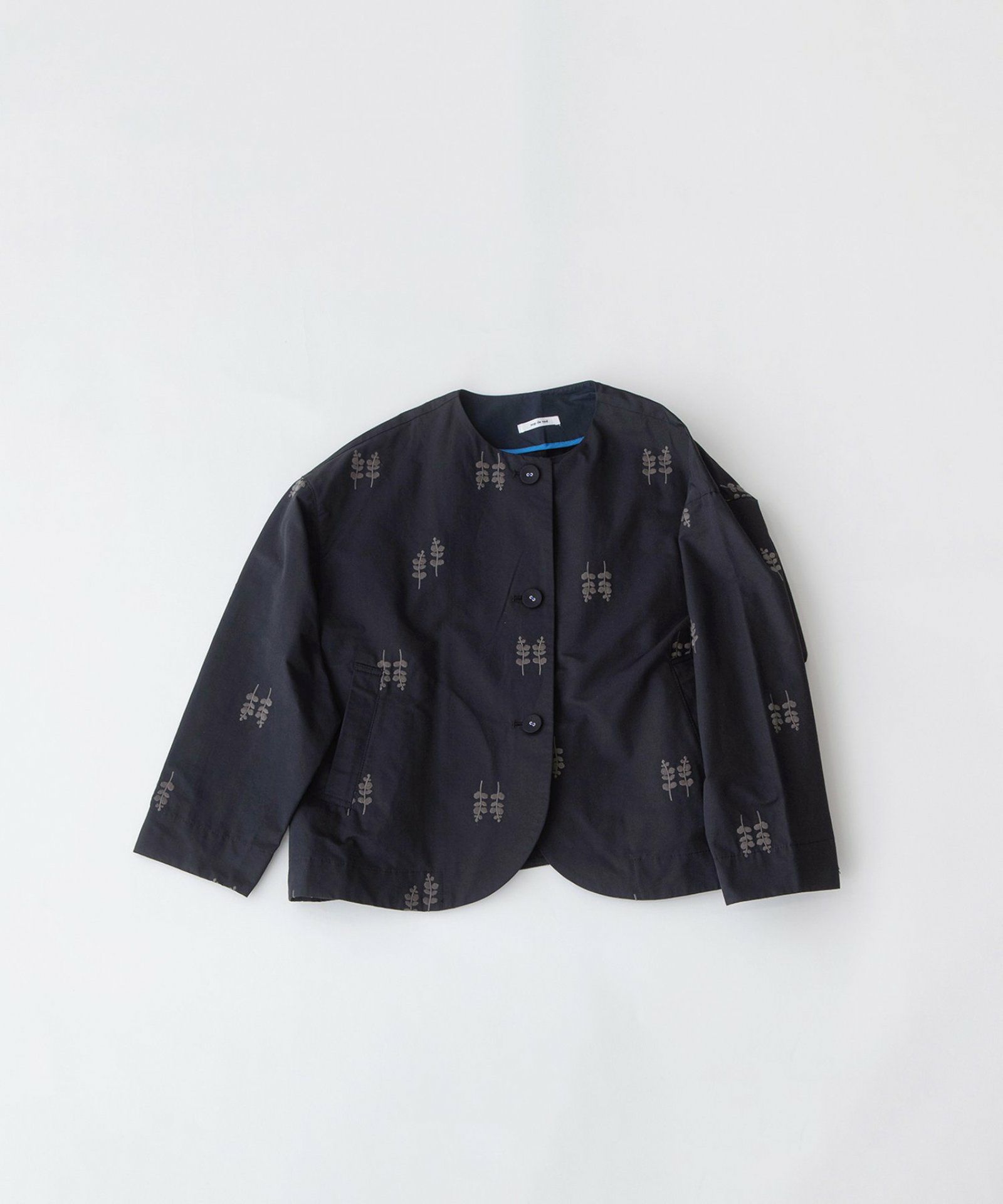 軽い綿ナイロンのグログラン生地に、ユーカリ柄の刺繍を施したオリジナル生地のノーカラージャケット。裏地なしの軽やかな仕立てで、縫い代はパイピング始末を施しています。共くるみボタンを使用し、両サイドポケットつきです。