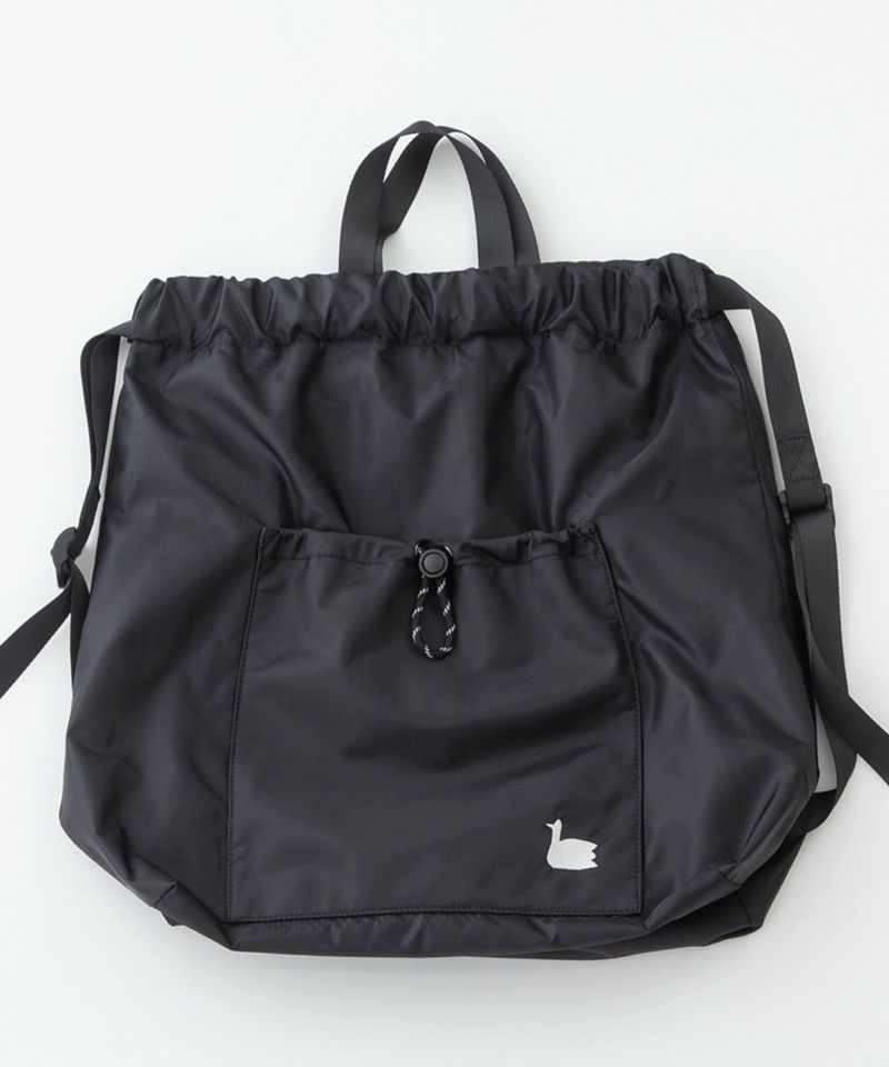 デイリーユースにぴったりな使い勝手抜の良いナップサック。肩紐の長さが調整できるデザインや、A4もすっぽり入るサイズ感です。リュックのように背負うのはもちろん、ラフに肩掛けするスタイルもおすすめです。手持ちスタイルも出来るショートハンドル付き。アウトポケットにはスワン刺繍がアクセント。裏地つき(インポケットあり)