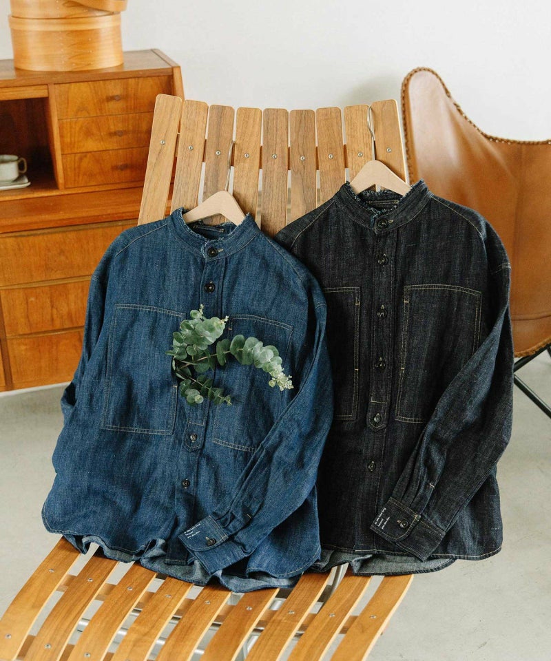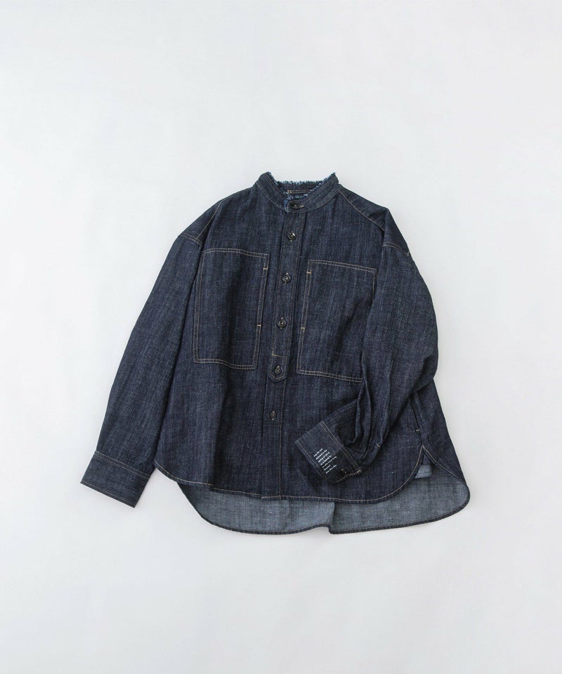 ワーク調の胸ポケットが目を引く綿麻デニムの羽織りシャツ。程よくしっかりとした素材感で春や秋の羽織におすすめです。スタンドカラーの端に断ち切りの共布を挟んで、ラフなディテールをプラスしました。後ろはヒップが隠れる長めの前後差デザイン。配色ステッチと左カフスに入れた文字プリともポイントになっています。両サイドポケットつき。