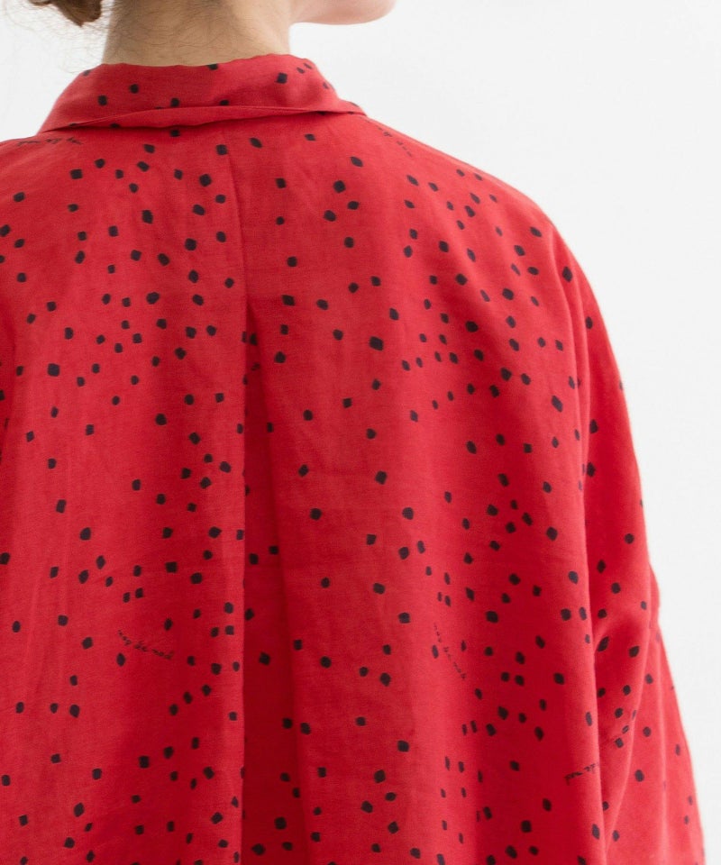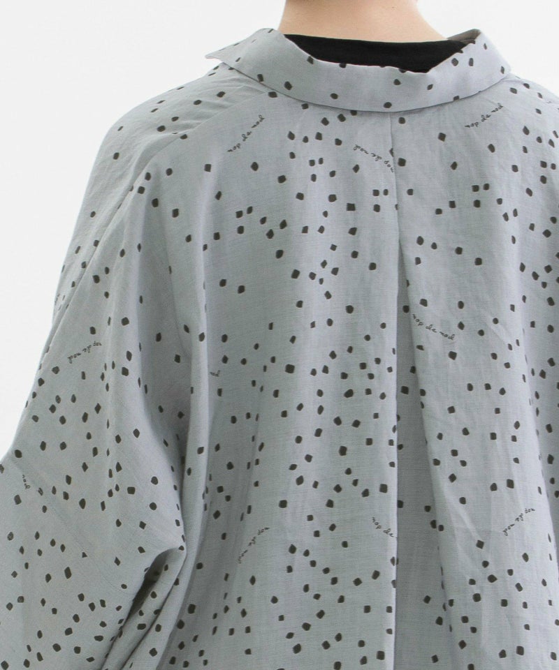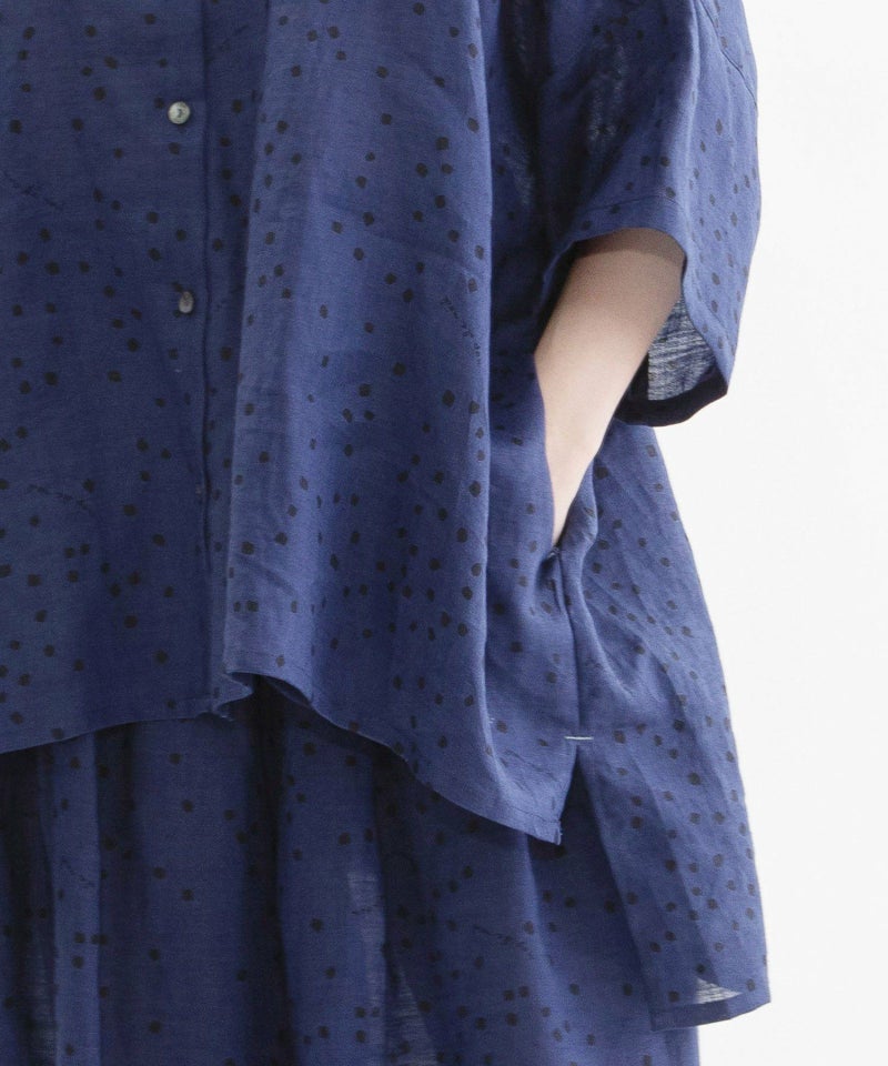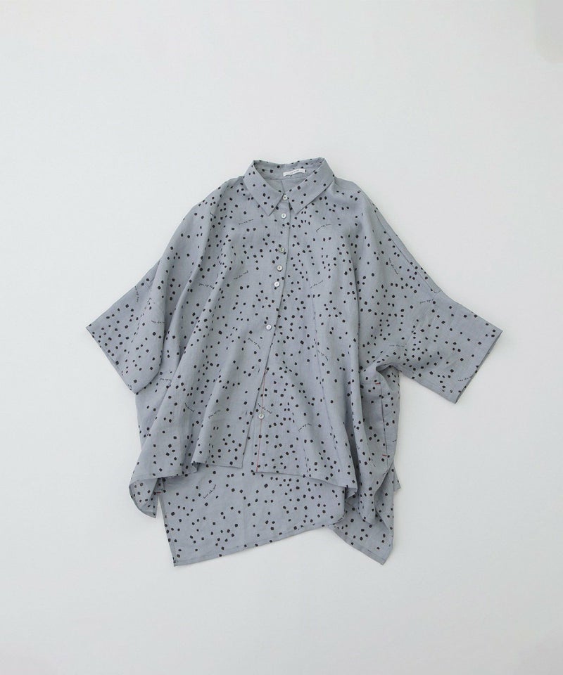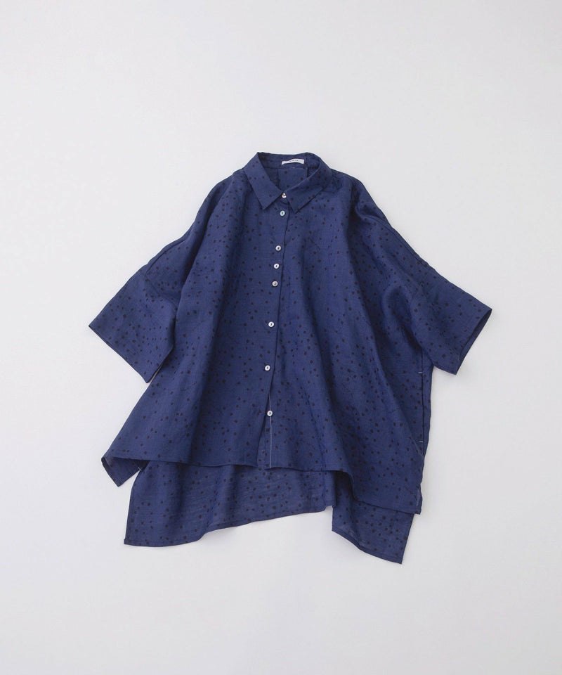 さらっと涼やかで適度なハリのあるラミー素材に、四角いしずくのようなドットをプリントしたオリジナルテキスタイルのシャツ。ロゴをさりげなく入れた新バージョンの柄です。ヒップをすっぽり覆う大きめボディと、脇が自然に落ちるこなれ感のあるシルエット。あえて少しはねたような5分袖が抜け感をプラスしてくれます。上の方だけボタン間隔を狭くしたデザインで、首元の開きを調整できます。ボタンを開けたときにちらりと見える、下前立ての配色ステッチがアクセントに。大きな裾の前後差もデザインポイントです。