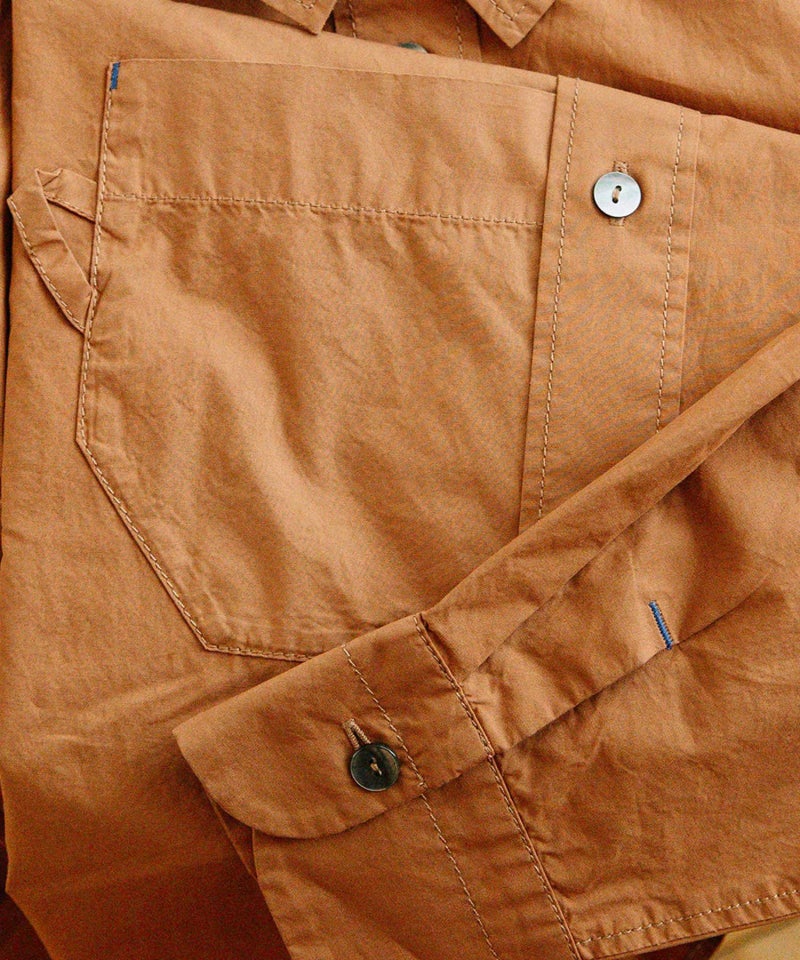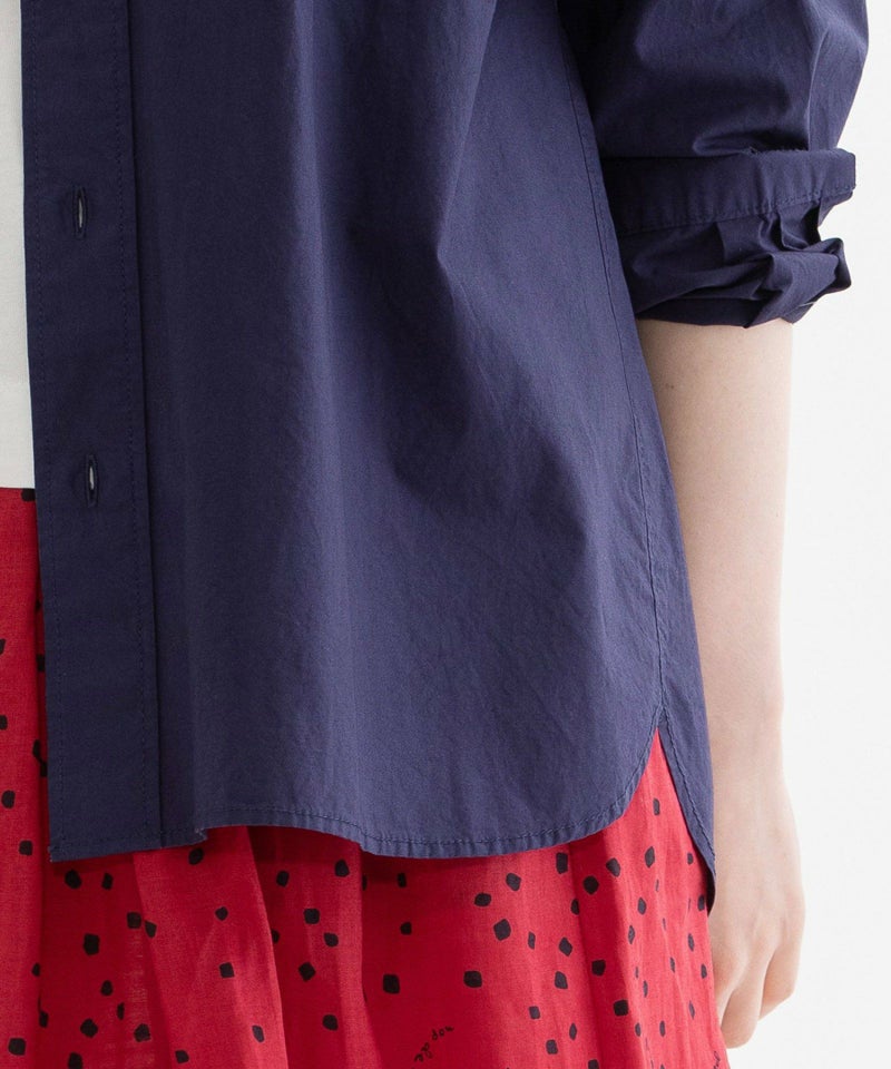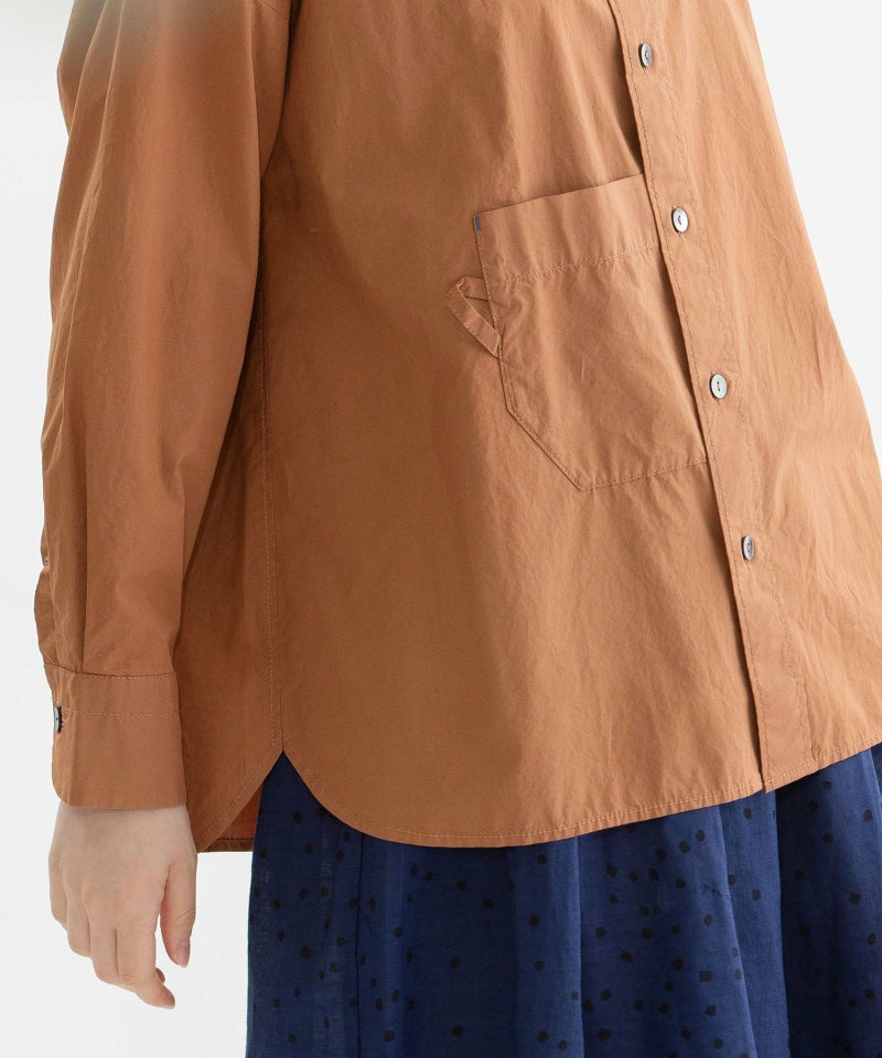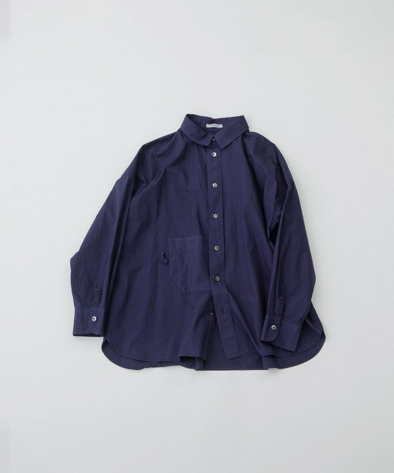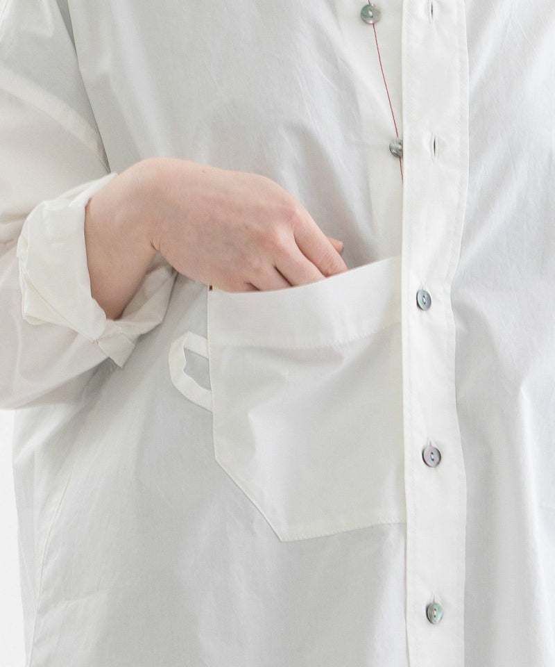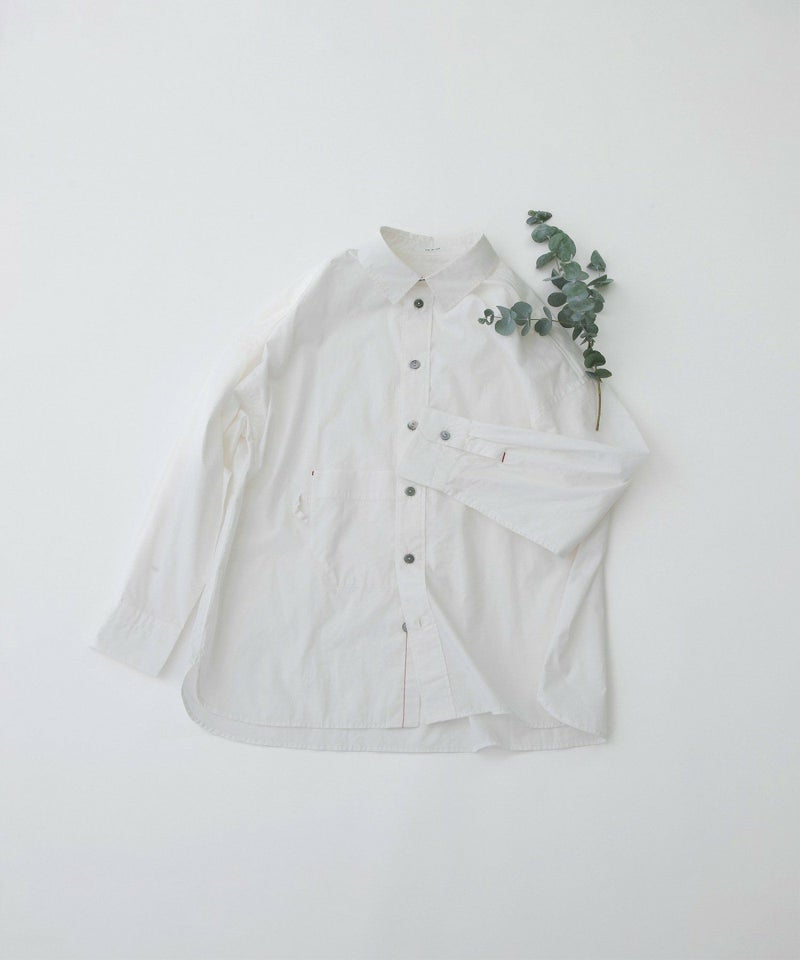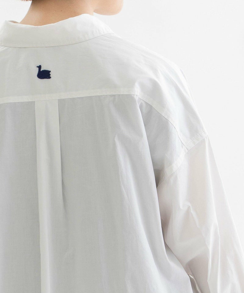 フロントの丸みのあるカップ型ポケットがポイントのロングスリーブシャツ。適度な張りときれいな表面のタイプライター生地を使用。1枚でも、羽織でも活躍してくれます。バックにはスワンのワンポイント刺繍入り。上品な貝ボタンや、開けたときにちらりと見える、下前立ての配色ステッチがアクセントに。オフホワイト以外のカラーは縫製後に製品染めを施し、洗いざらしのような自然な風合いに仕上げました。