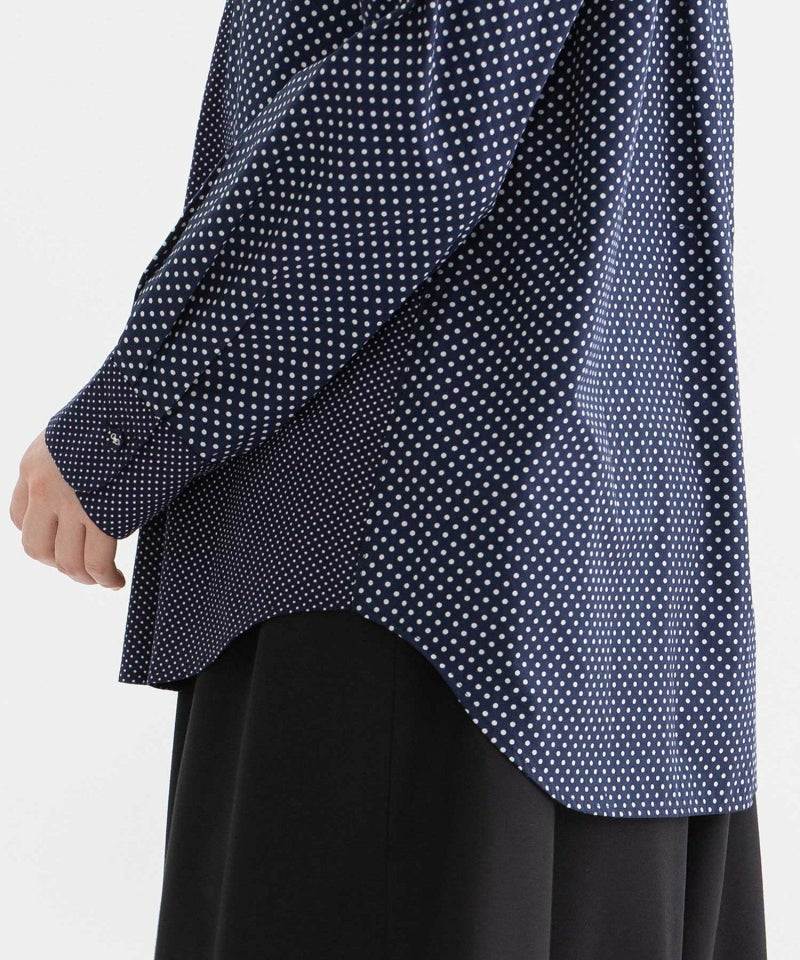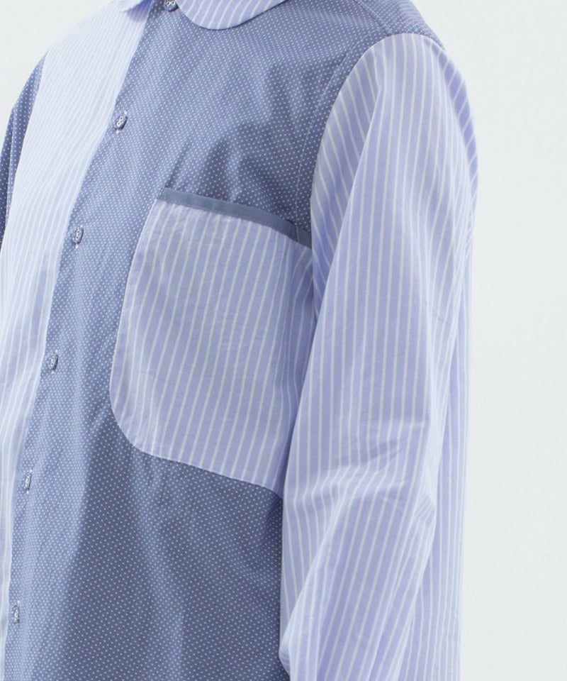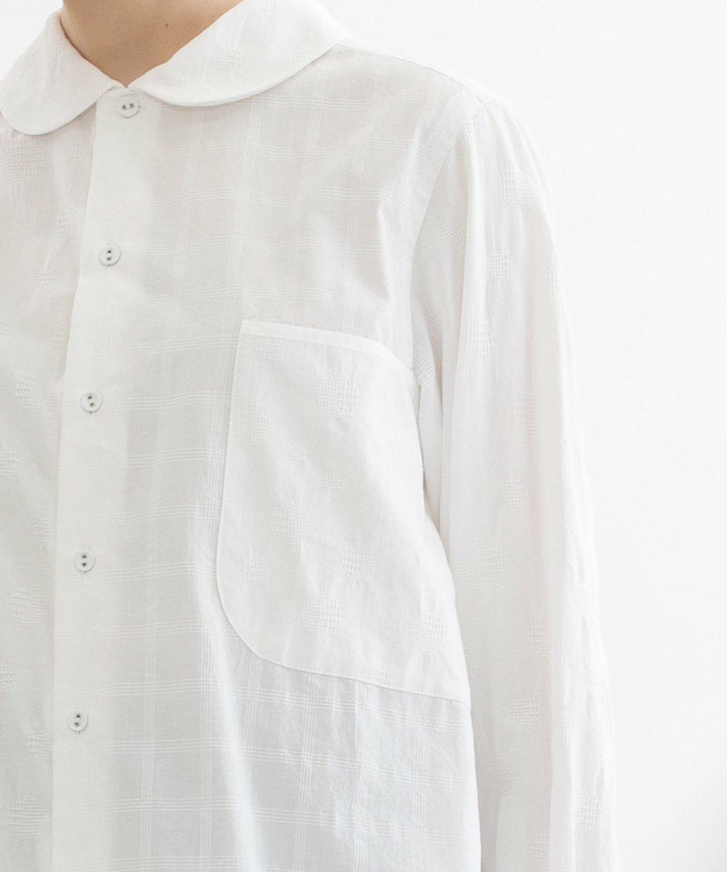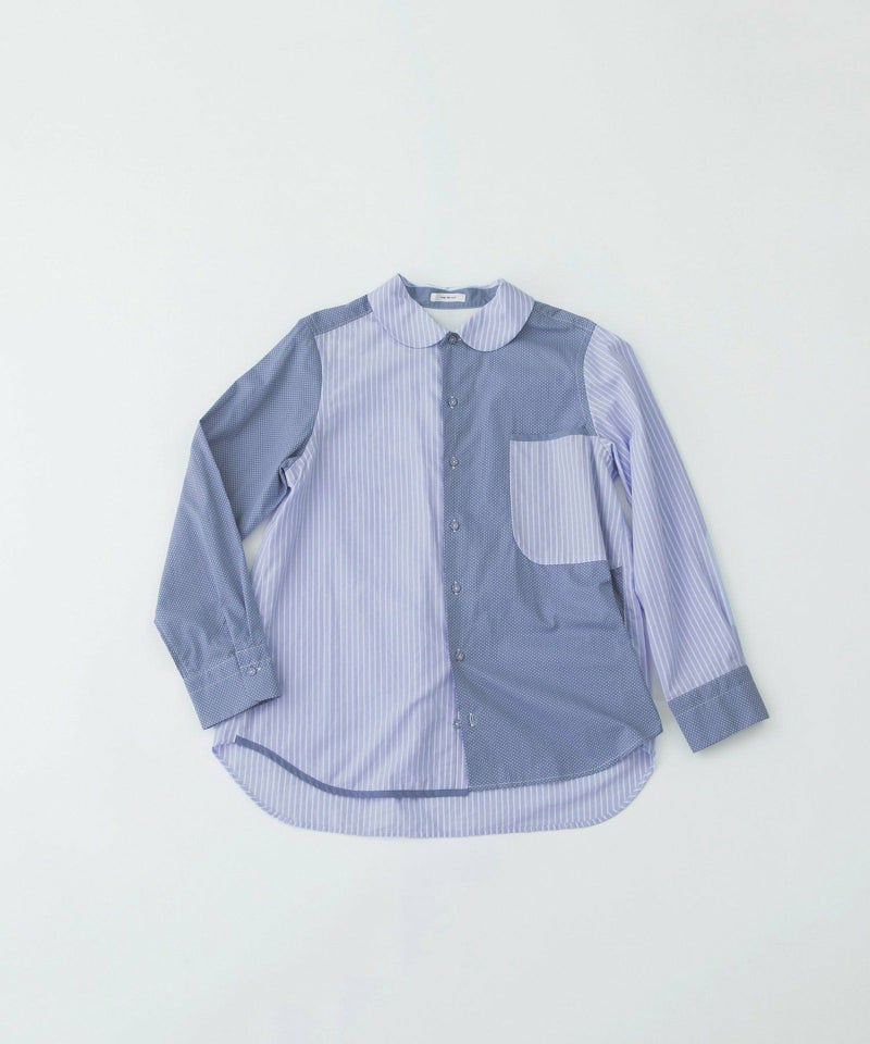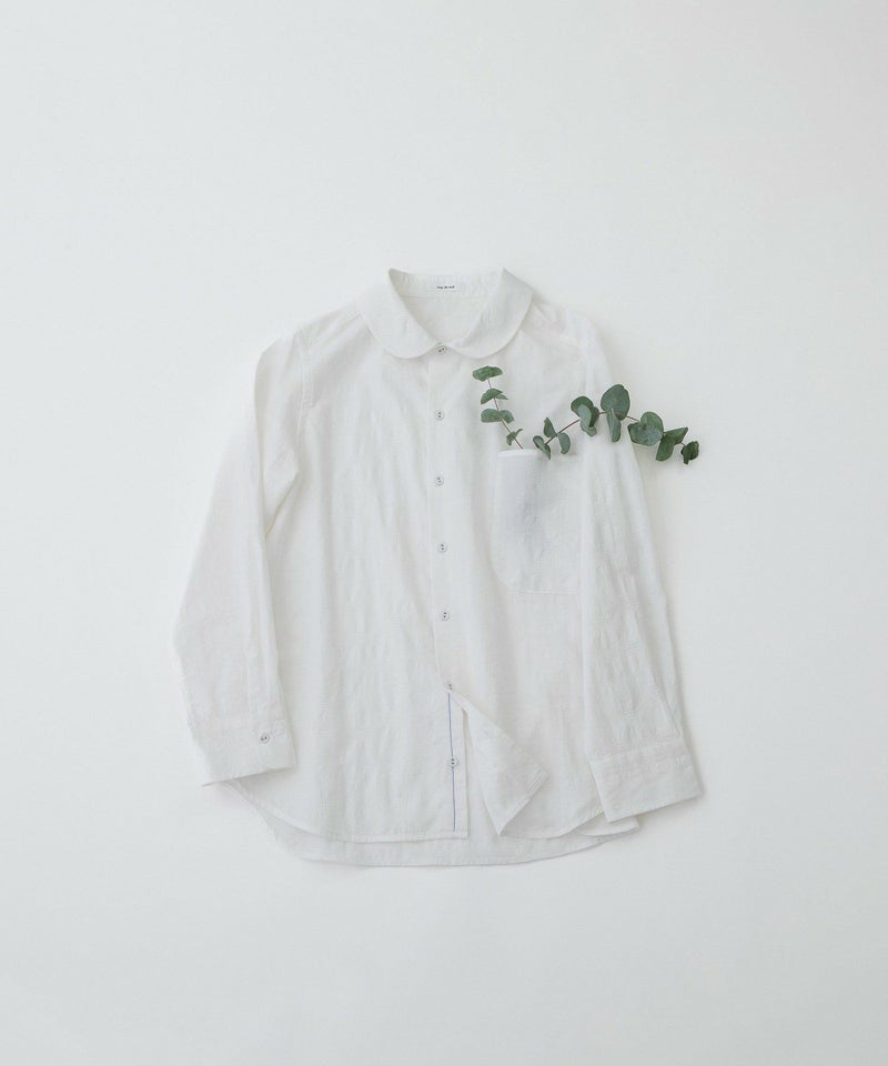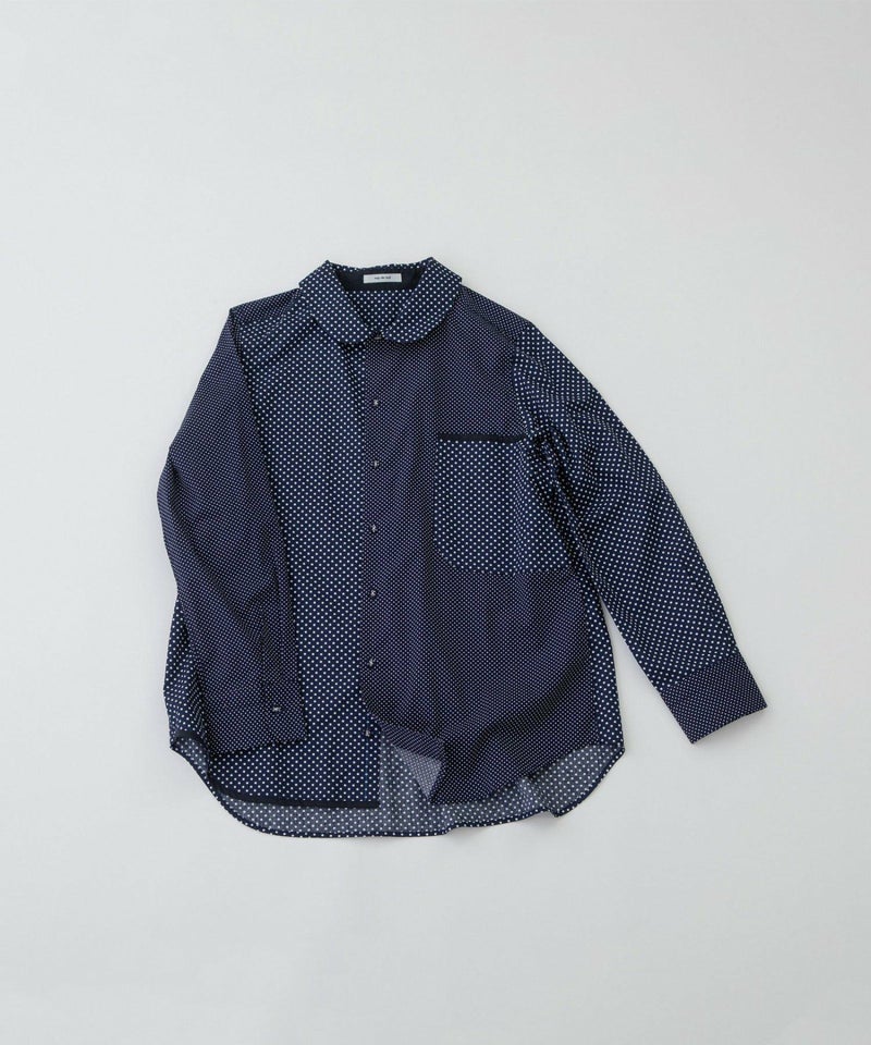異素材を組み合わせた丸襟のきちんとしたシャツ。前右裾・胸ポケットのパイピング使いや、襟裏や背面のタブに別布をあしらってさりげないアクセントに。オフホワイトはワッフル織のドビーと格子ドビー、ダークグリーンは大きさの違うギンガムチェック合わせ、ブルーはストライプと小さなドット、ネイビーは大きさの違うドットの組み合わせ。色によって表情の違う4色展開です。後ろがやや長めのデザインで、くるみボタンがナチュラルな印象に。開けた時にちらりと見える配色ステッチもポイントです。