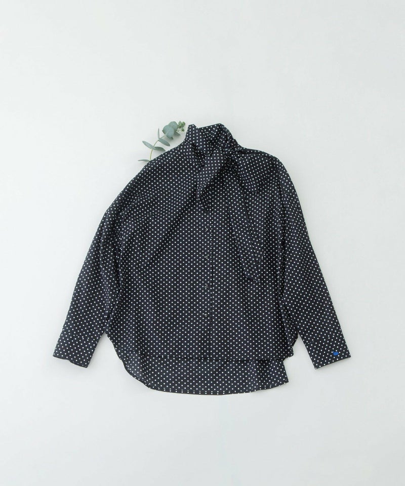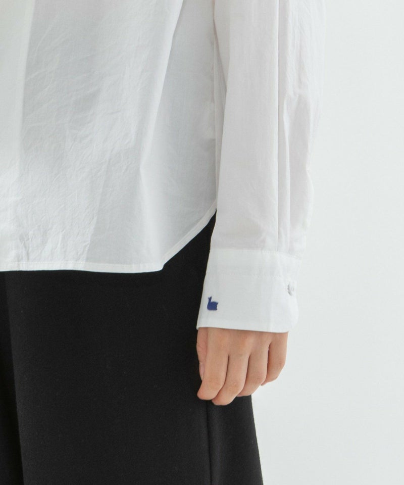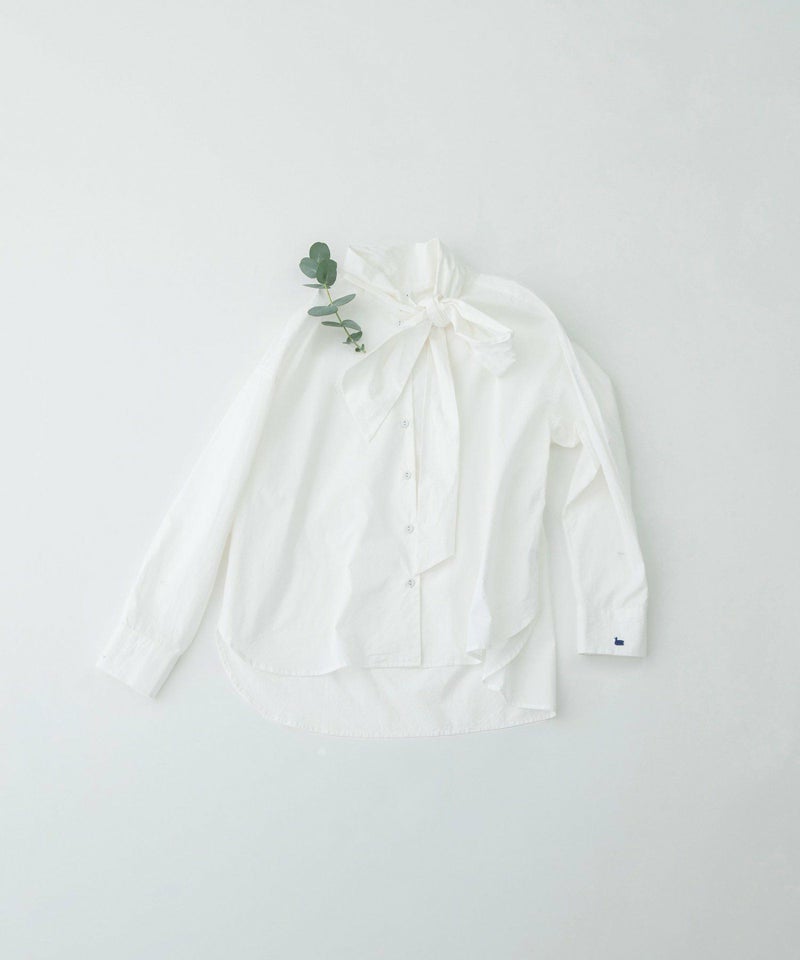 マニッシュなテーラードにあわせたい、レディな雰囲気を取り入れられるトレンドのボータイシャツ。甘すぎないシルエットで、脇にずらした襟がモード感をプラス。真ん中で結んだり、ラフに片リボンで長く垂らしたり、後ろ中心にまわしたりとお好みでアレンジができます。太目で大きなボータイがポイント。左カフスには小さなスワン刺繍を入れてアクセントに。後ろが長めの前後差でデザインです。