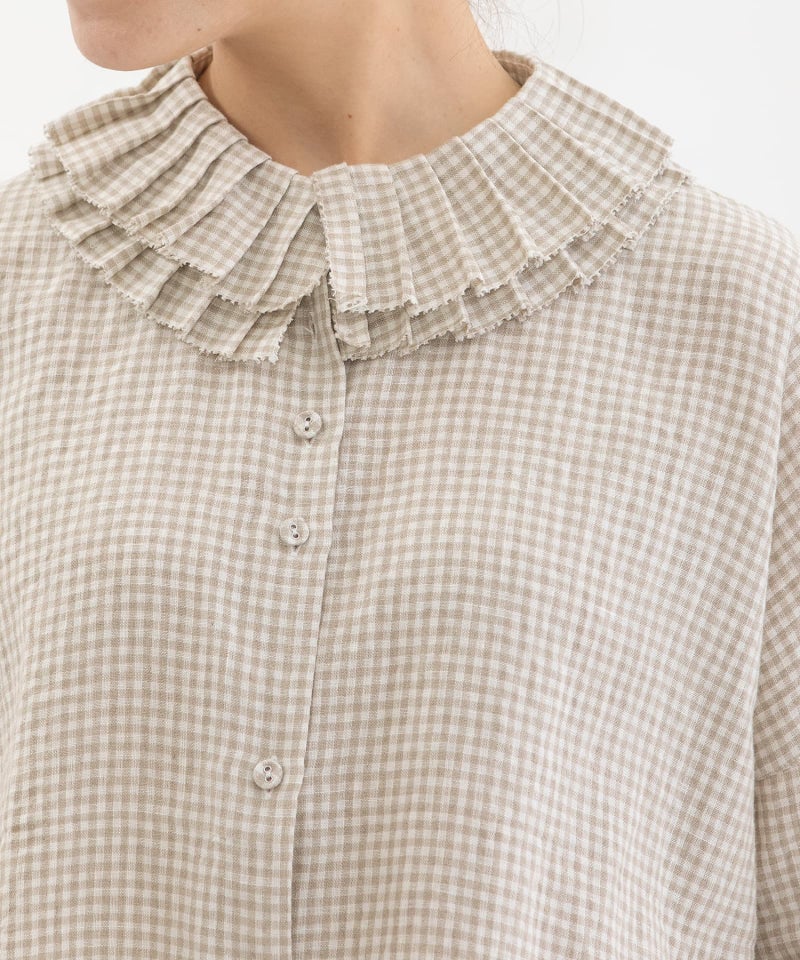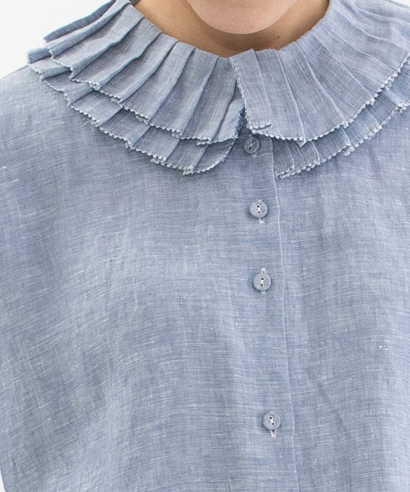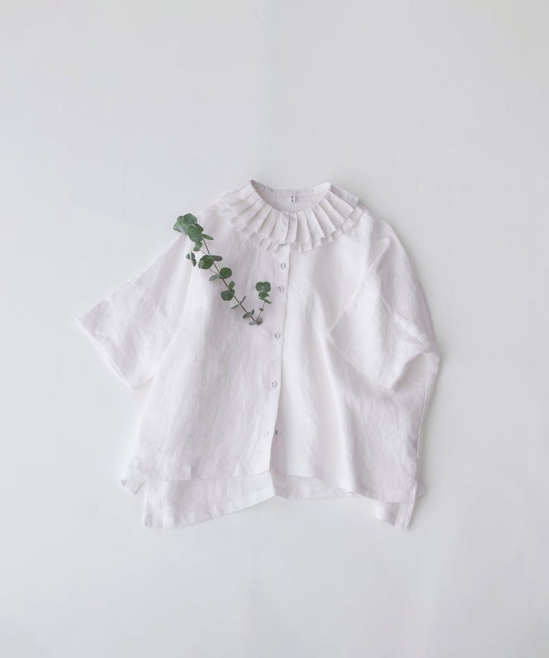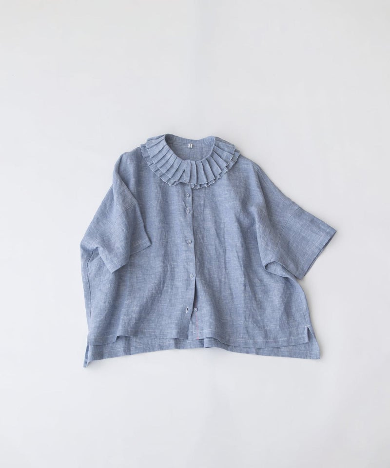 プリーツ衿を2枚重ねた表情のあるリネンブラウス。ワイドでゆとりのあるシルエットながら、甘くなりすぎずリラックスして着られる一枚です。衿まわりはピコミシンカットで、華奢で軽やかな印象に仕上げました。肘にかかる5分袖と、フロントは短めの前後差デザインでバランスよく着こなせます。くるみボタンでナチュラルに、下前中心にはピンクのステッチを施しています。