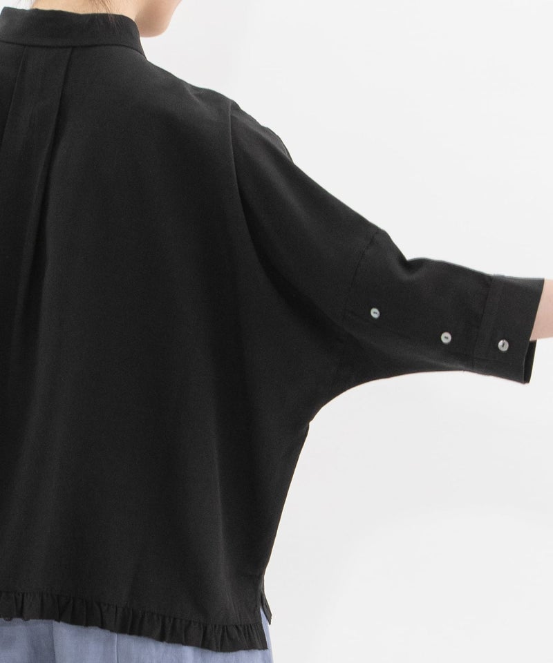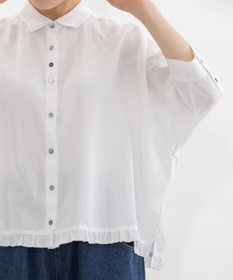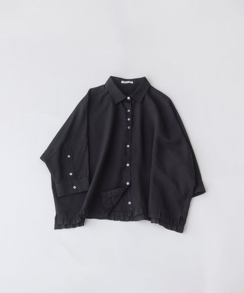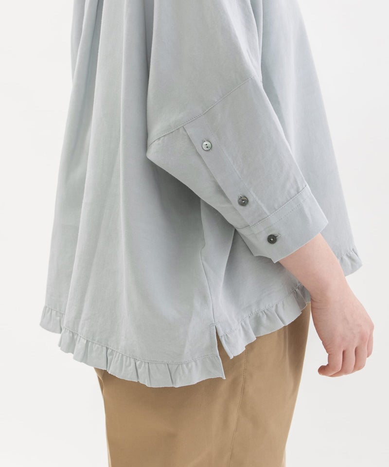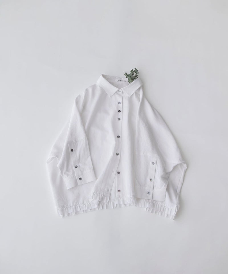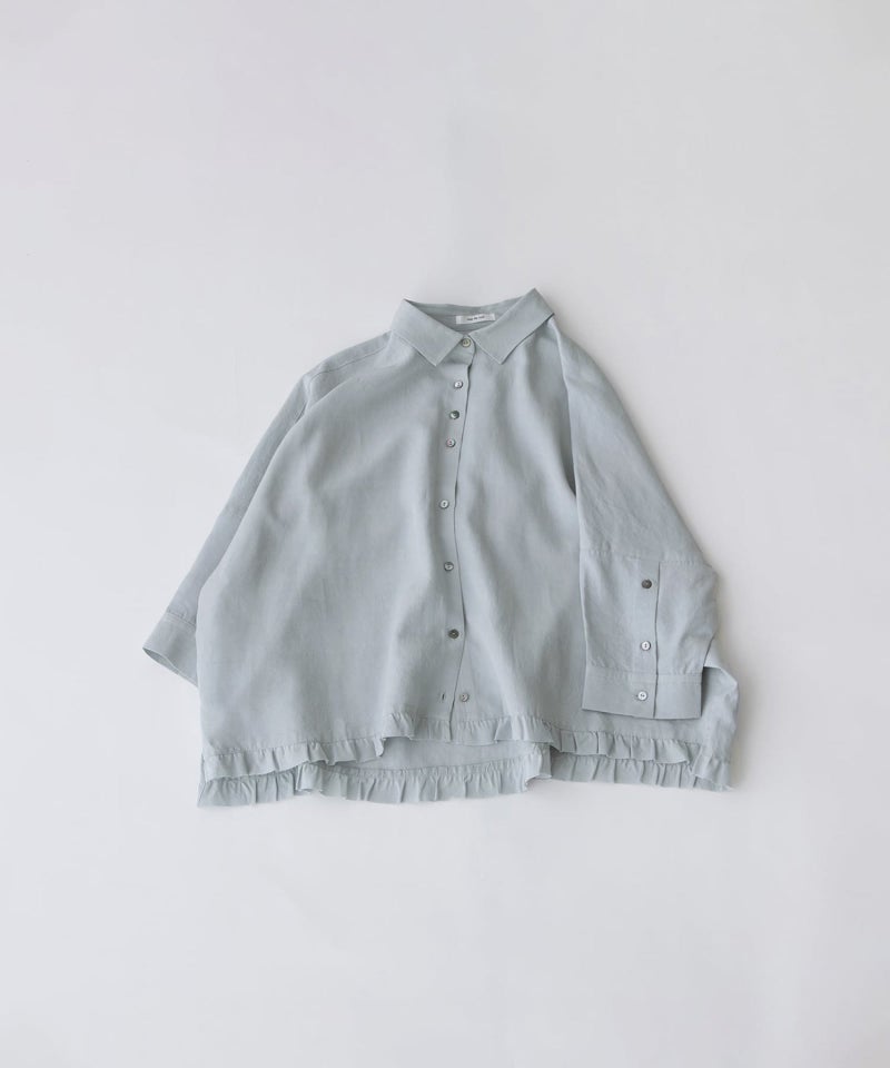 裾にフリルをあしらったクロップドシャツ。しっかりと厚みのあるリネンレーヨン素材を使用し、存在感があり、羽織としても使える一枚です。ワイドなスクエアシルエットで、サイドが自然に垂れるこなれたフォルム。短め丈ながらバランスがよく、人気のシルエットに仕上げました。上部のみボタン間隔を狭くしたデザインがアクセントです。開けた時にちらりと見える配色ステッチもさりげないポイントです。