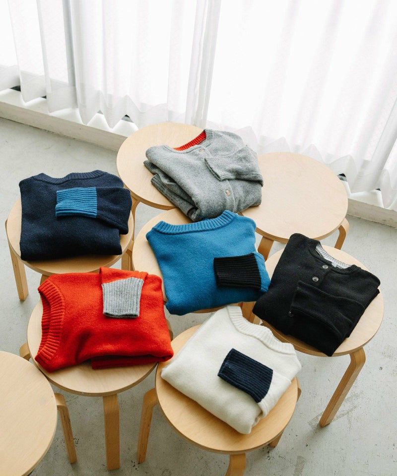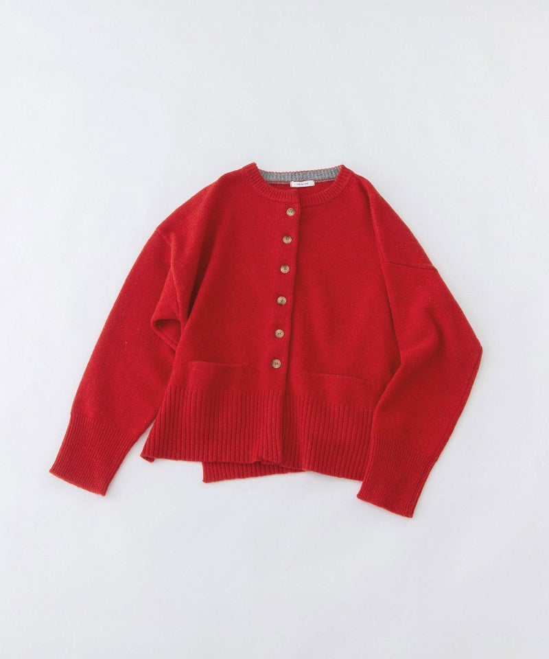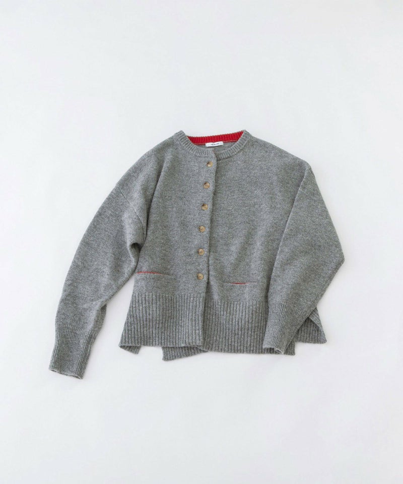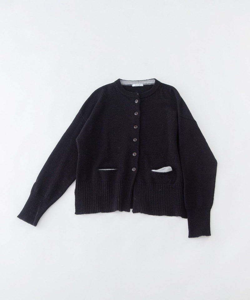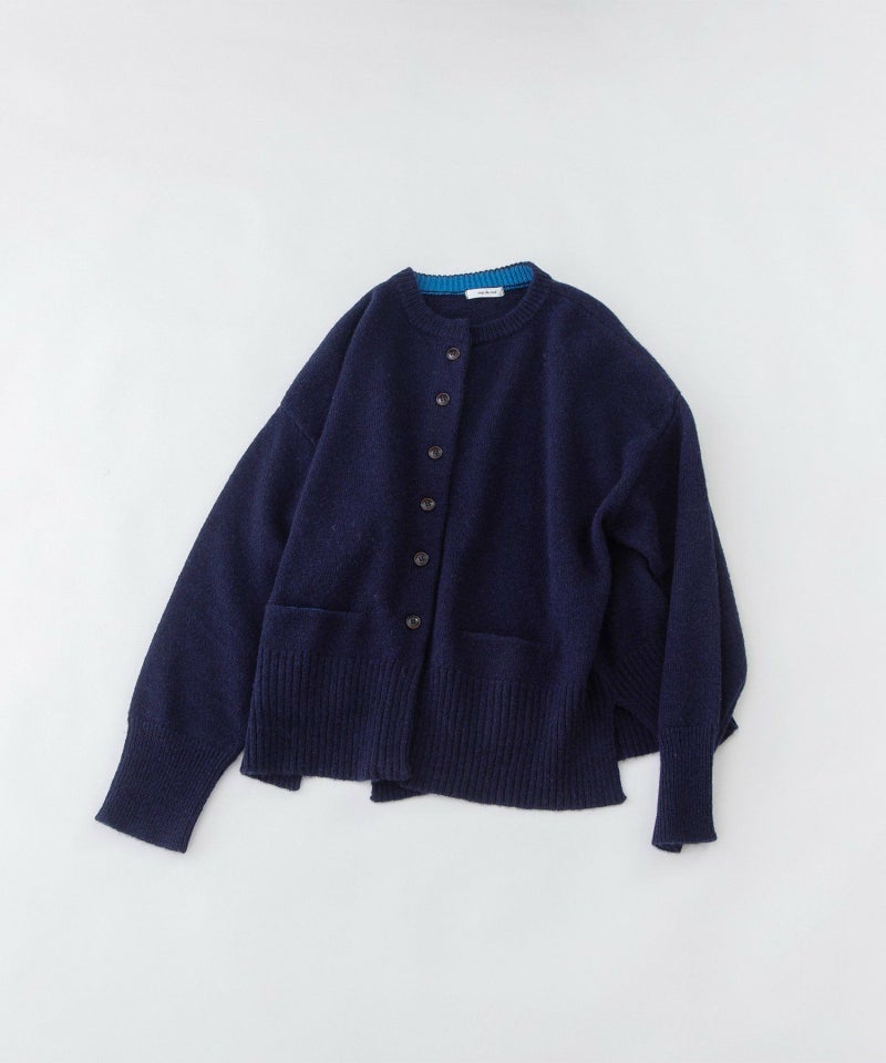 やわらかくふっくらとしたラムウールを使用したカーディガン。薄すぎず厚すぎず、程よい肉感の7ゲージニット。ゆったりとしたシルエットにドロップショルダー、裾の幅広のリブ編みがアクセントになっています。ちらりと見えるポケットの袋布が配色でポイントに。裾リブの絞りは少なく、ストンと着ていただけます。