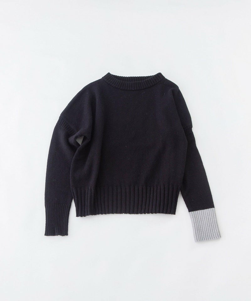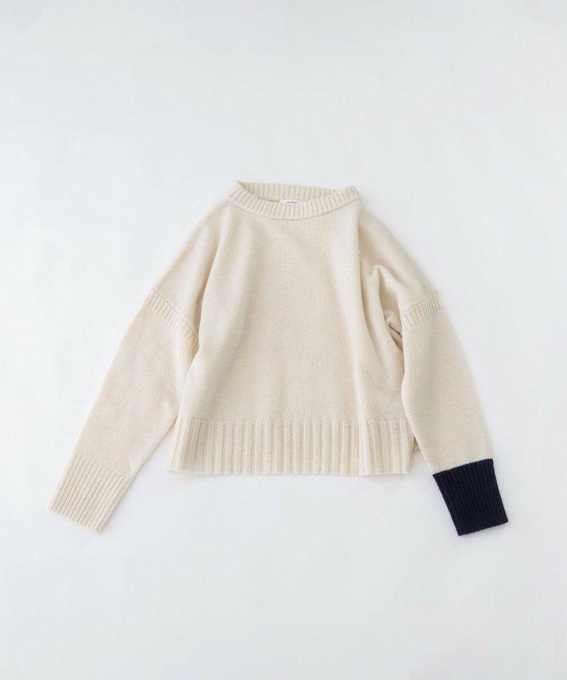 やわらかくふっくらとしたラムウールを使用したトップス。薄すぎず厚すぎず、程よい肉感の7ゲージニット。ゆったりシルエットで着回しの効くシンプルなニットに、ガンジーセーター風のリブづかいをアクセントにしました。わずかに立つ襟と、ドロップしたショルダーのリブ、幅広の裾リブがポイントです。左袖リブのみ配色になっています。