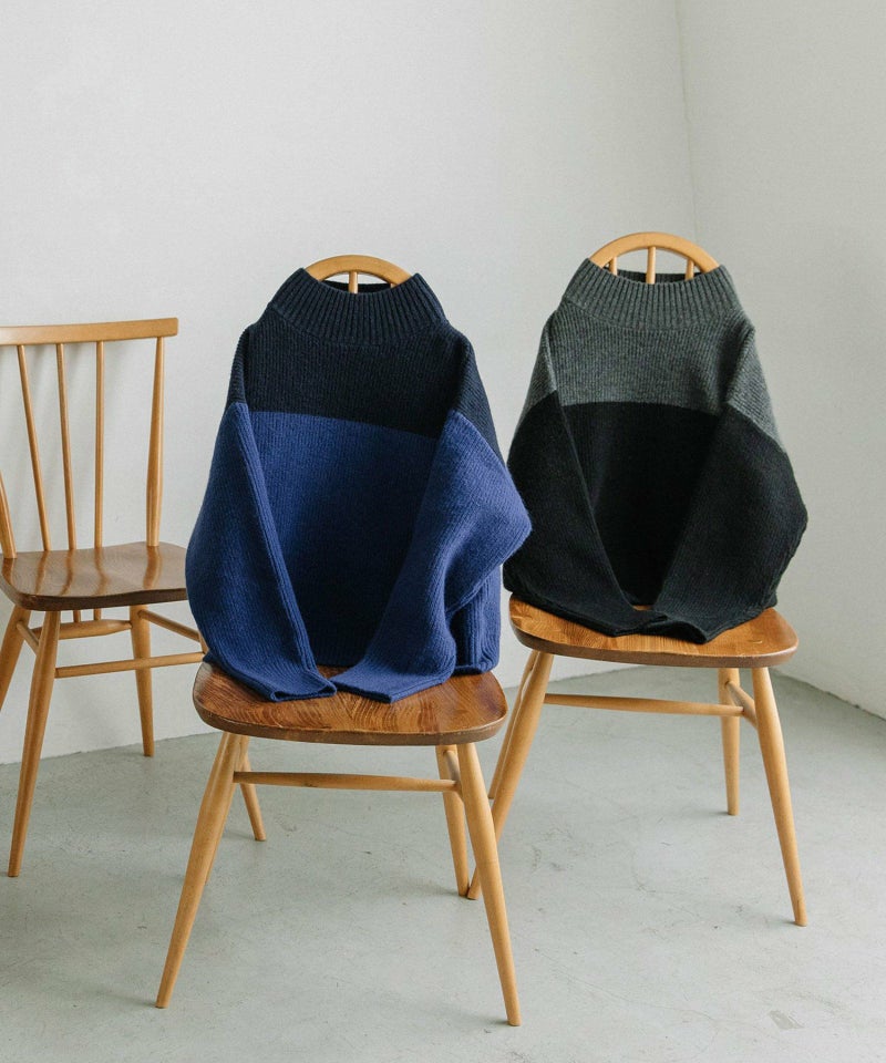 厚みがあり、柔らかくて暖かい片畦編みのバイカラーニット。ハイネックとヨークがさりげない同系色の配色になっています。長めのリブもアクセントを効かせています。