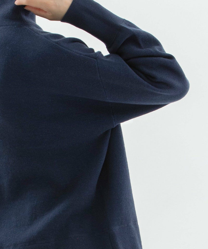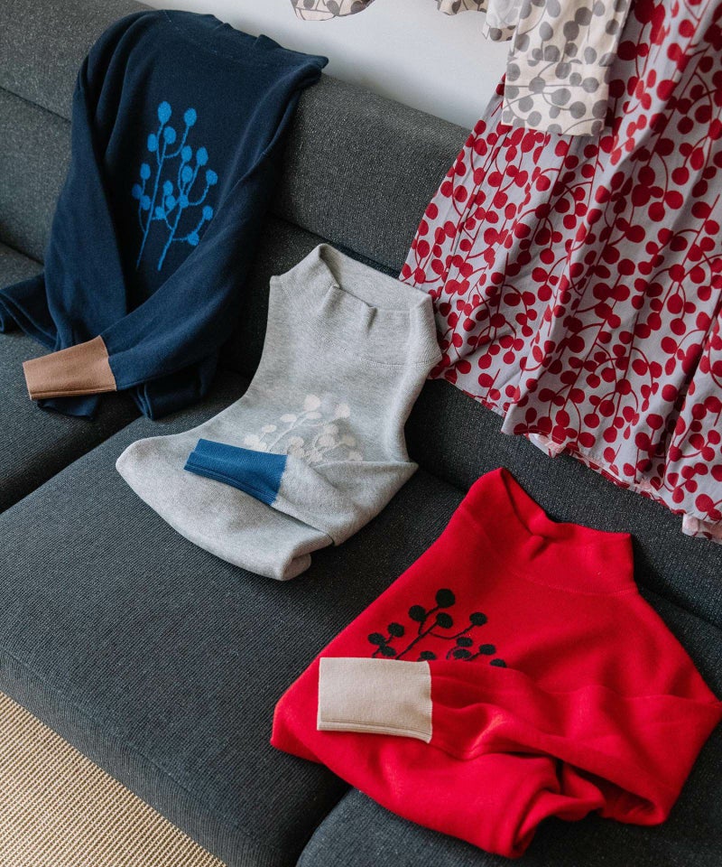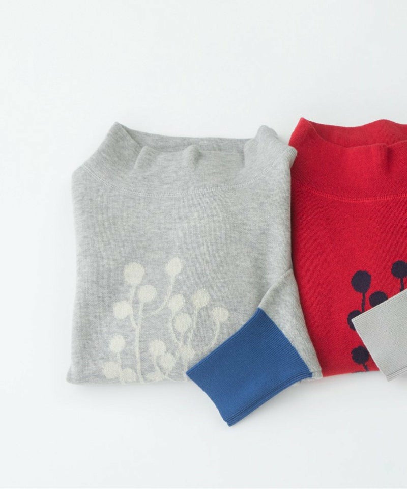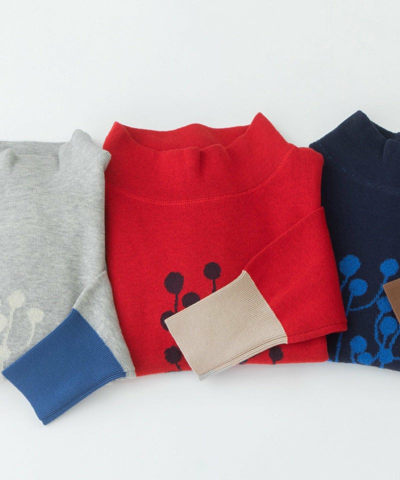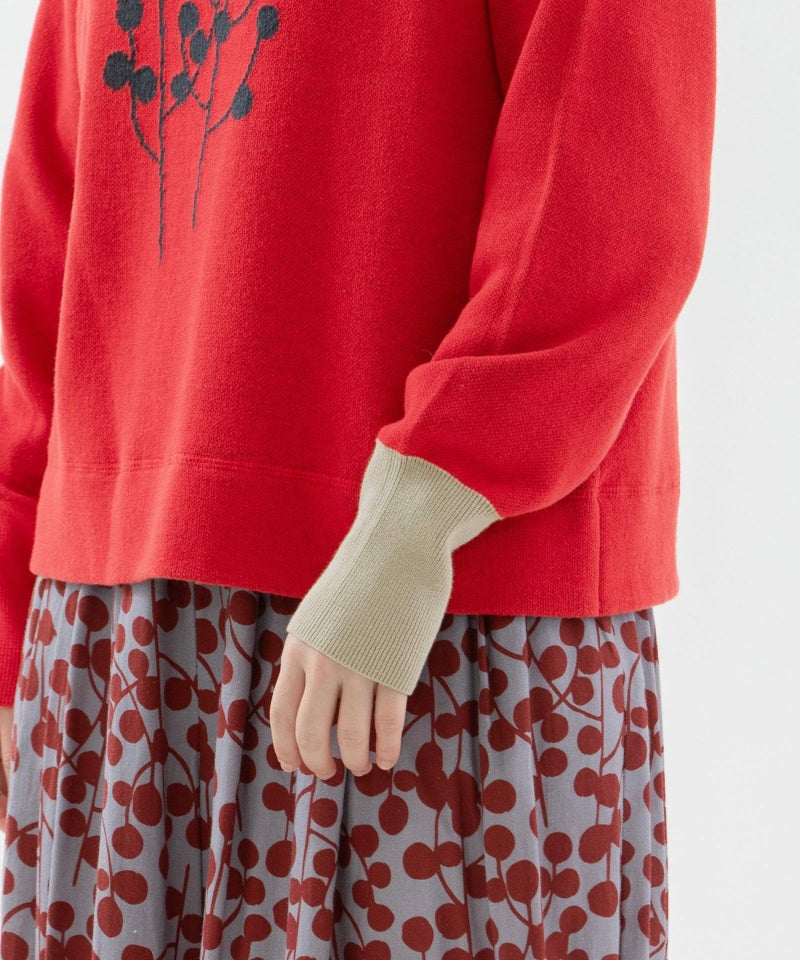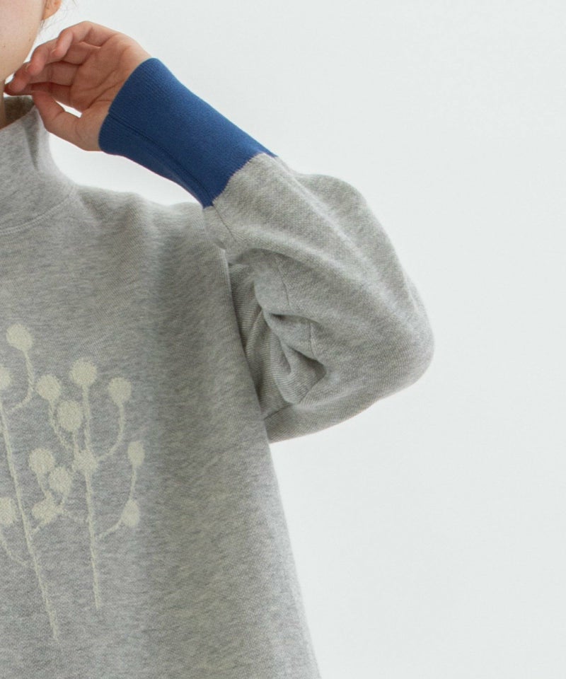 ユーカリモチーフの柄をフロントに入れたスエット風ニット。短めの丈でスカートにもパンツにも合わせやすいシルエットです。表側はコットン、裏側がキッドモヘア混のダブル編みで、起毛スエットのような暖かさがありながら春先まで長く着られるアイテムです。袖口はコットンのリブ編みで、左袖の配色もポイントになっています。