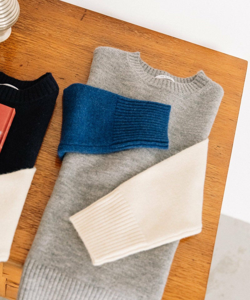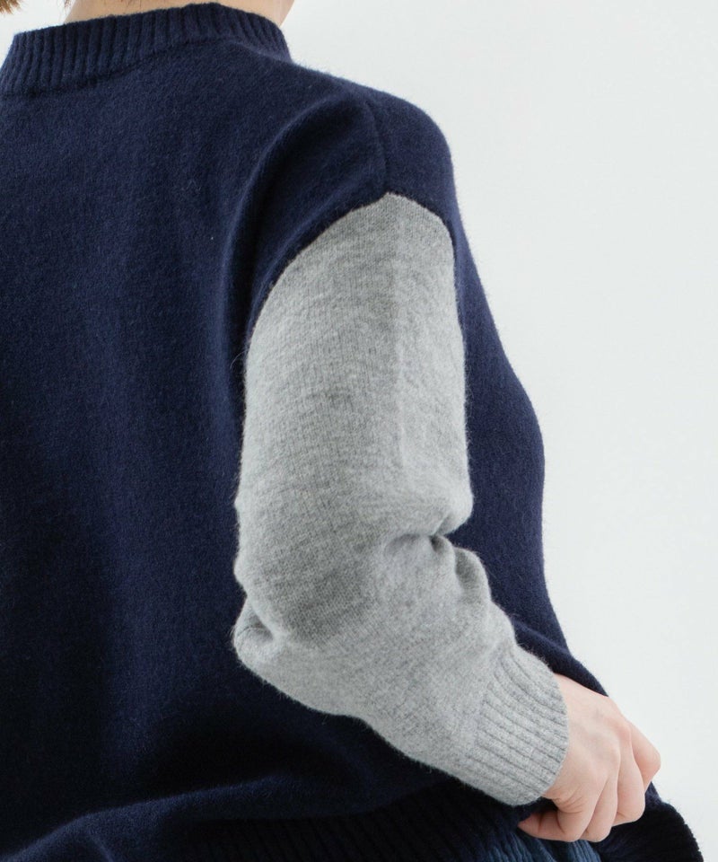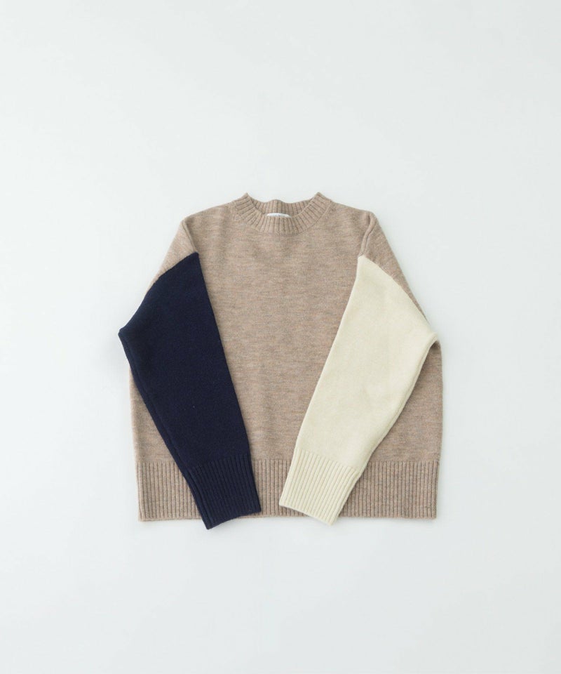 ほどよく厚みがあるざっくり天竺編みのクルーネックニット。両袖が配色づかいのシンプルで着回しのきく一枚です。