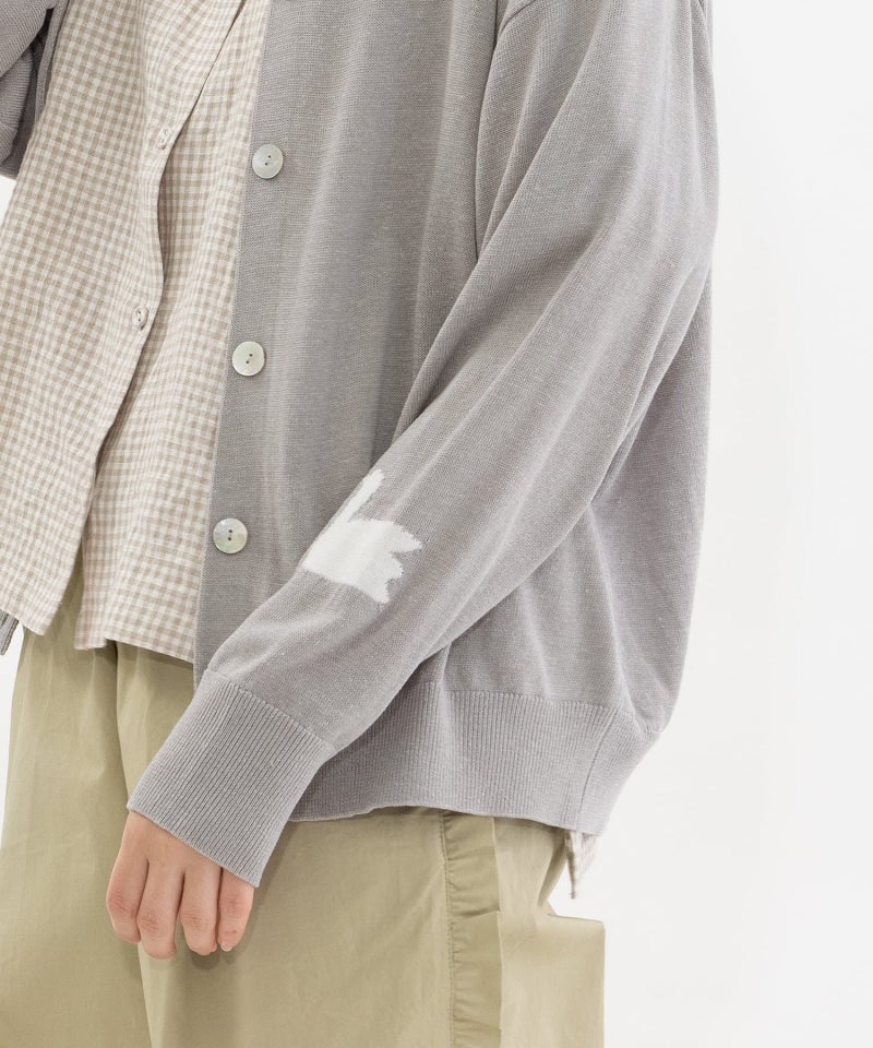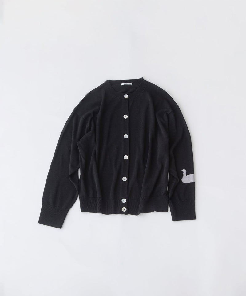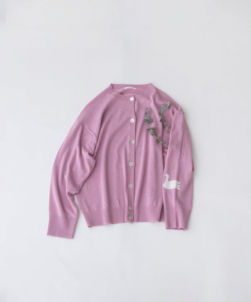 麻混の糸を使用し、シャリ感と清涼感のある着心地に仕上げたクルーネックカーディガン。太めの衿とゆったりとした袖のシンプルなデザインに、左袖のスワンインターシャがアクセント。カーディガンとしてはもちろん、前を留めてトップス風の着こなしも楽しめます。釦には上品なアコヤ貝を使用しています。